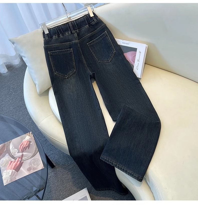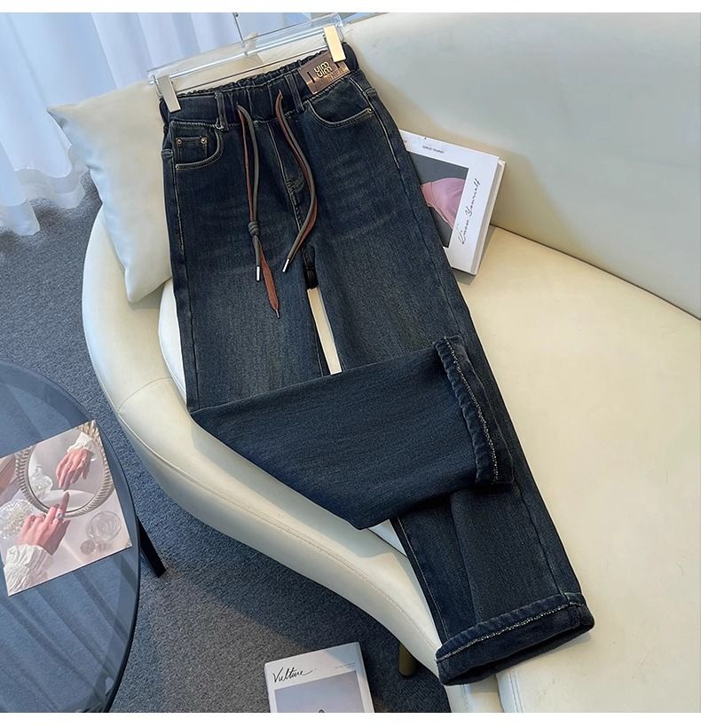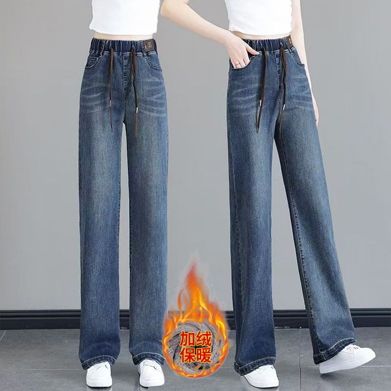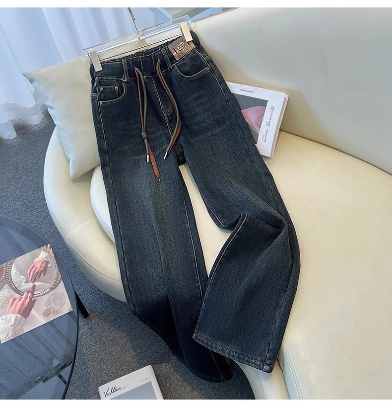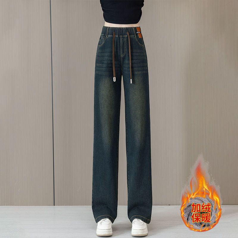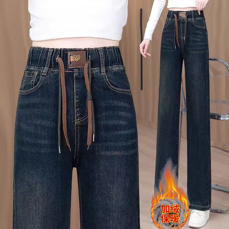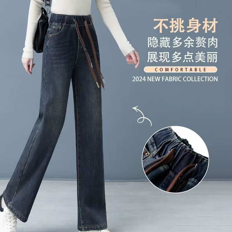 2024加绒加厚松紧高腰牛仔裤春秋新款复古宽松显瘦版直筒裤