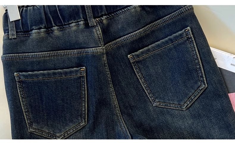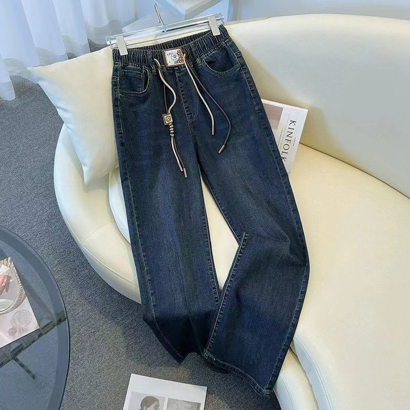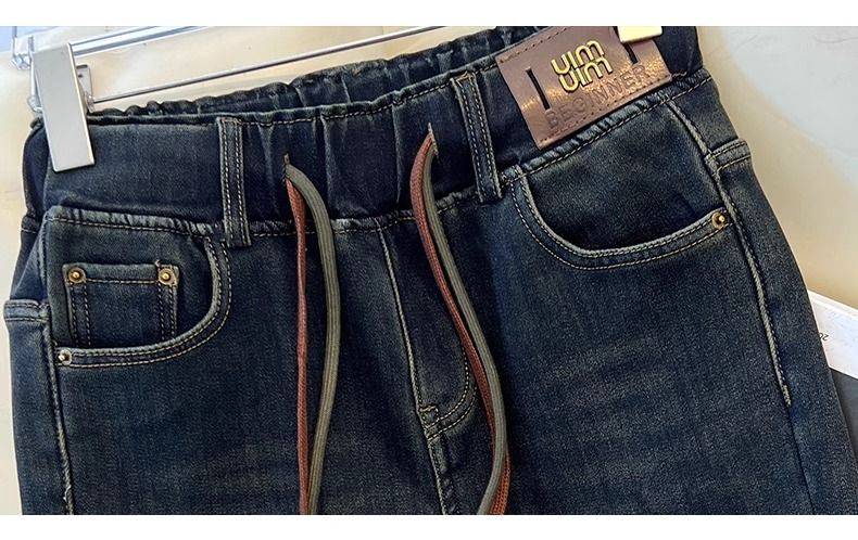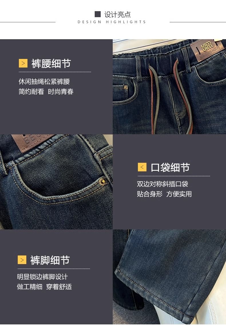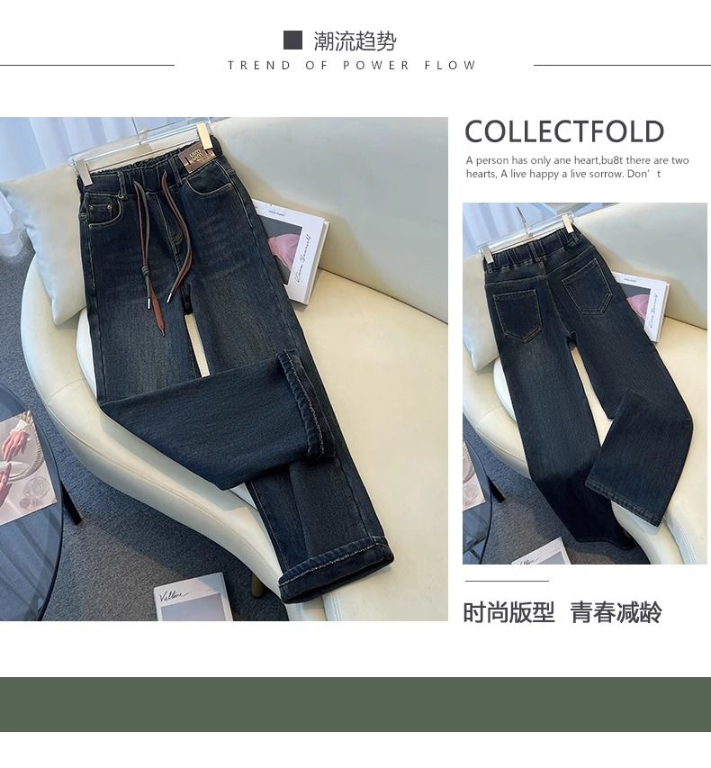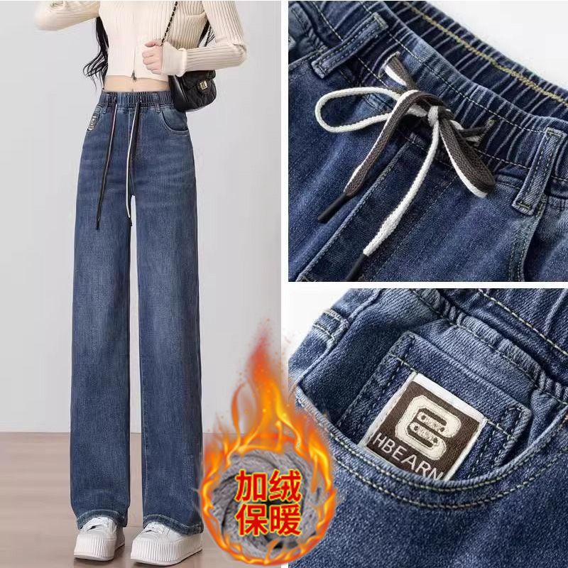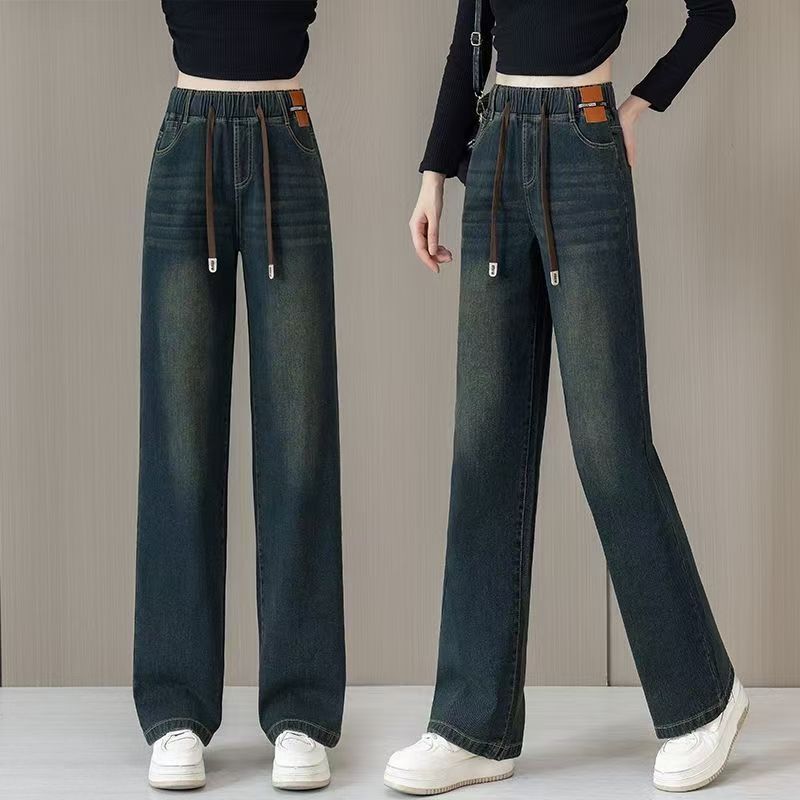 2024加绒加厚松紧高腰牛仔裤春秋新款复古宽松显瘦版直筒裤