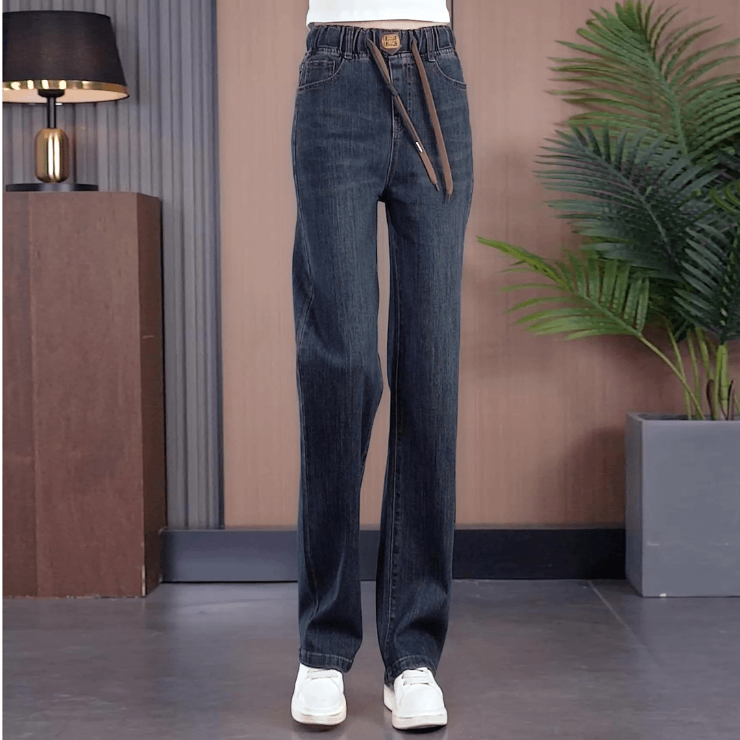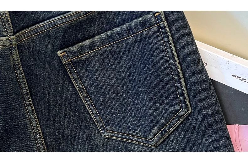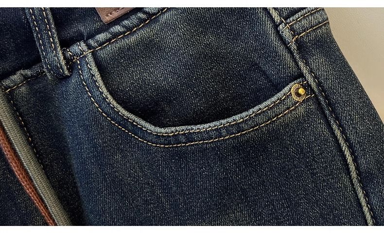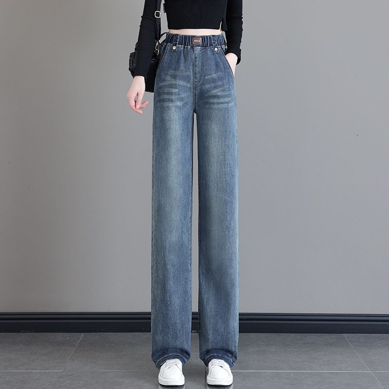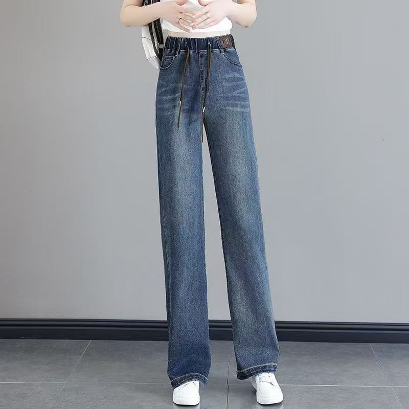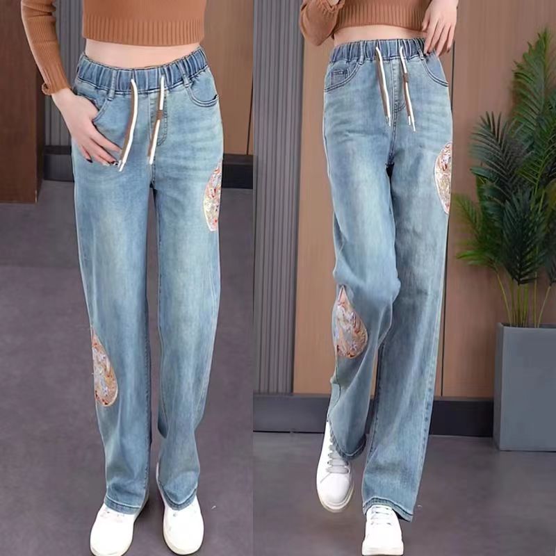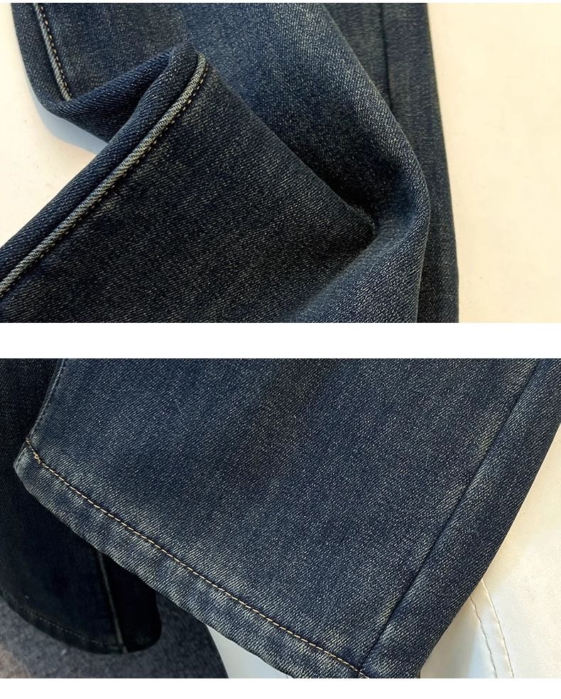 2024加绒加厚松紧高腰牛仔裤春秋新款复古宽松显瘦版直筒裤
