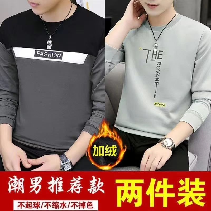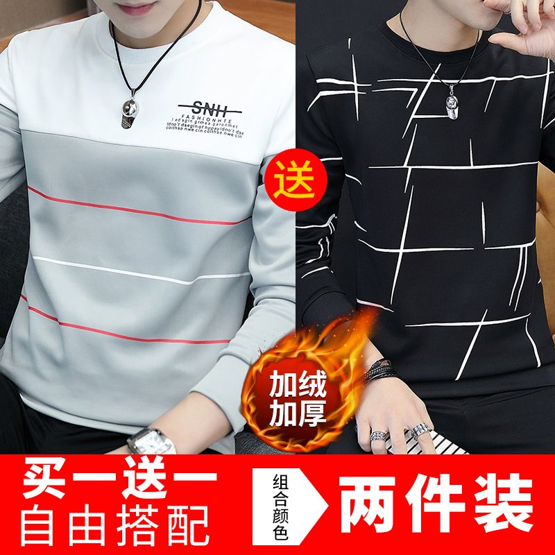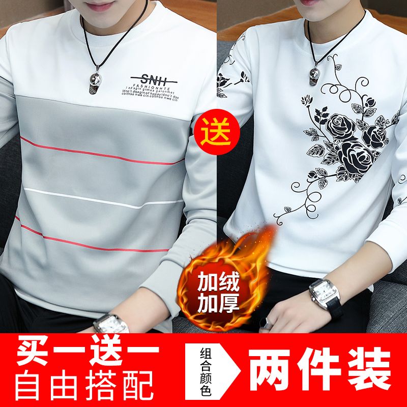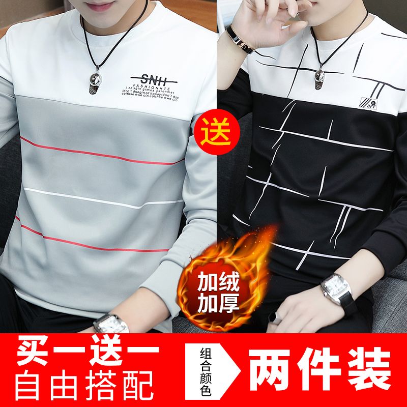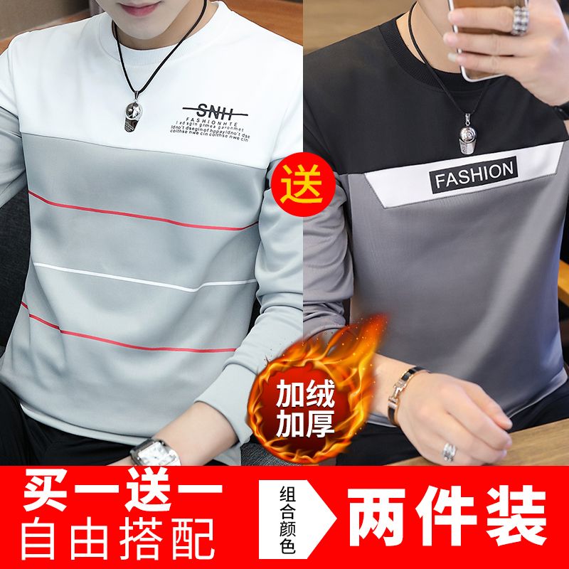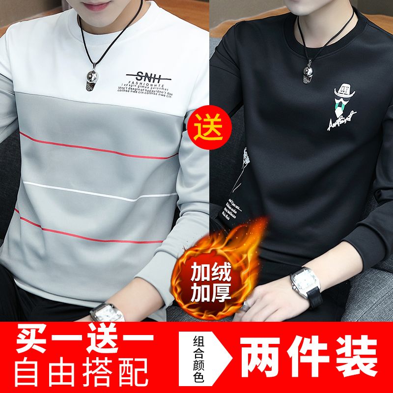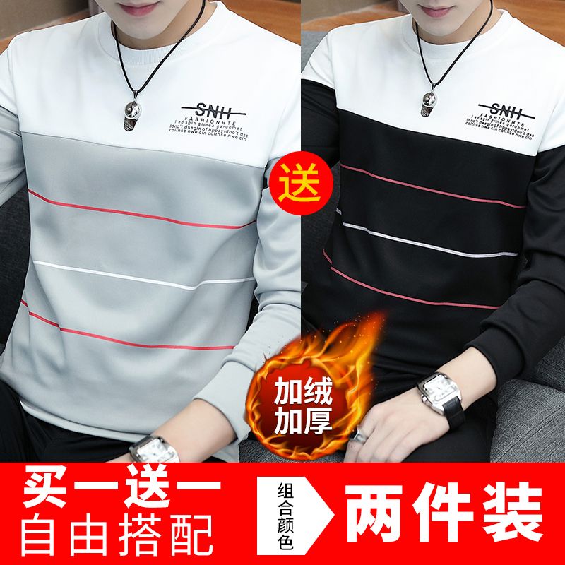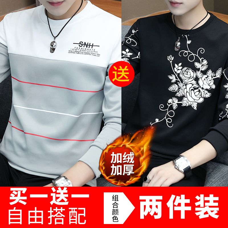 秋冬季男士长袖t恤加绒加厚保暖卫衣男小衫上衣服针织打底衫秋装