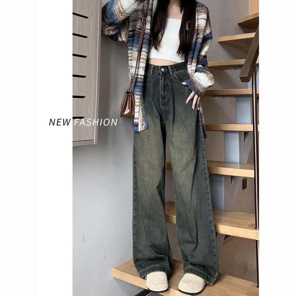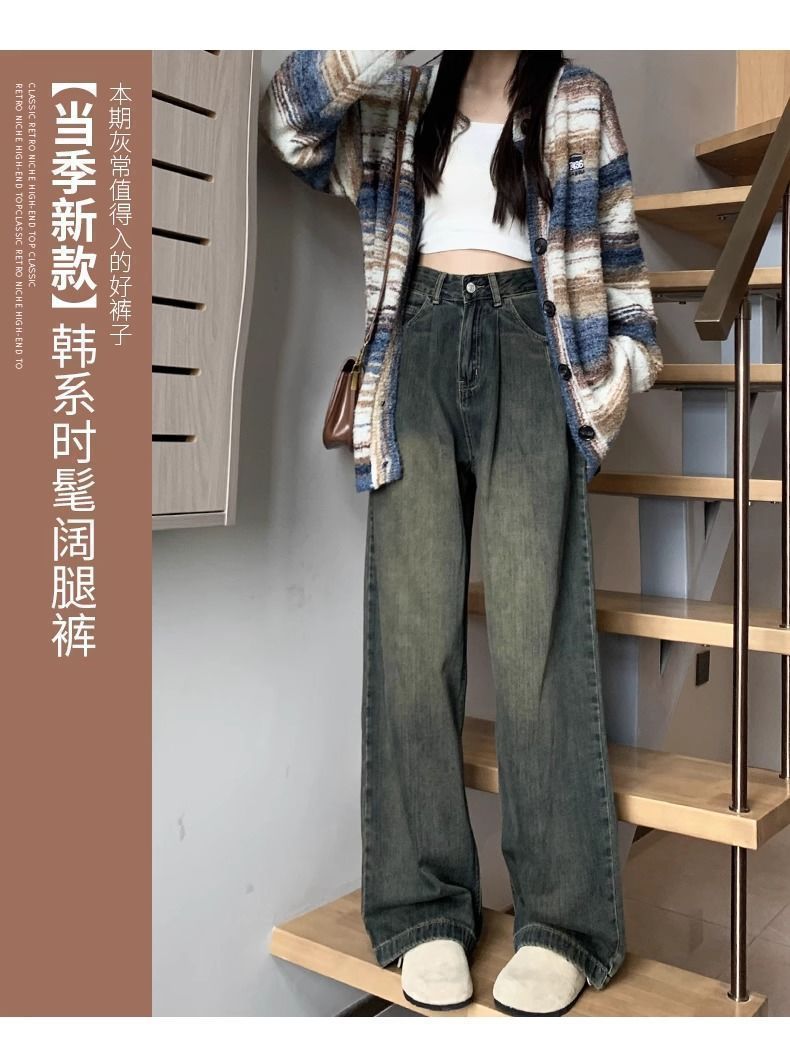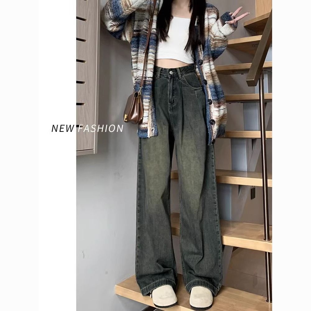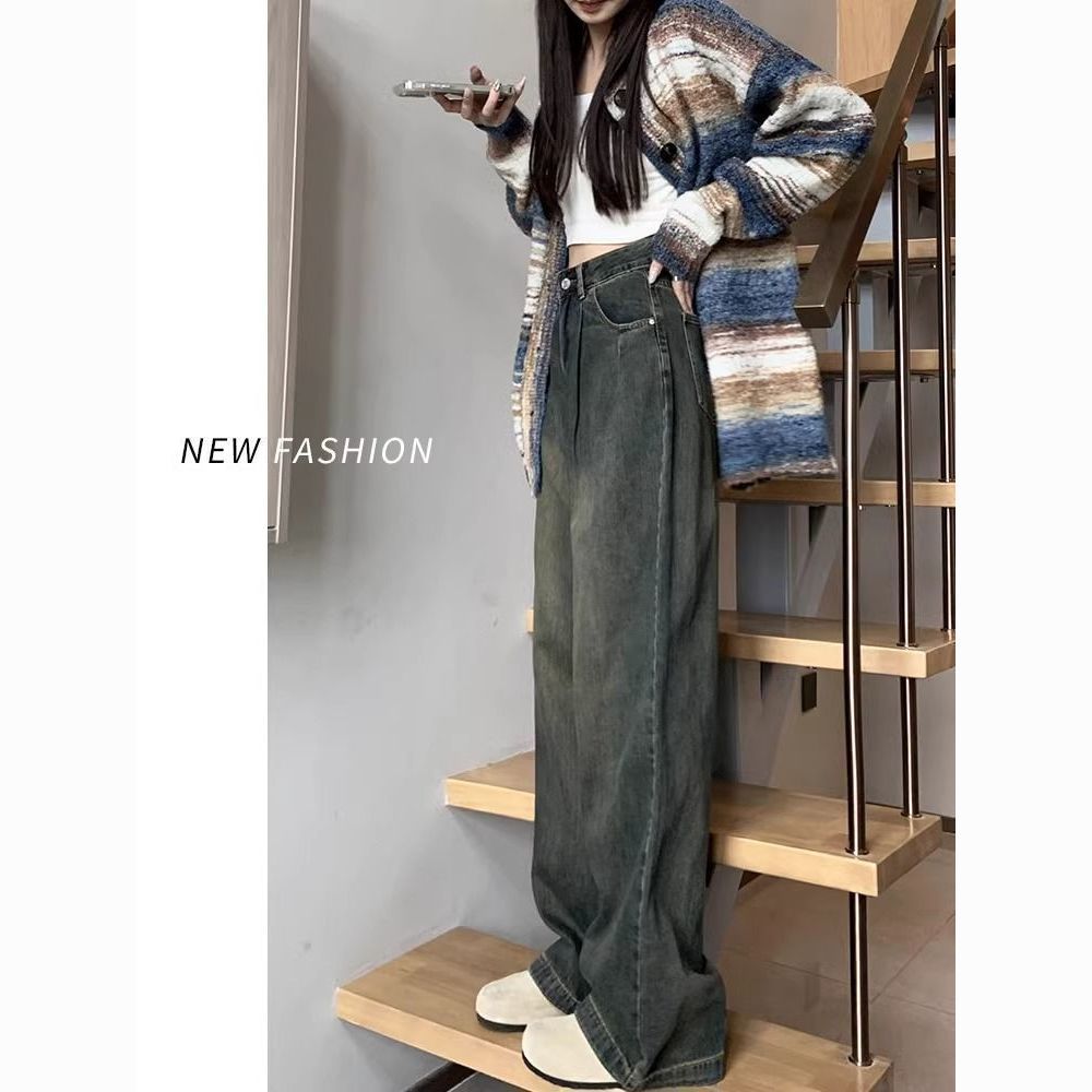 水泥灰复古阔腿牛仔裤女秋季新款高腰宽松显瘦直筒垂感拖地裤ins