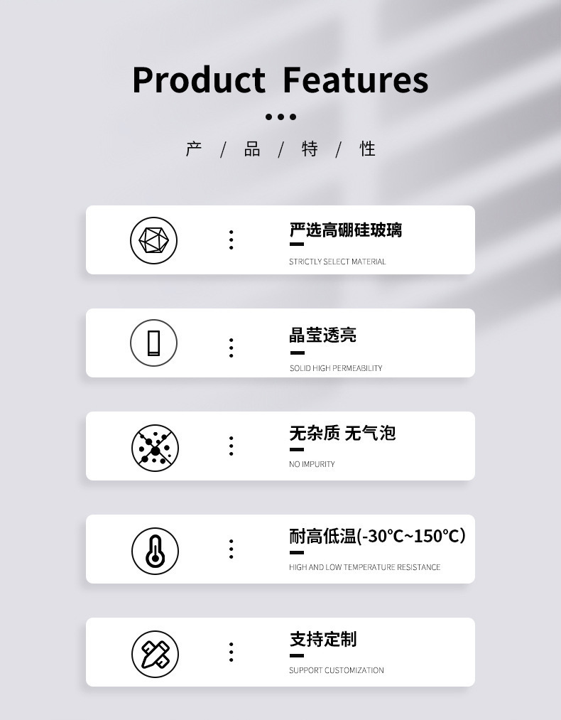 特点:耐高温 壁厚均匀 无气泡流线 透明度好