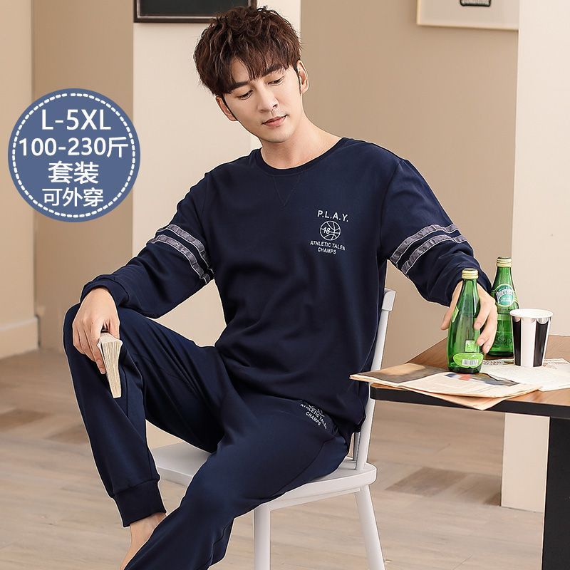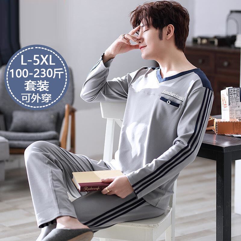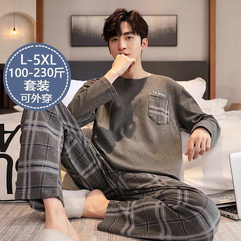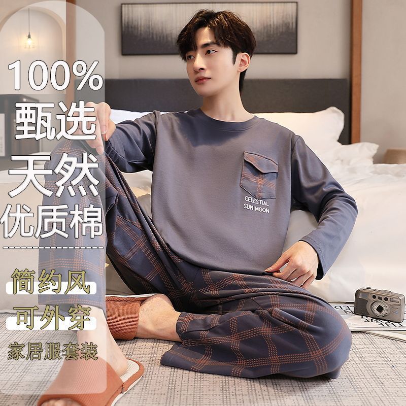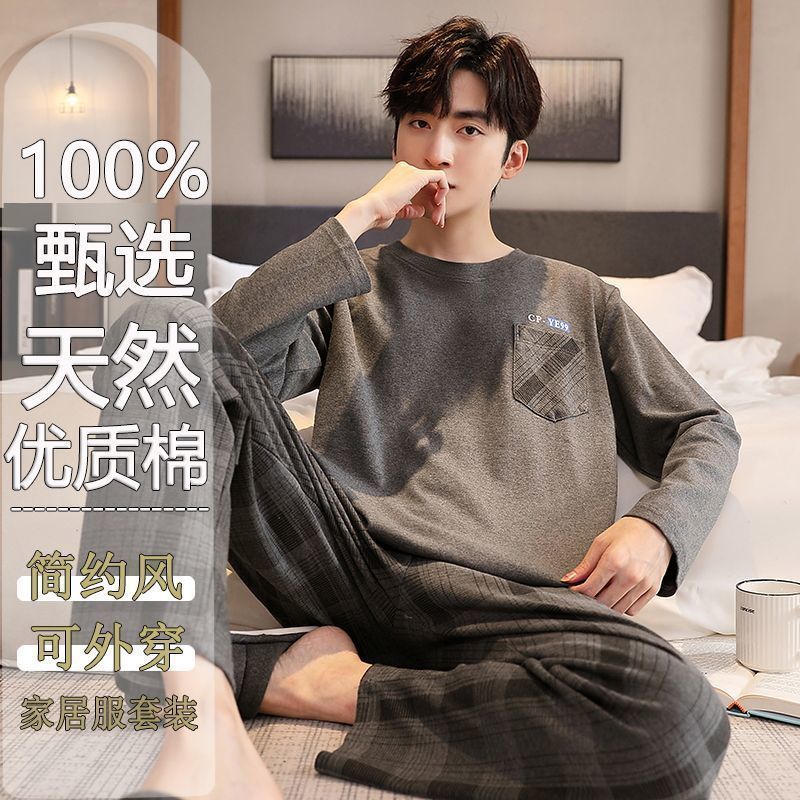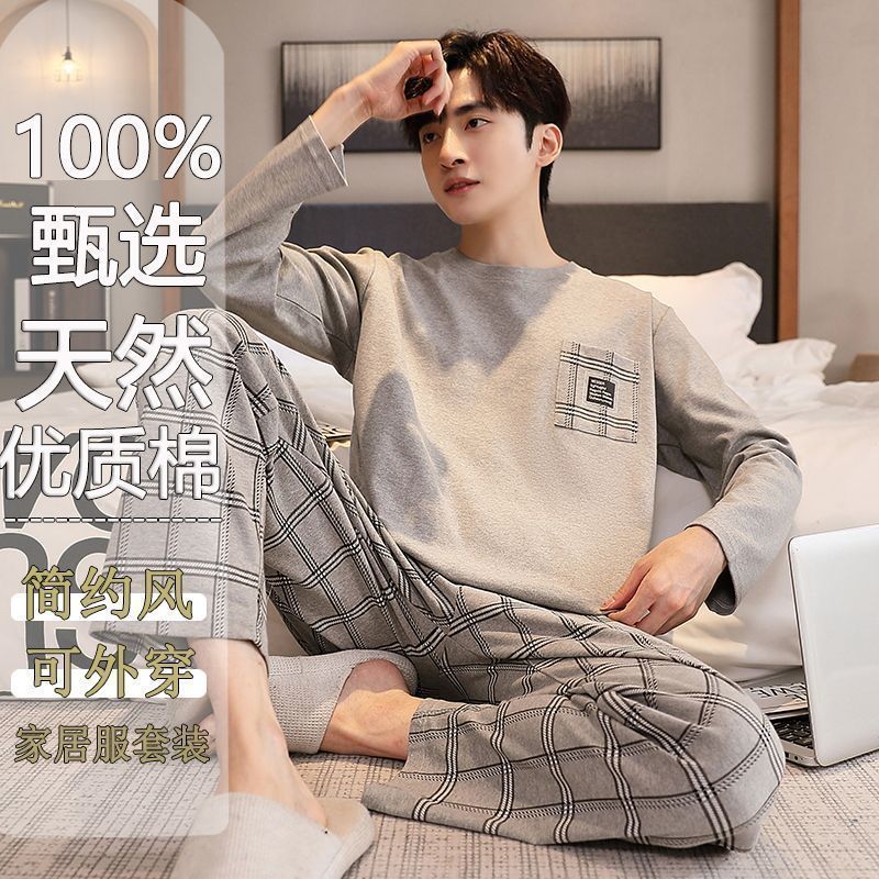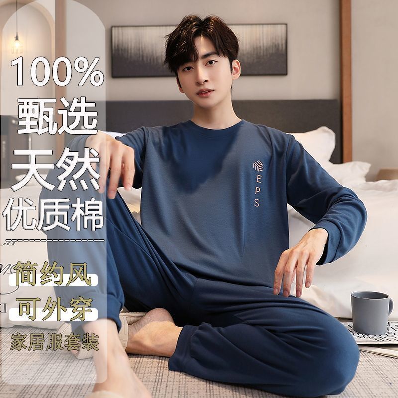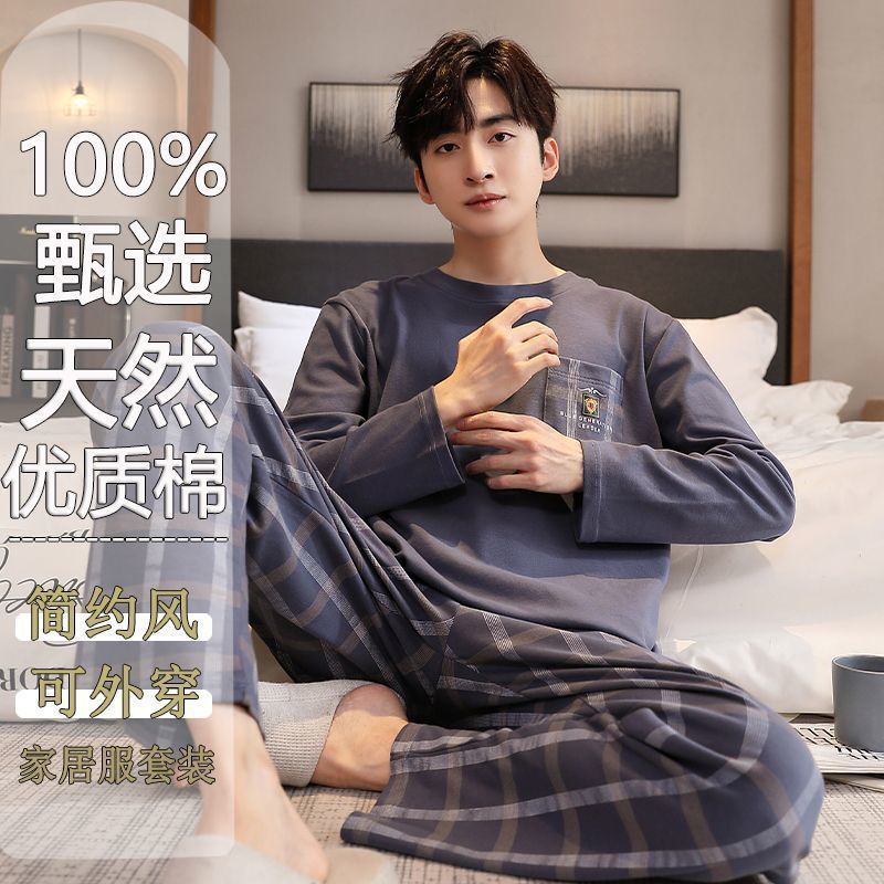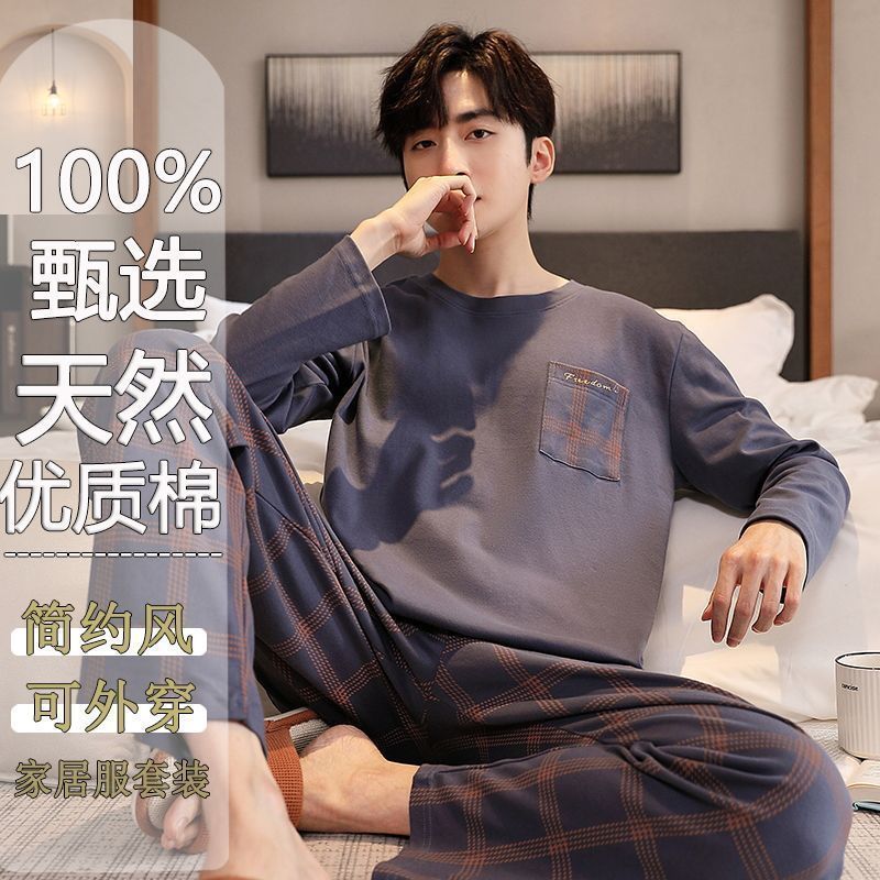 100%双面棉男士睡衣春秋款长袖纯棉青年大码可外穿宽松家居服套装