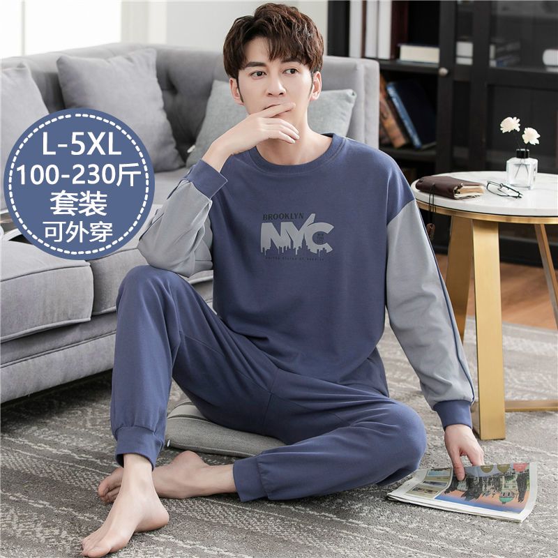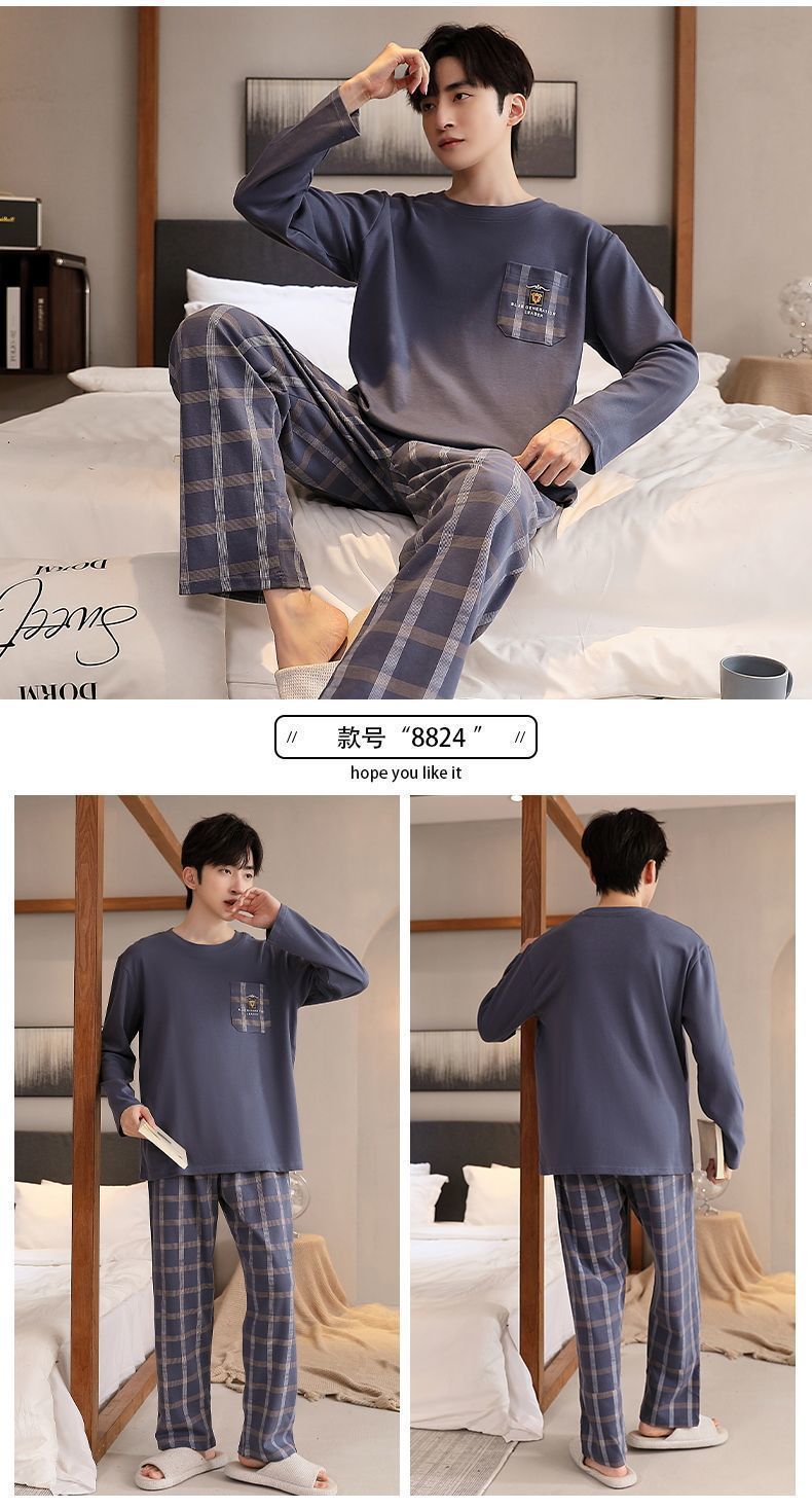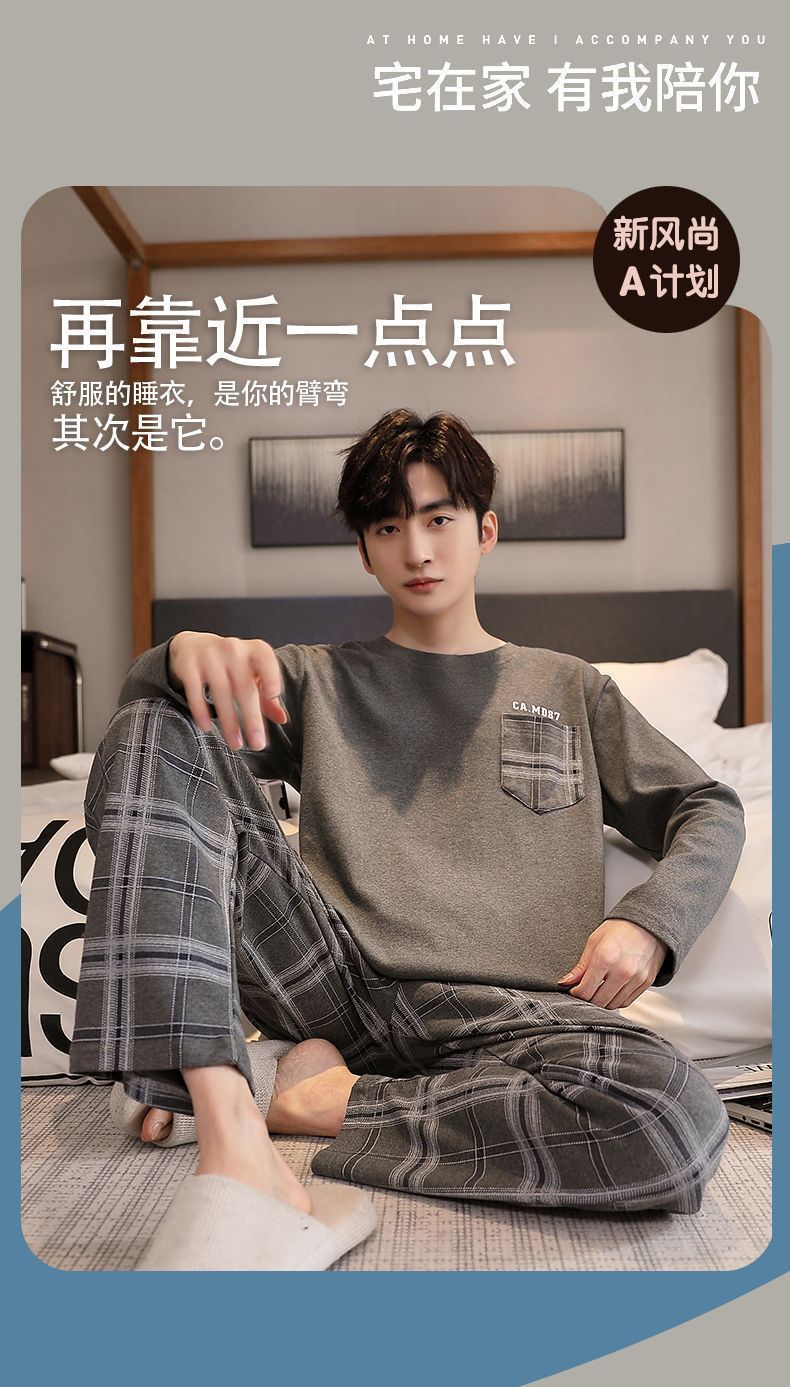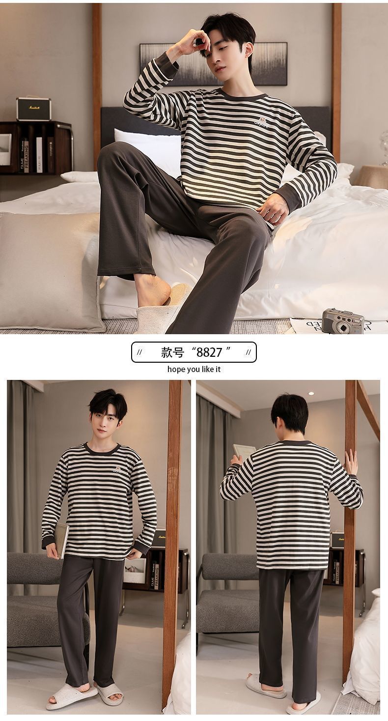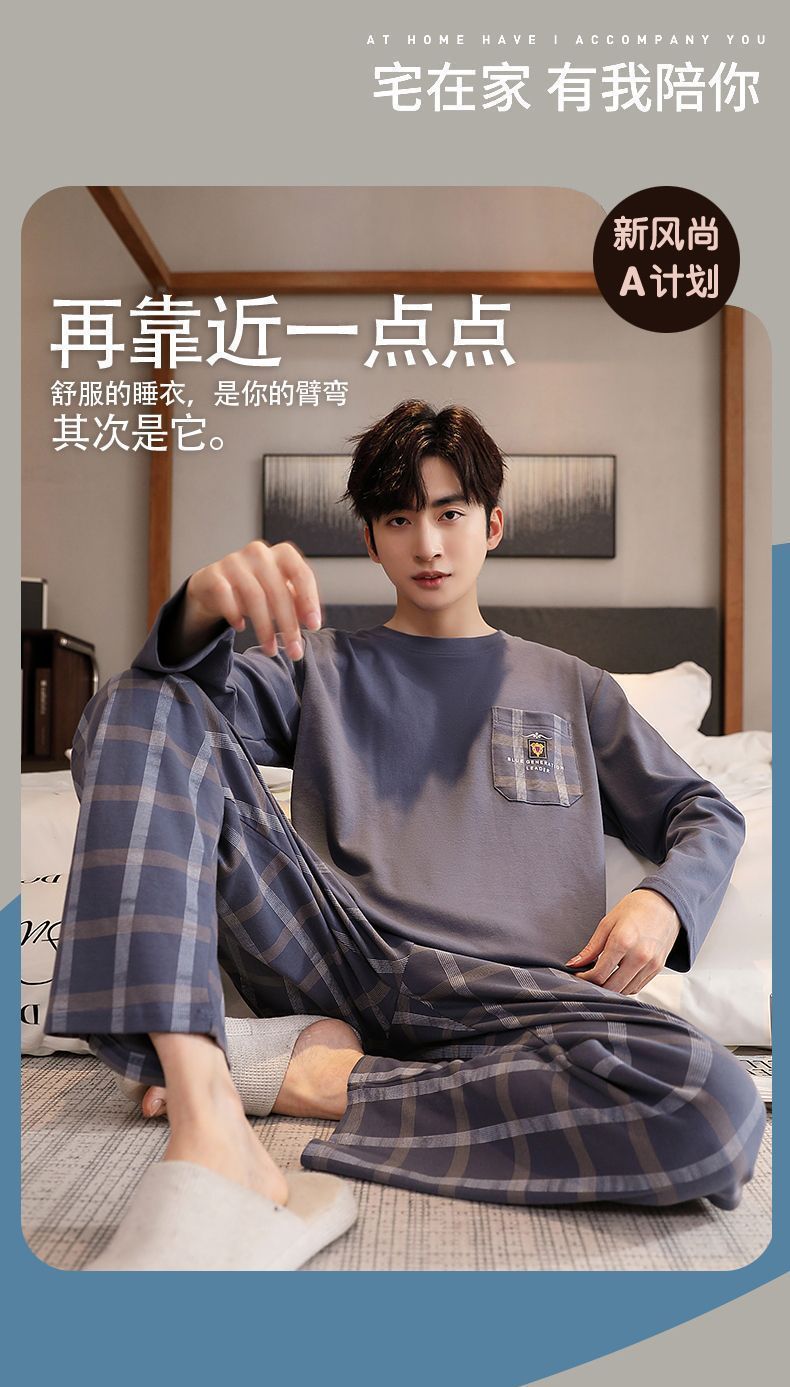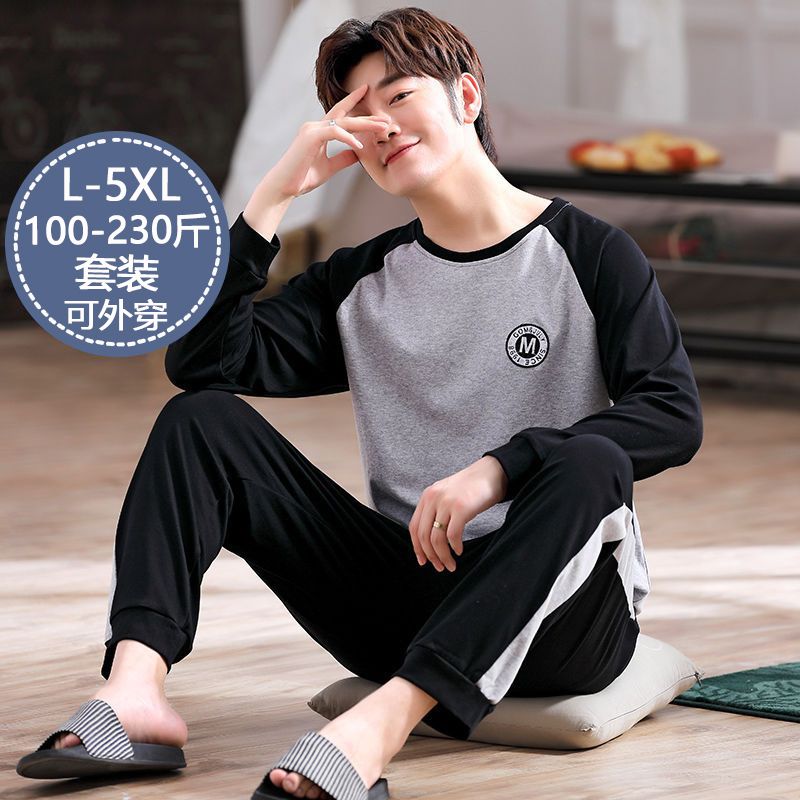 100%双面棉男士睡衣春秋款长袖纯棉青年大码可外穿宽松家居服套装
