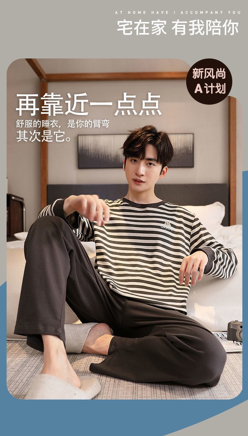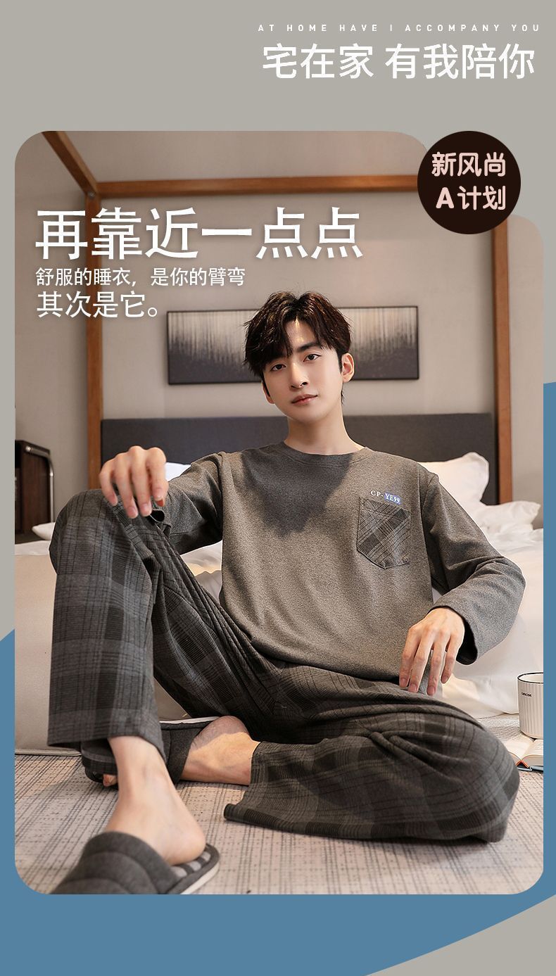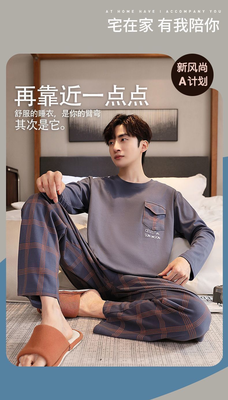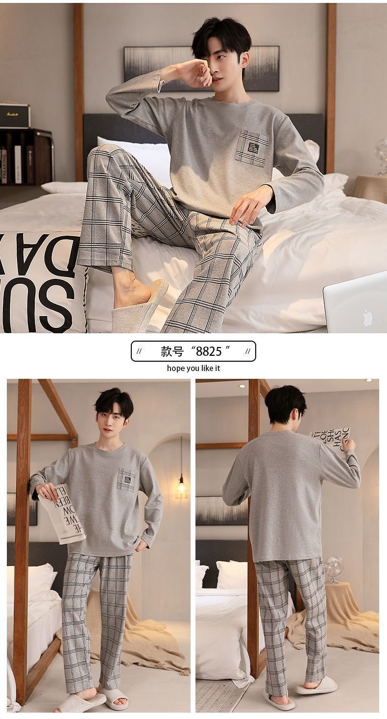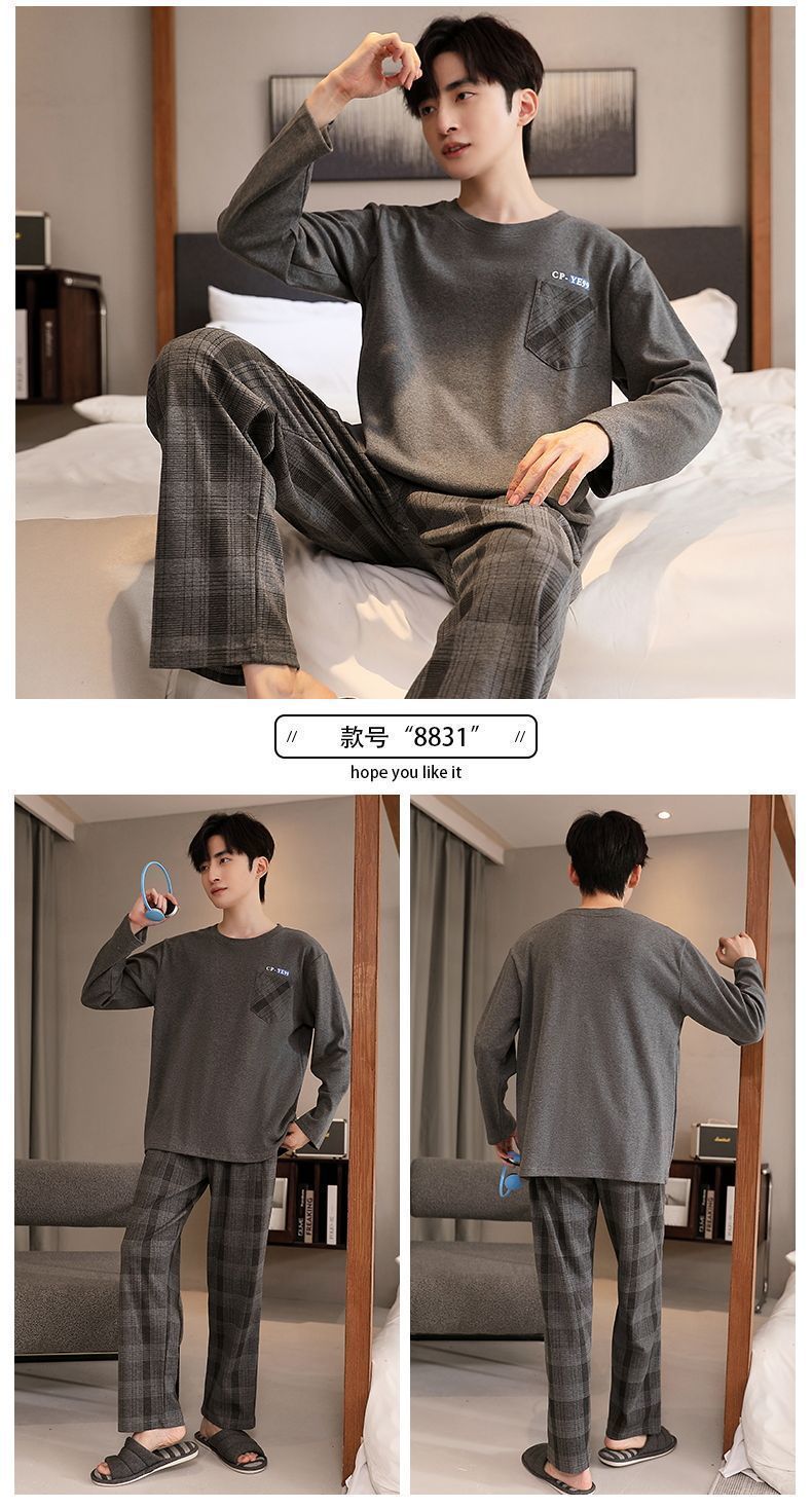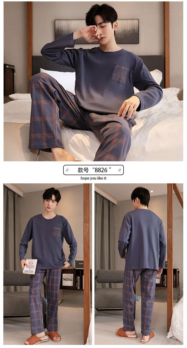 100%双面棉男士睡衣春秋款长袖纯棉青年大码可外穿宽松家居服套装