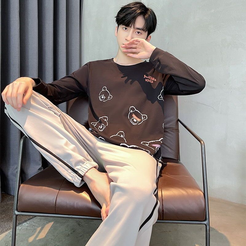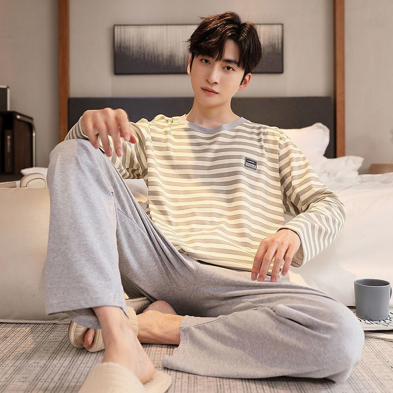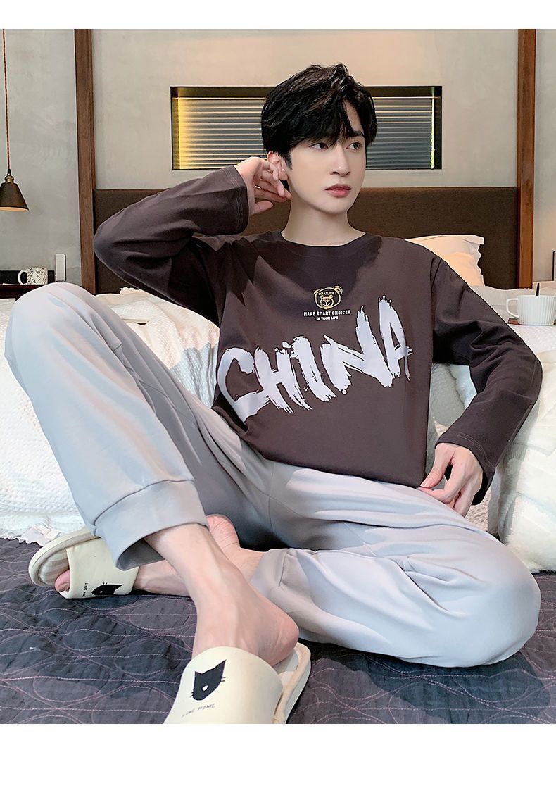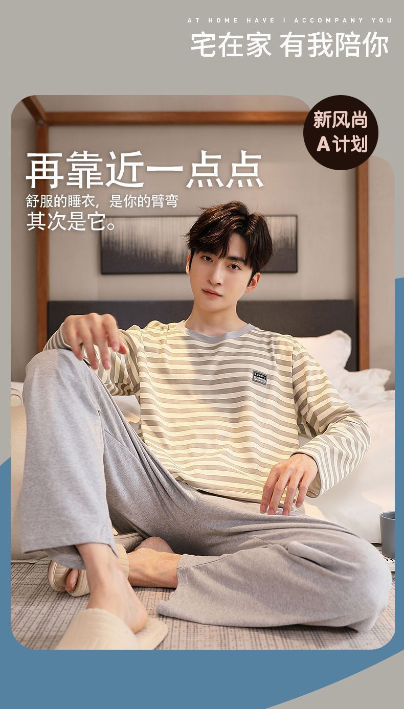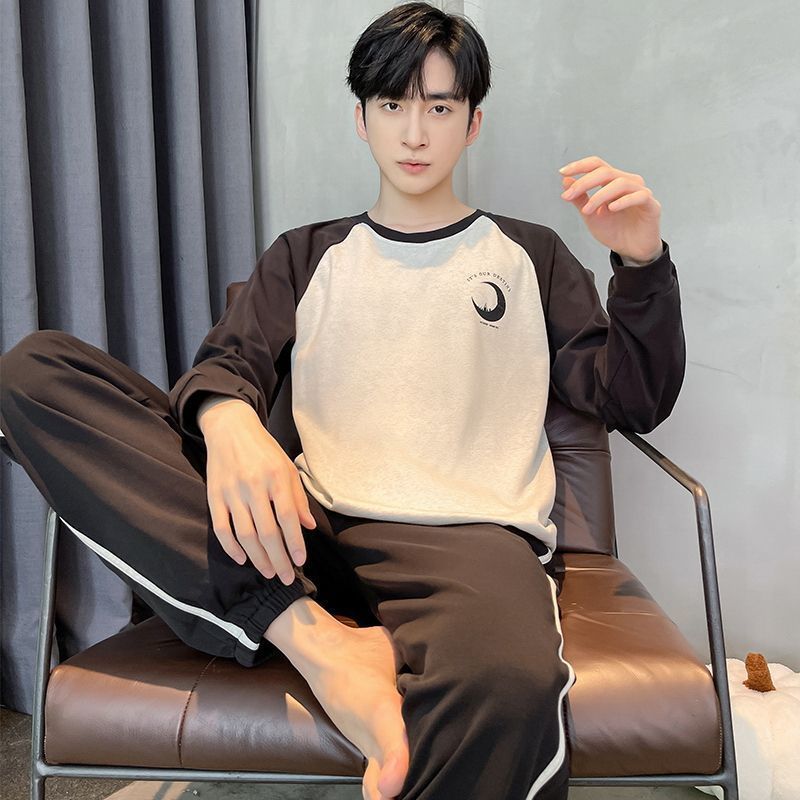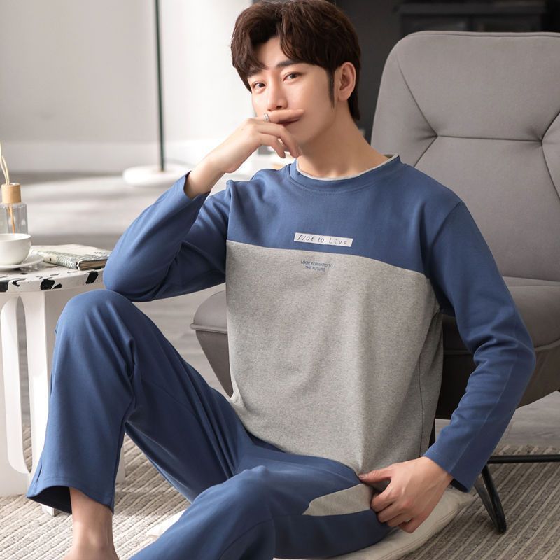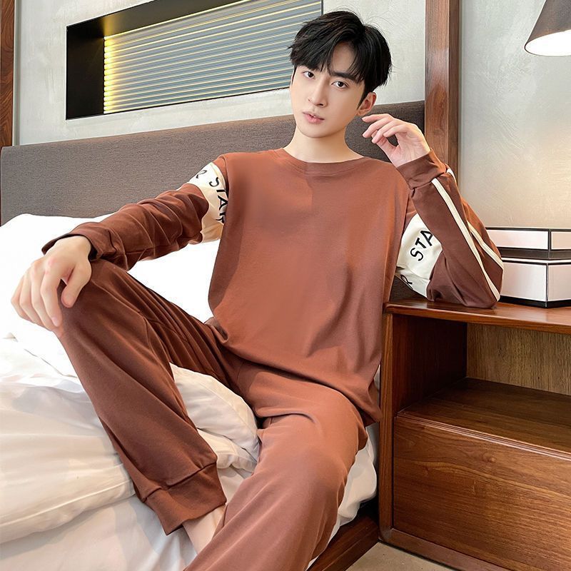 100%双面棉男士睡衣春秋款长袖纯棉青年大码可外穿宽松家居服套装
