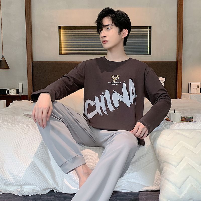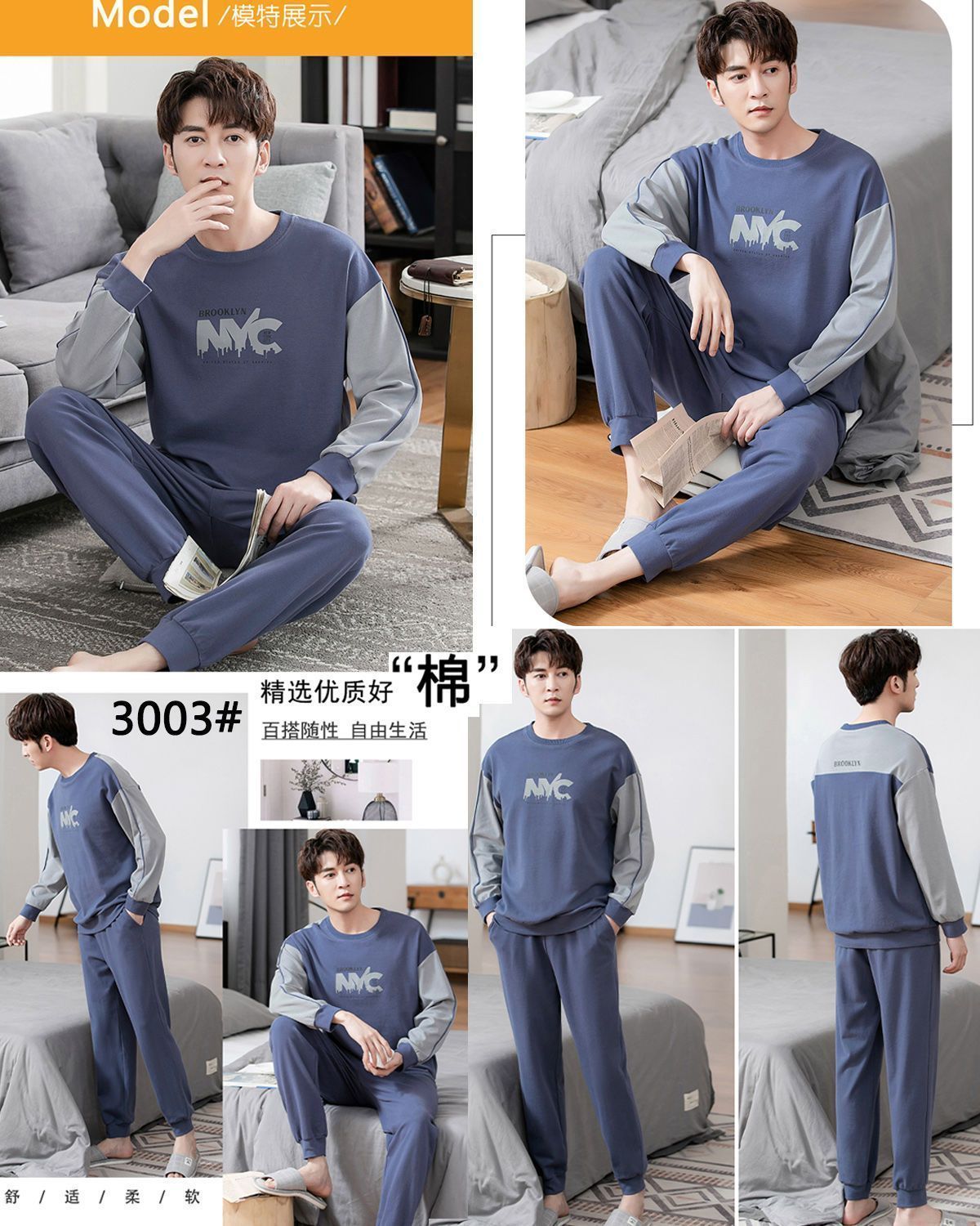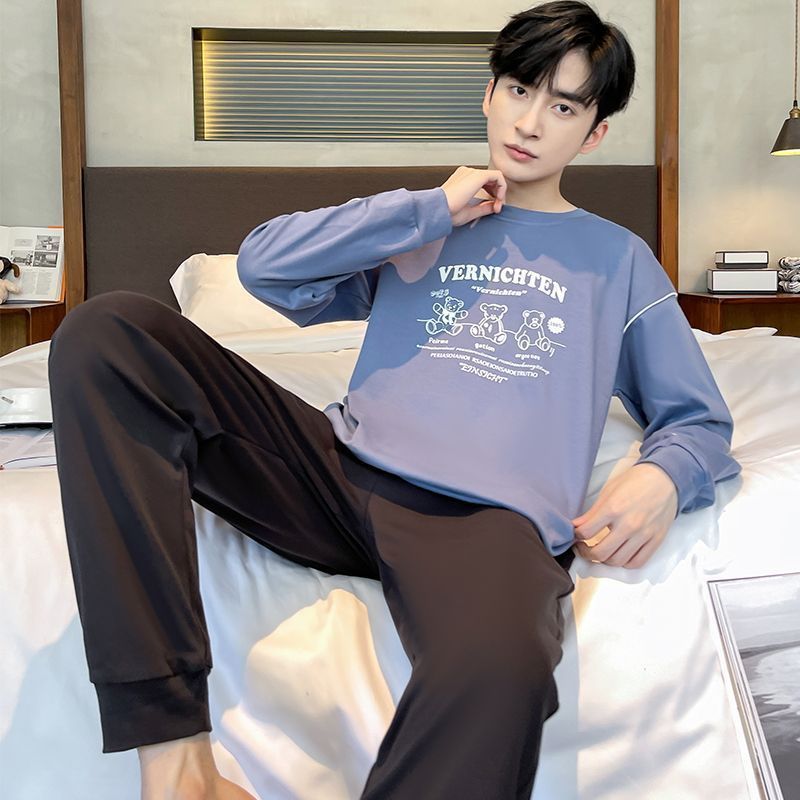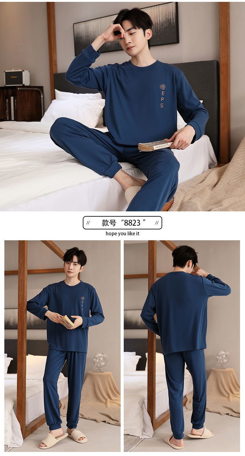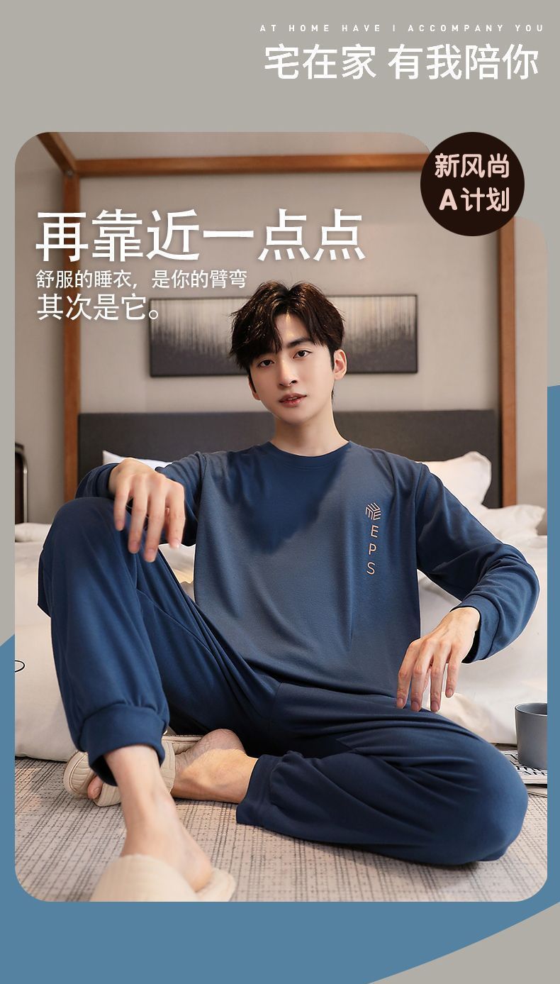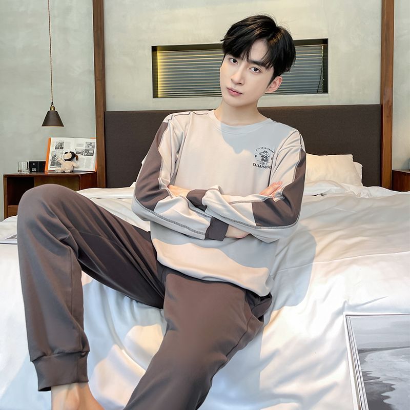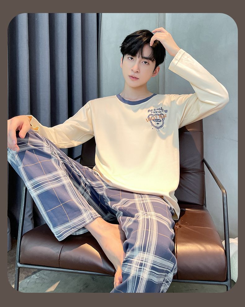 100%双面棉男士睡衣春秋款长袖纯棉青年大码可外穿宽松家居服套装