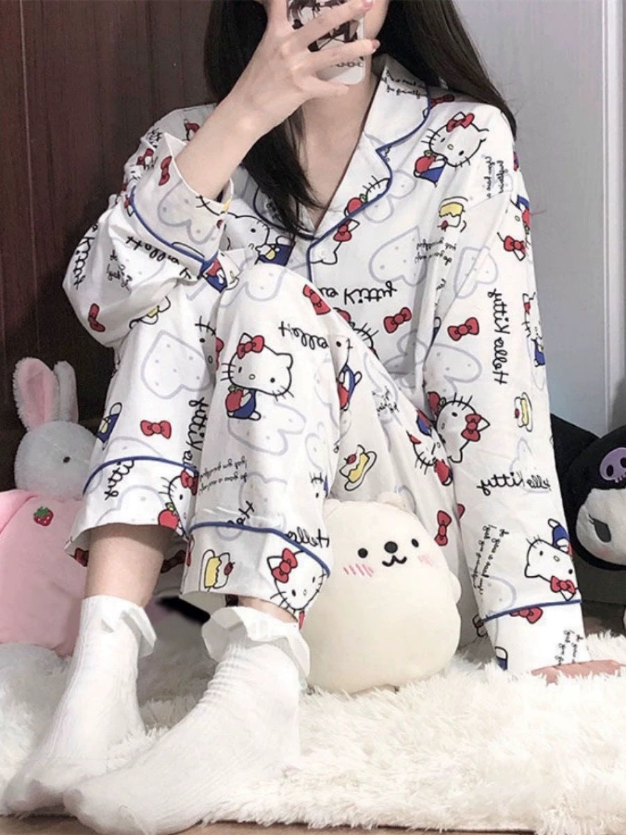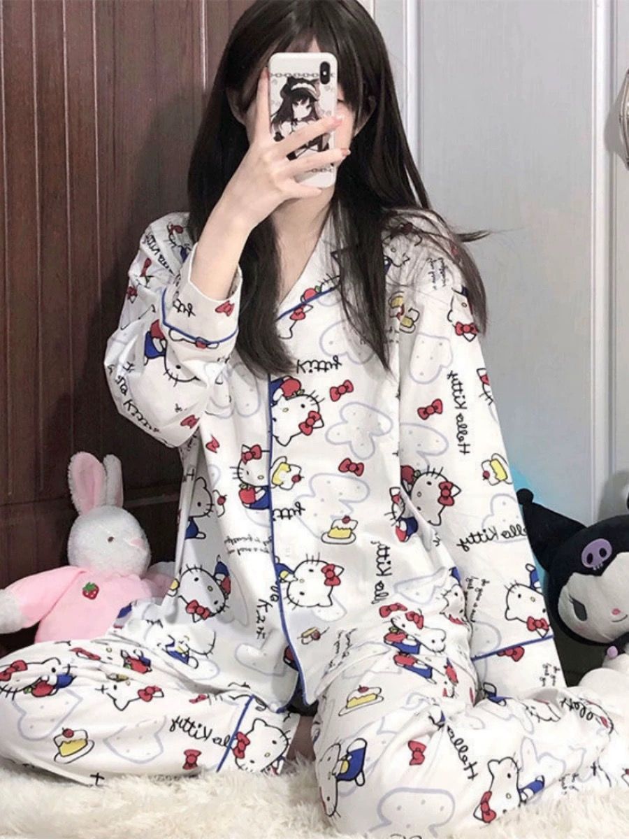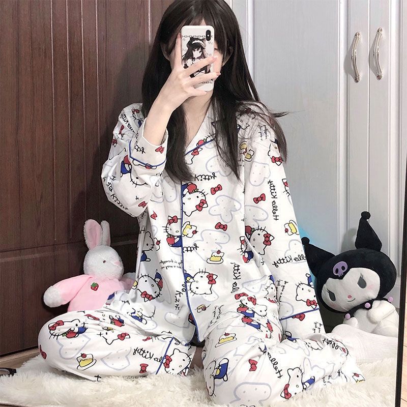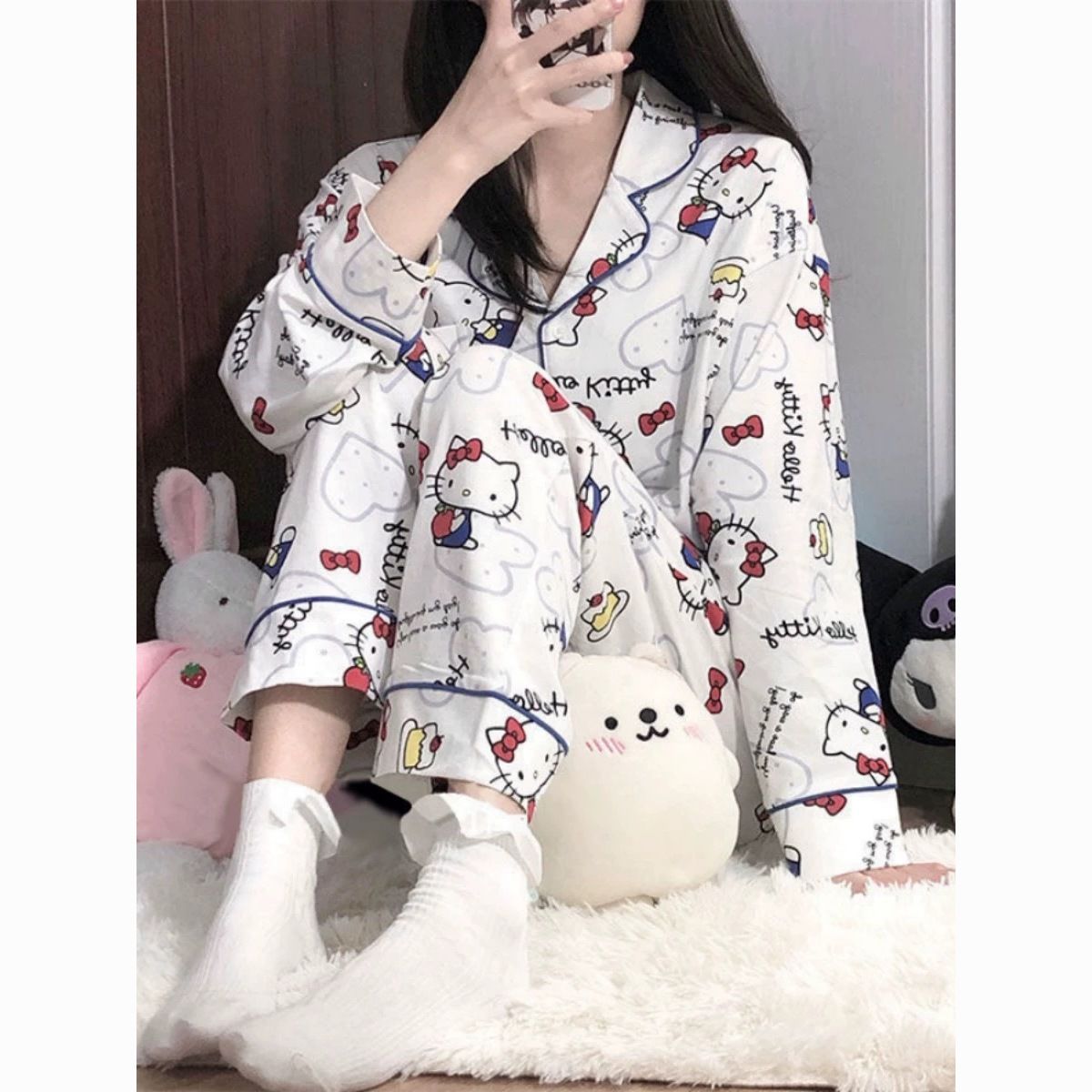 ins风日系睡衣女可爱卡通凯蒂猫长袖长裤Kitty家居服套装甜美新款