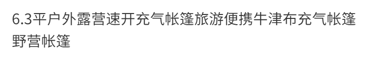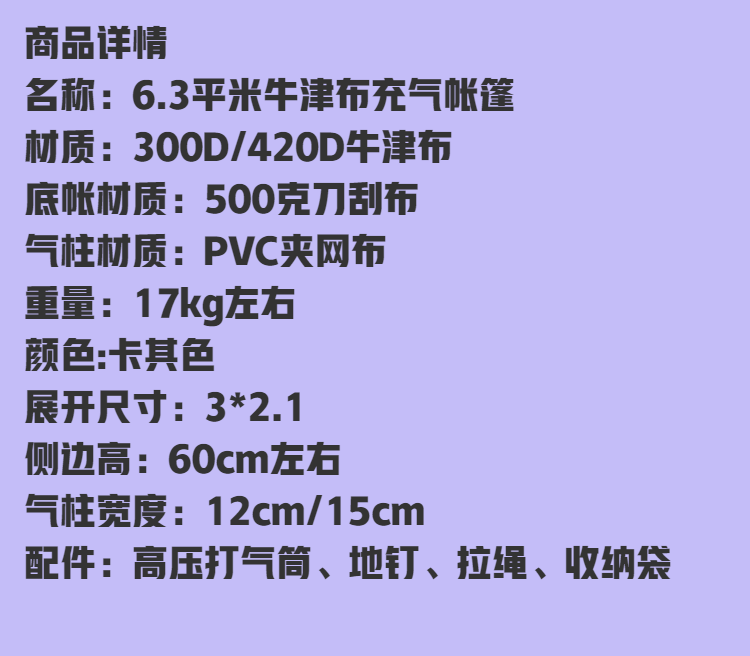 | 6.3 square meters large single door 300d oxford cloth + 12cm gas column(6.3平米大单门300D牛津布+12CM气柱) | USD $178.66 | 99999 piece available |