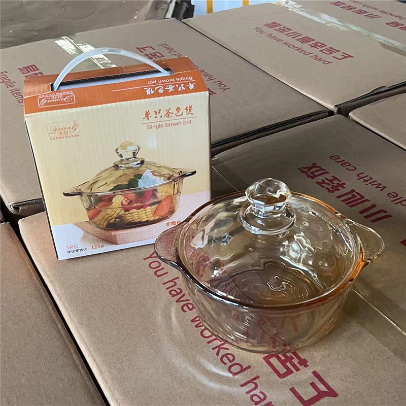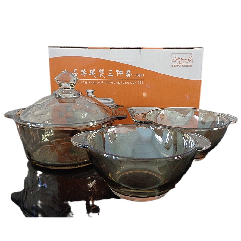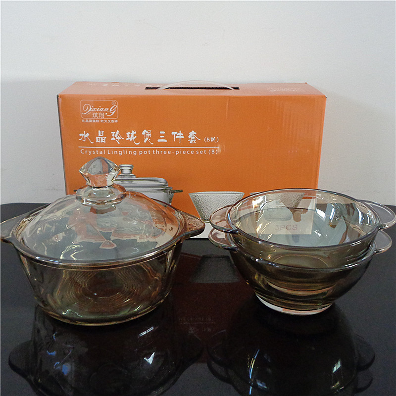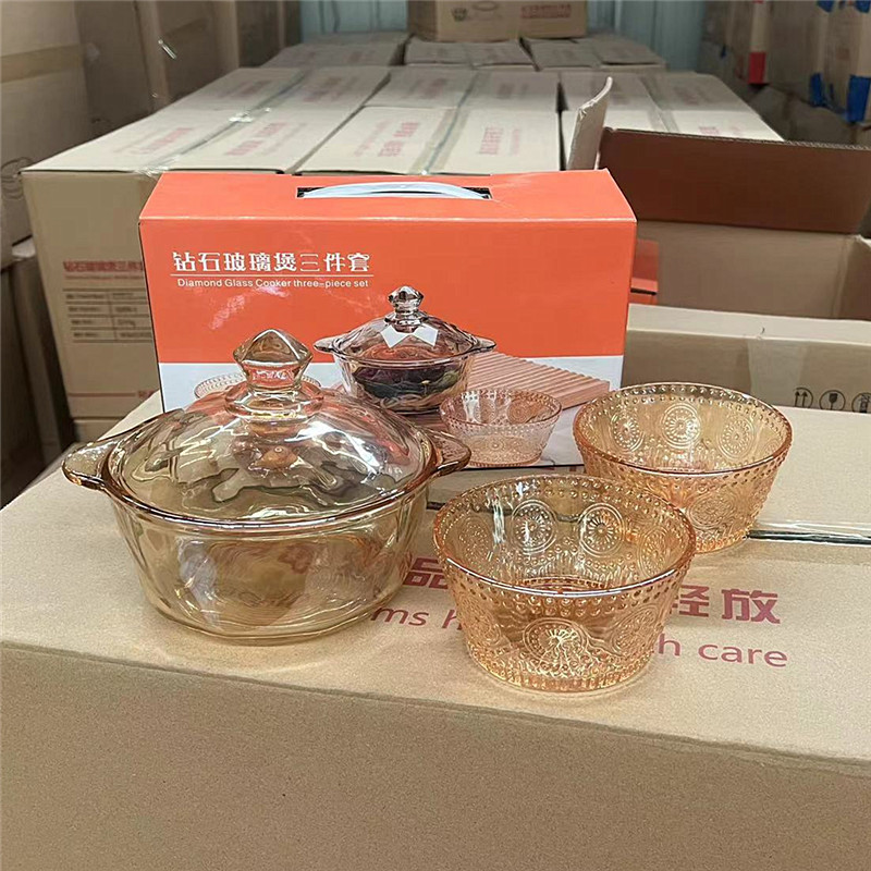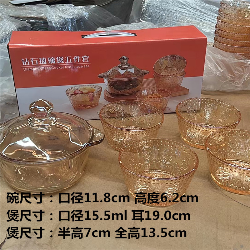 钻石煲琥珀色五件套 单只玻璃煲套装 茶色钻石煲三件套太阳花碗