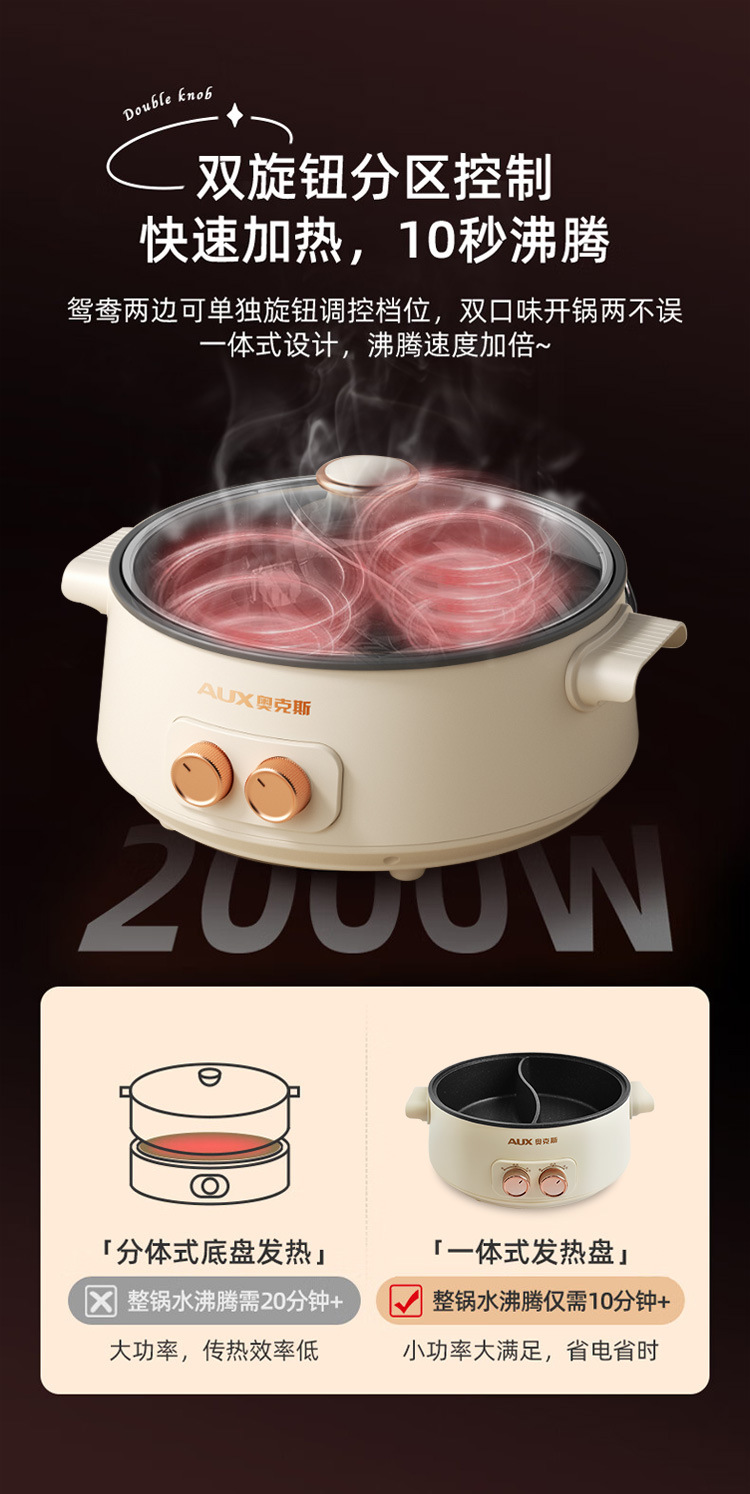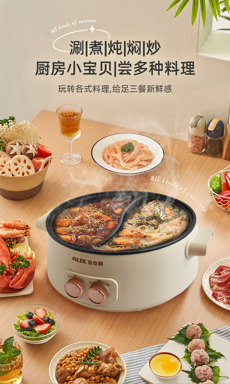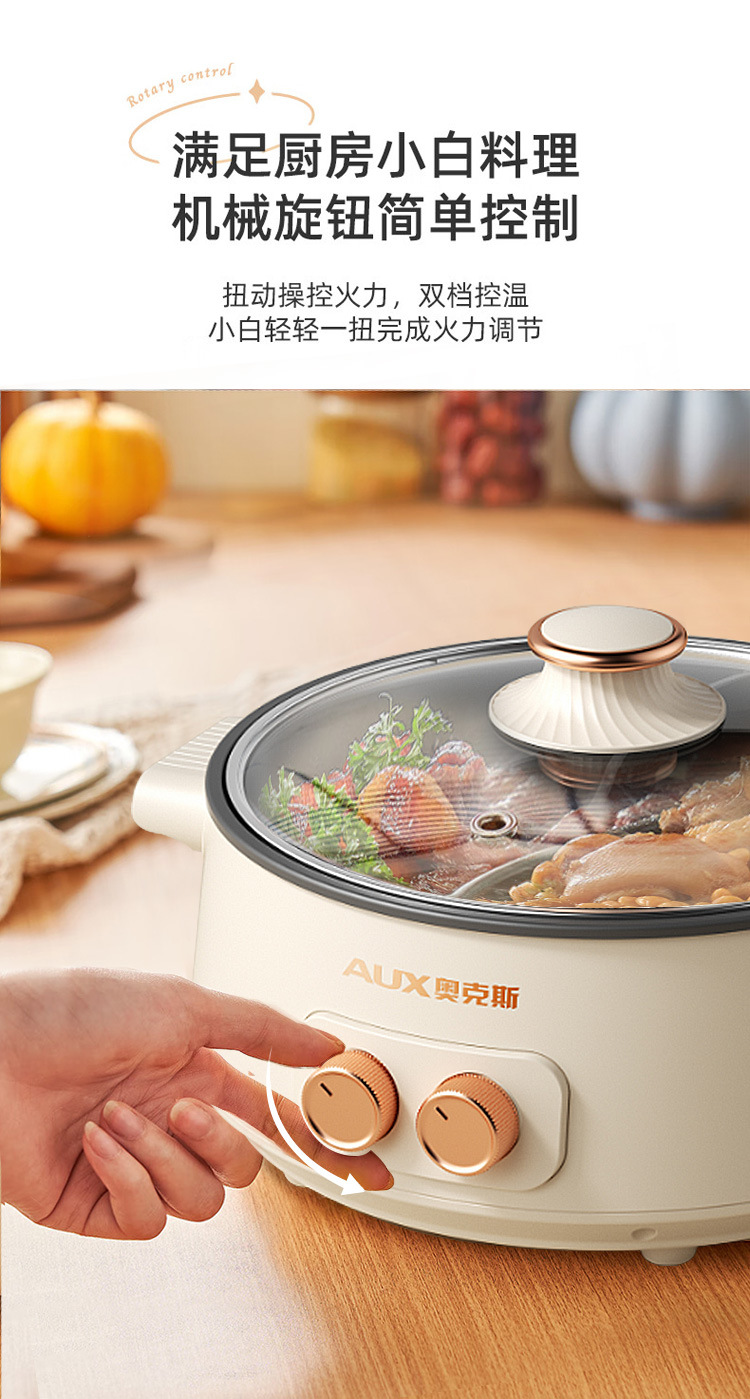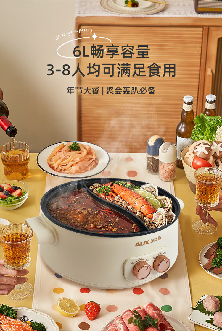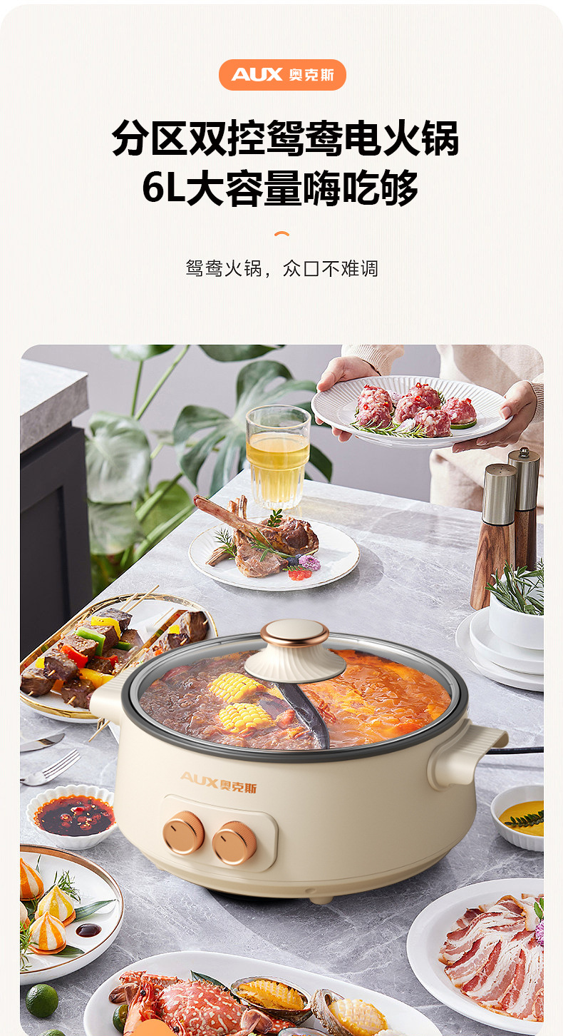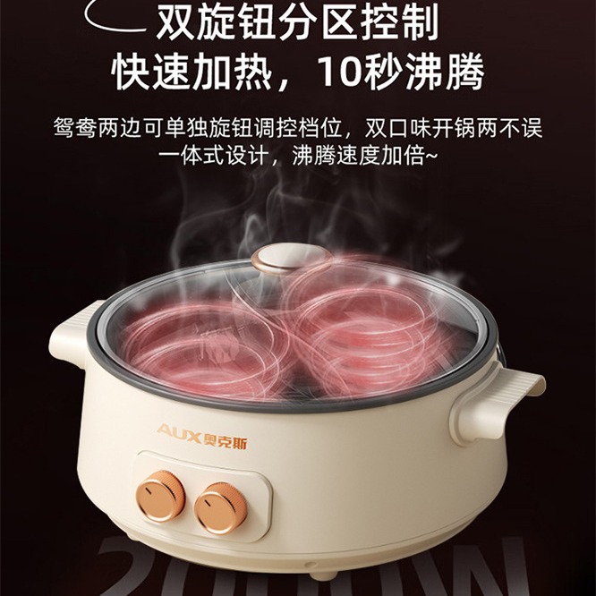 奥克斯鸳鸯锅电火锅家用大容量6L双控多功能一体电煮锅礼品批发