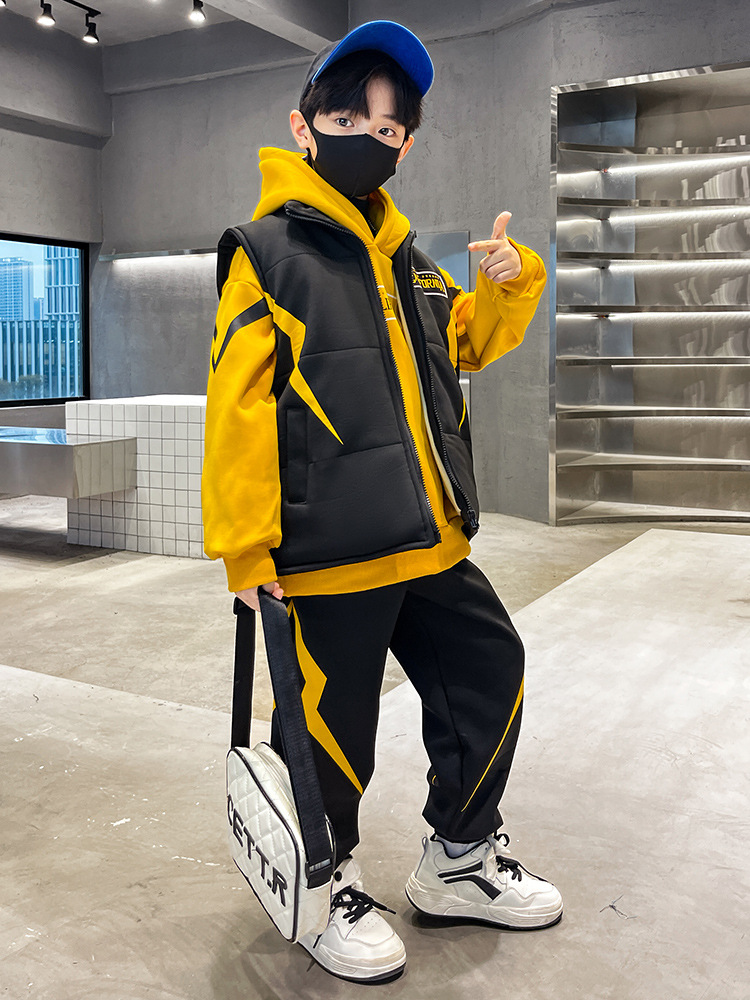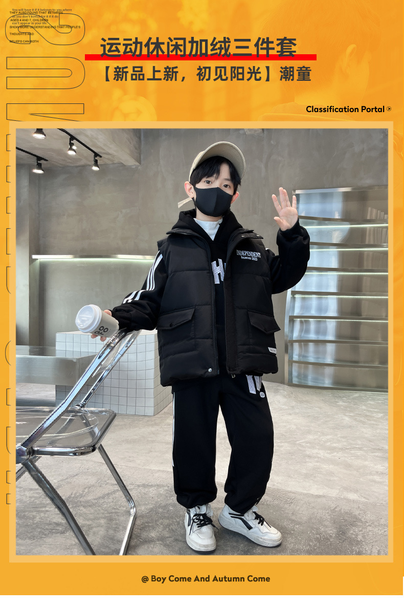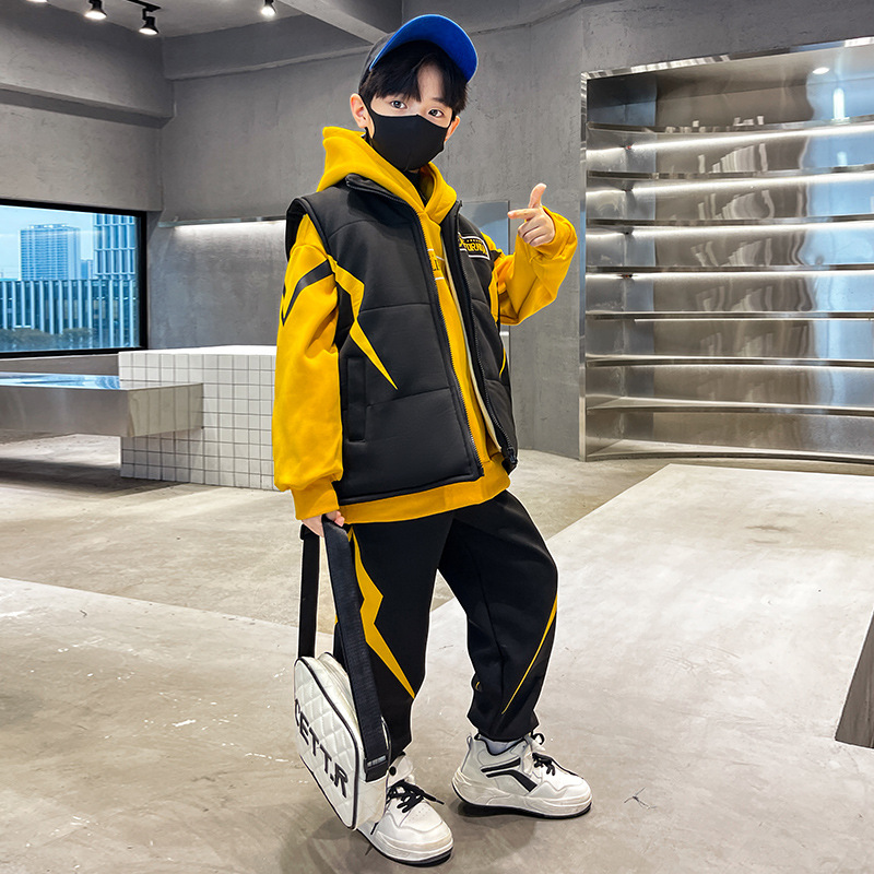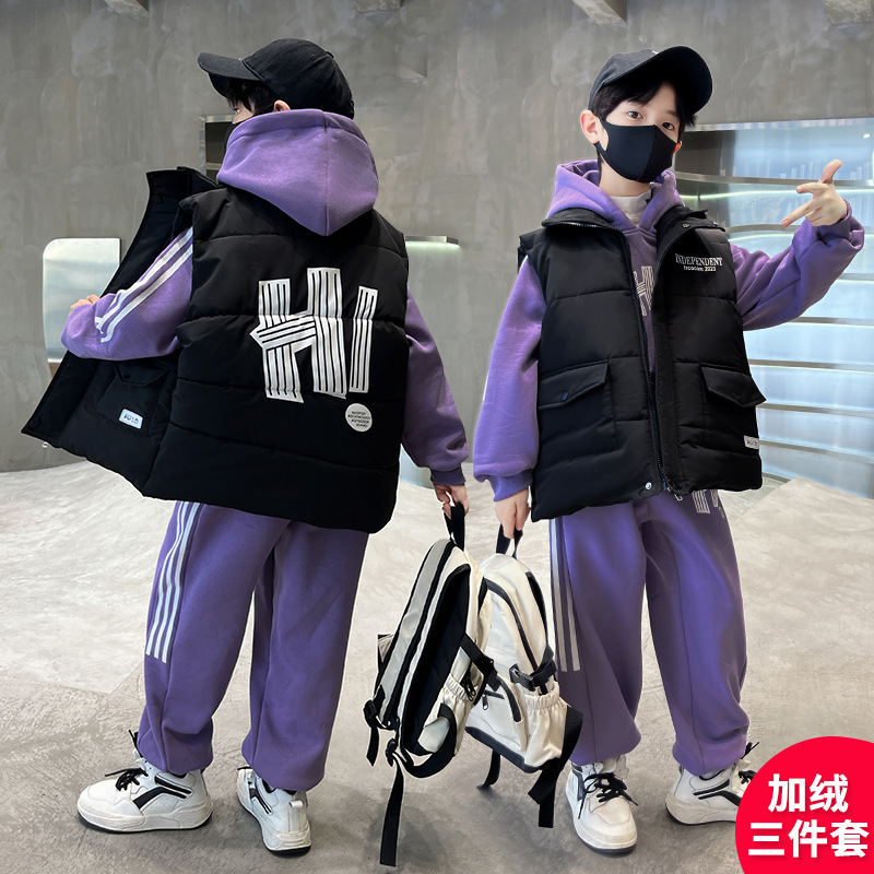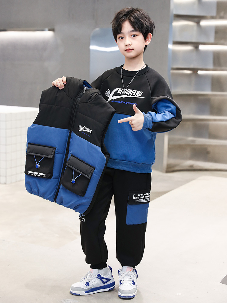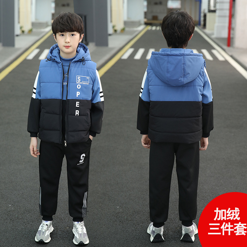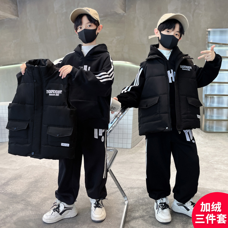 新款男童秋冬款套装中大儿童男孩休闲冬季加绒加厚闪电马甲三件套