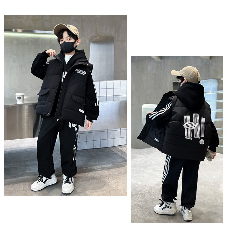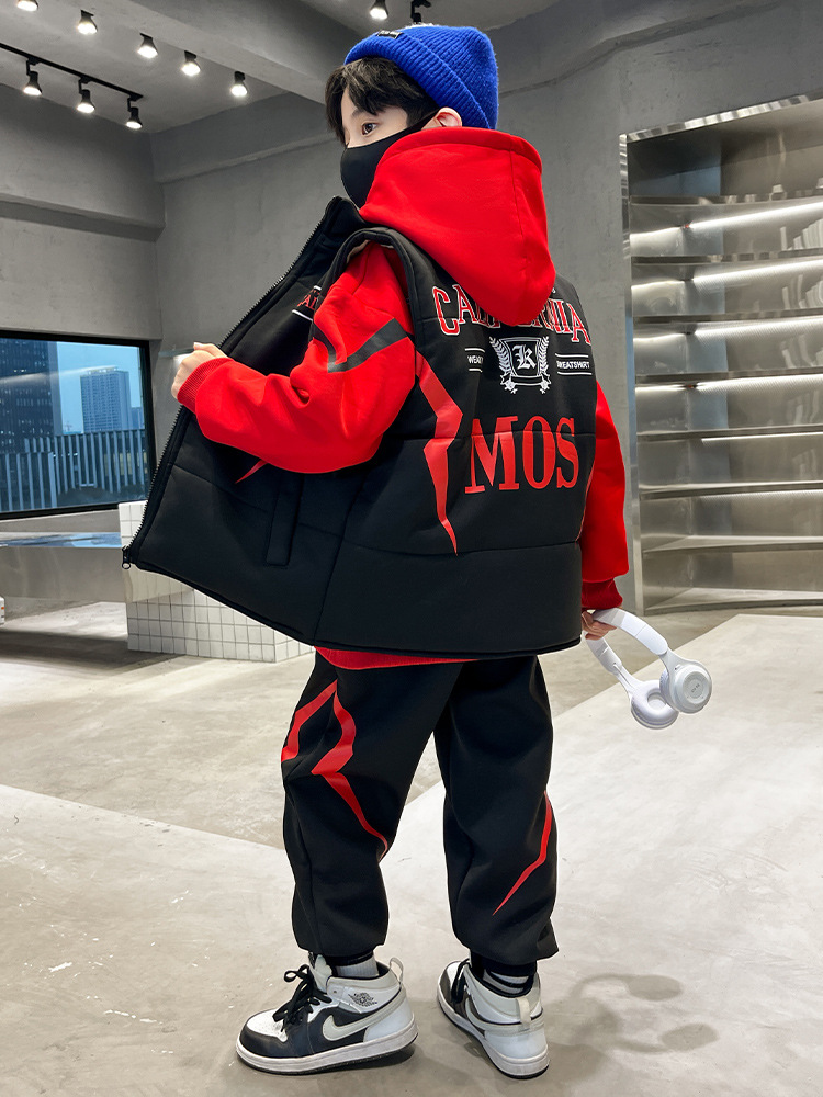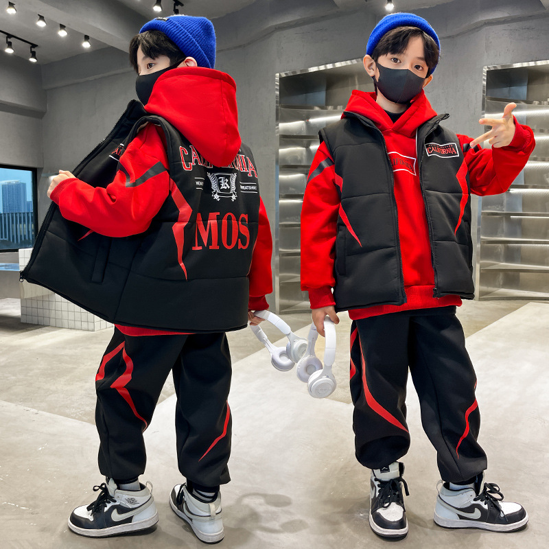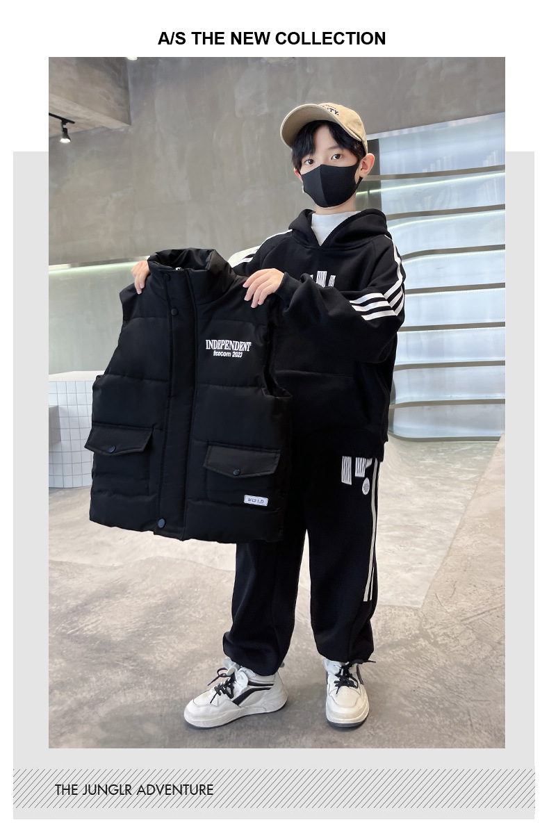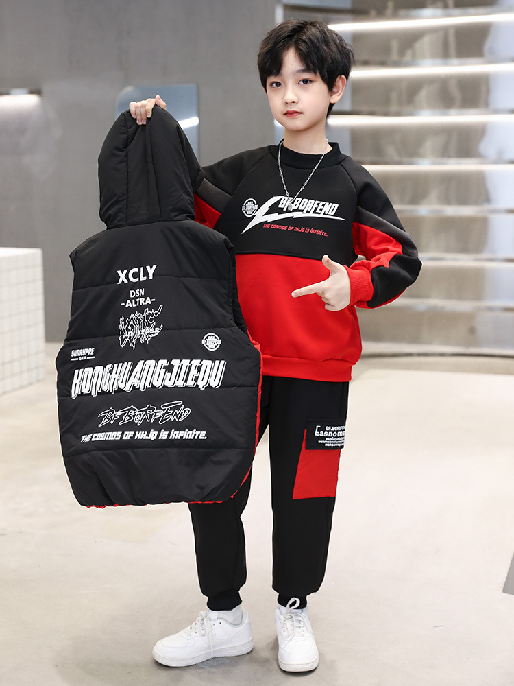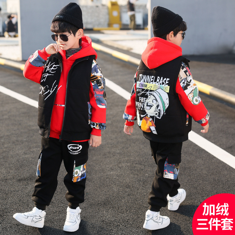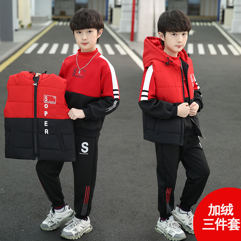 新款男童秋冬款套装中大儿童男孩休闲冬季加绒加厚闪电马甲三件套