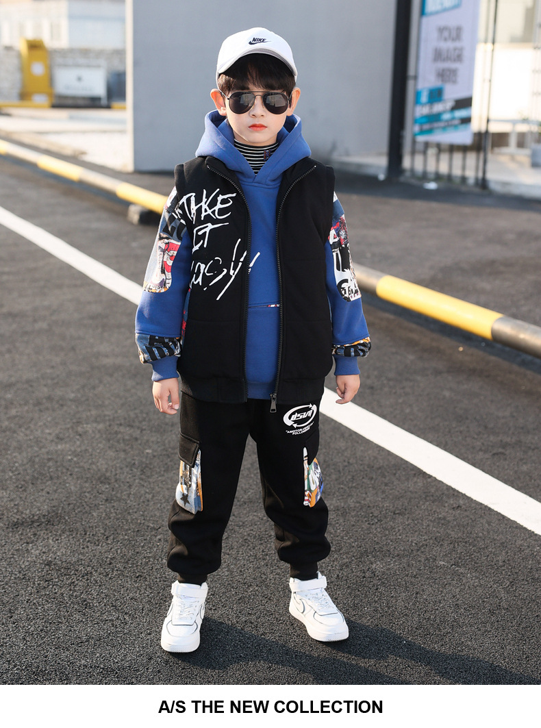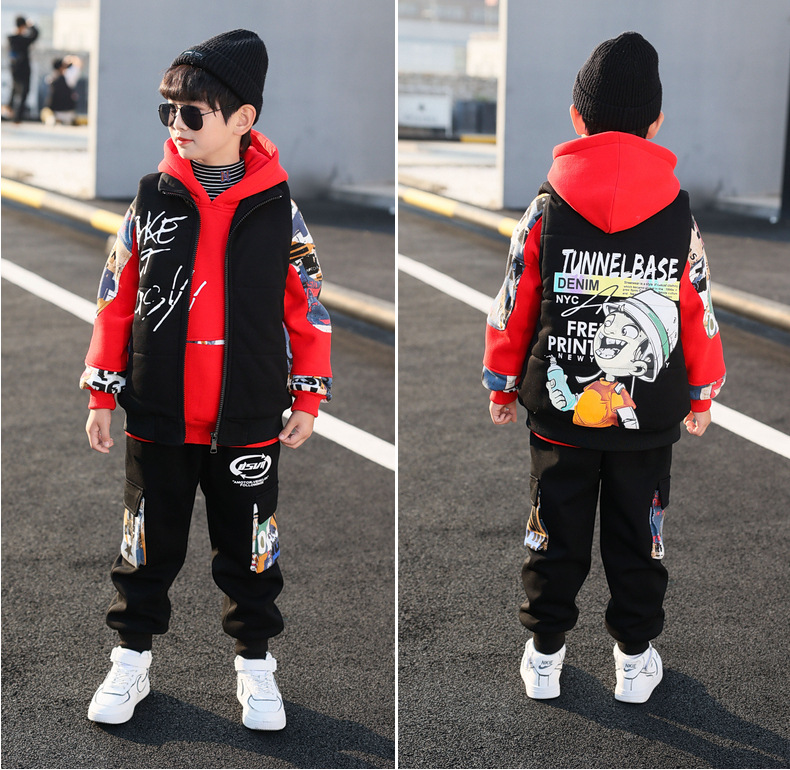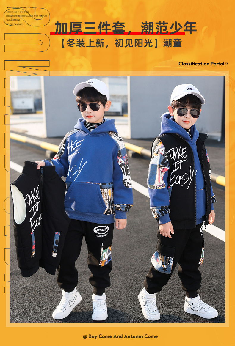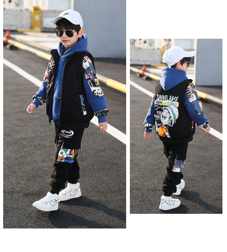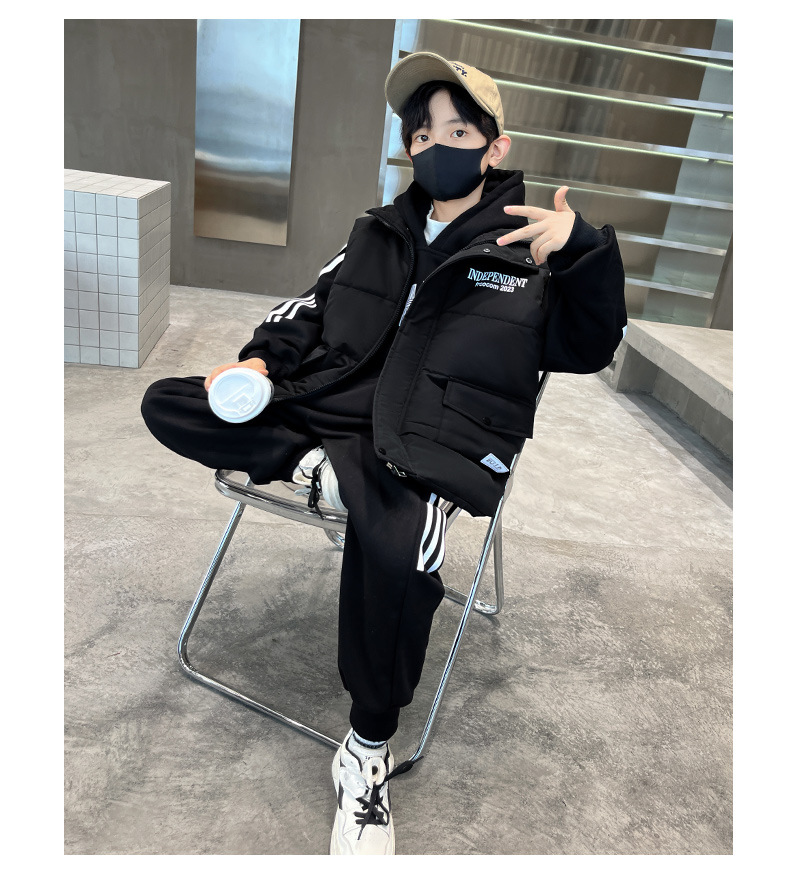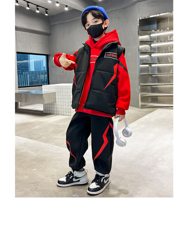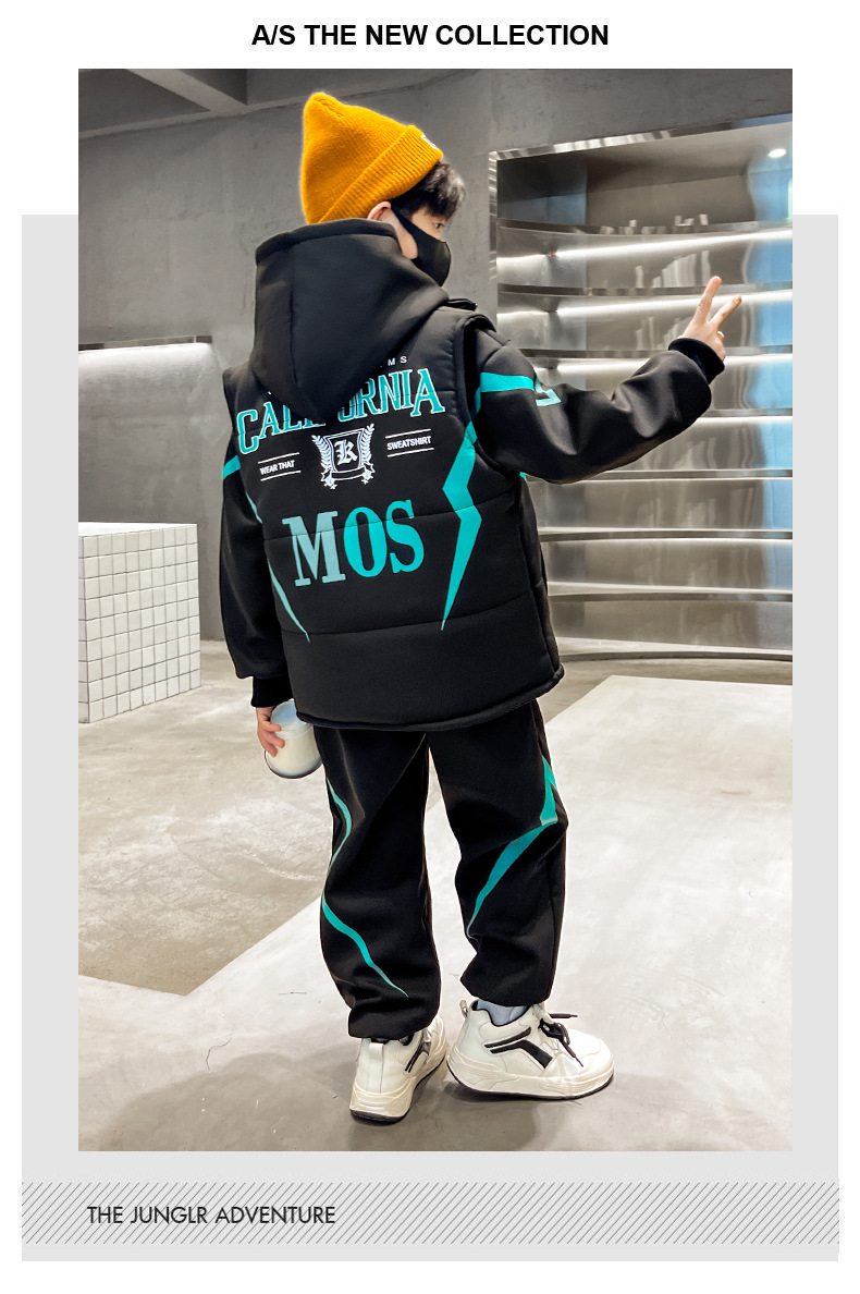 新款男童秋冬款套装中大儿童男孩休闲冬季加绒加厚闪电马甲三件套