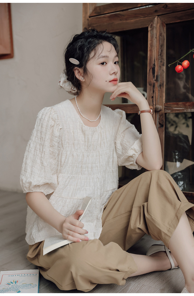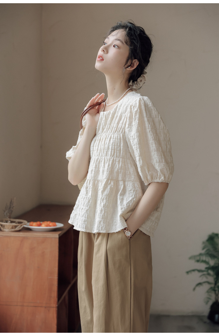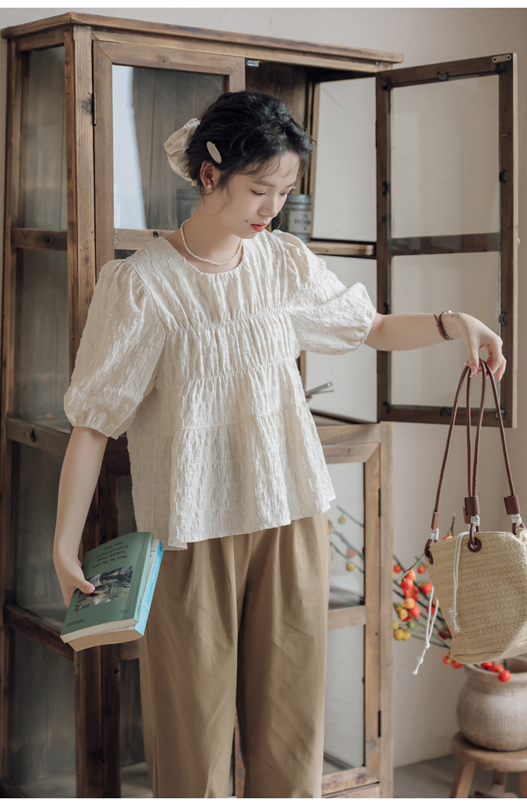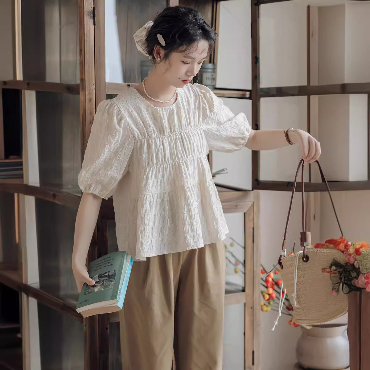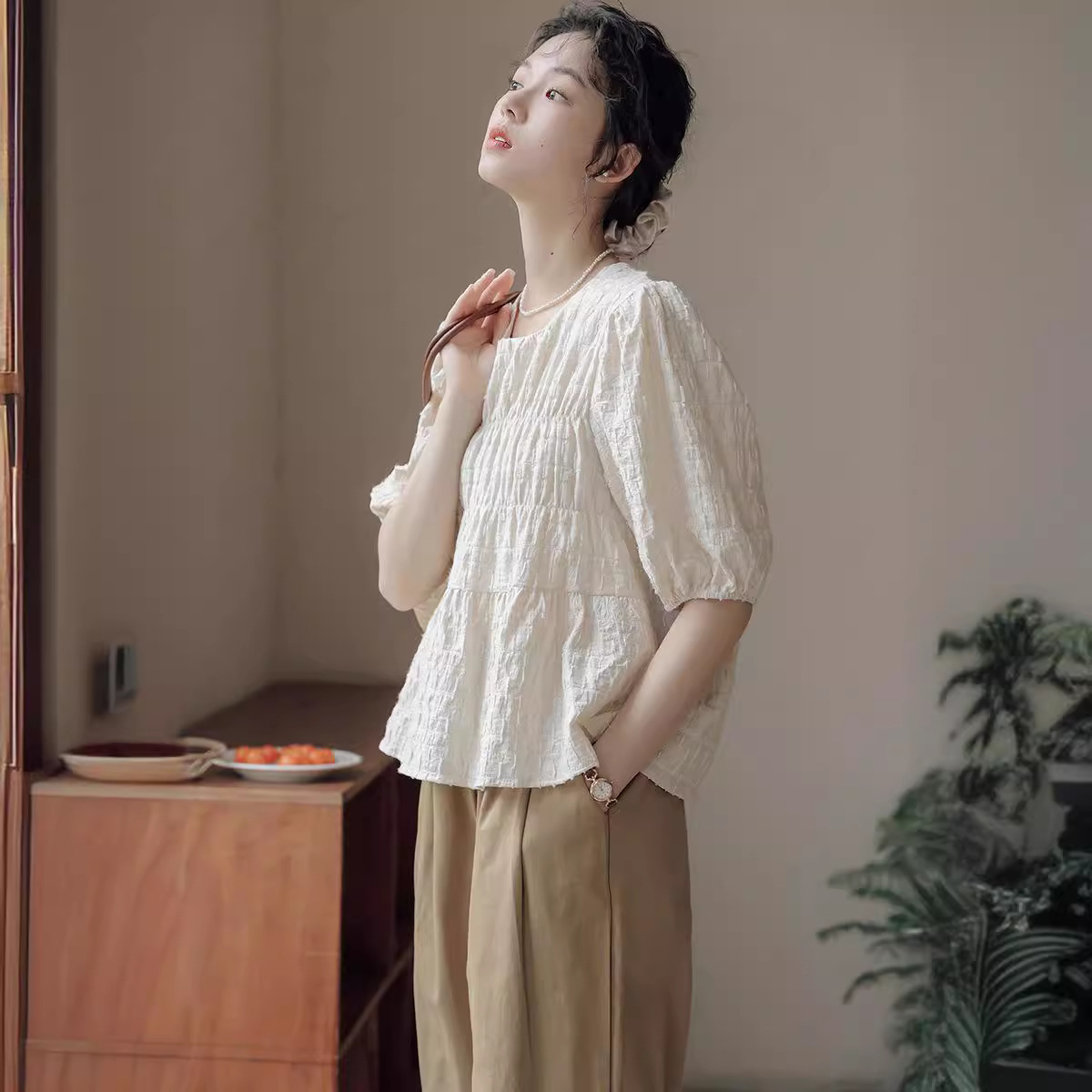 2024夏季新款法式气质褶皱设计感显瘦压褶别致套头圆领衬衫女短袖