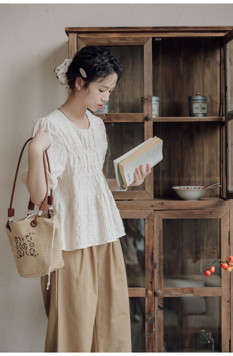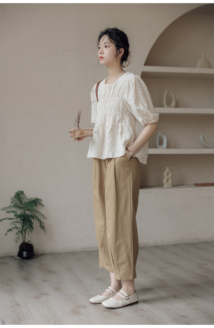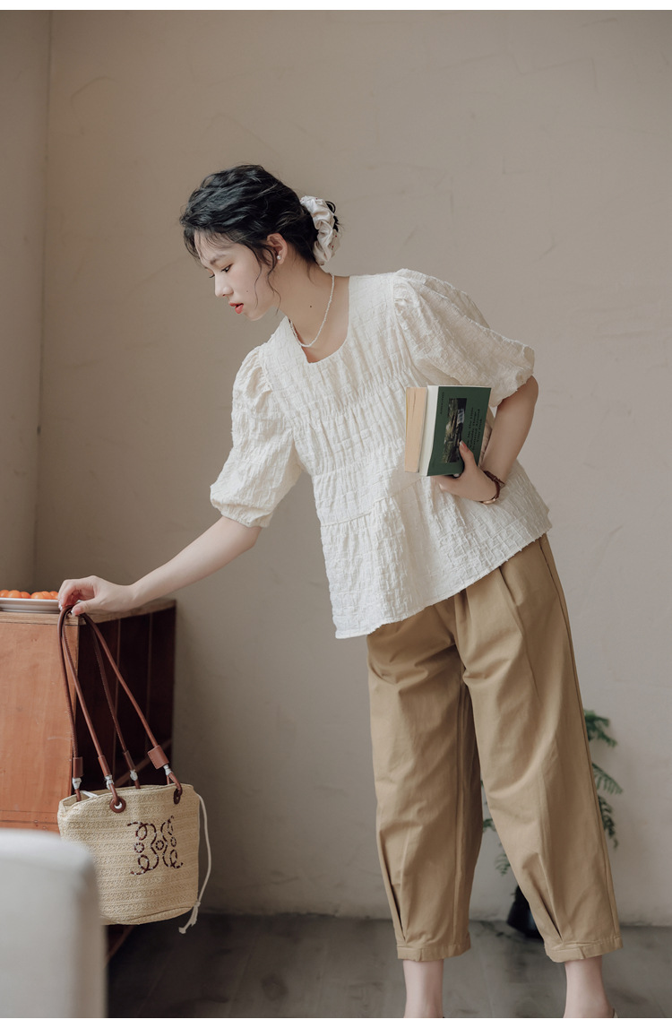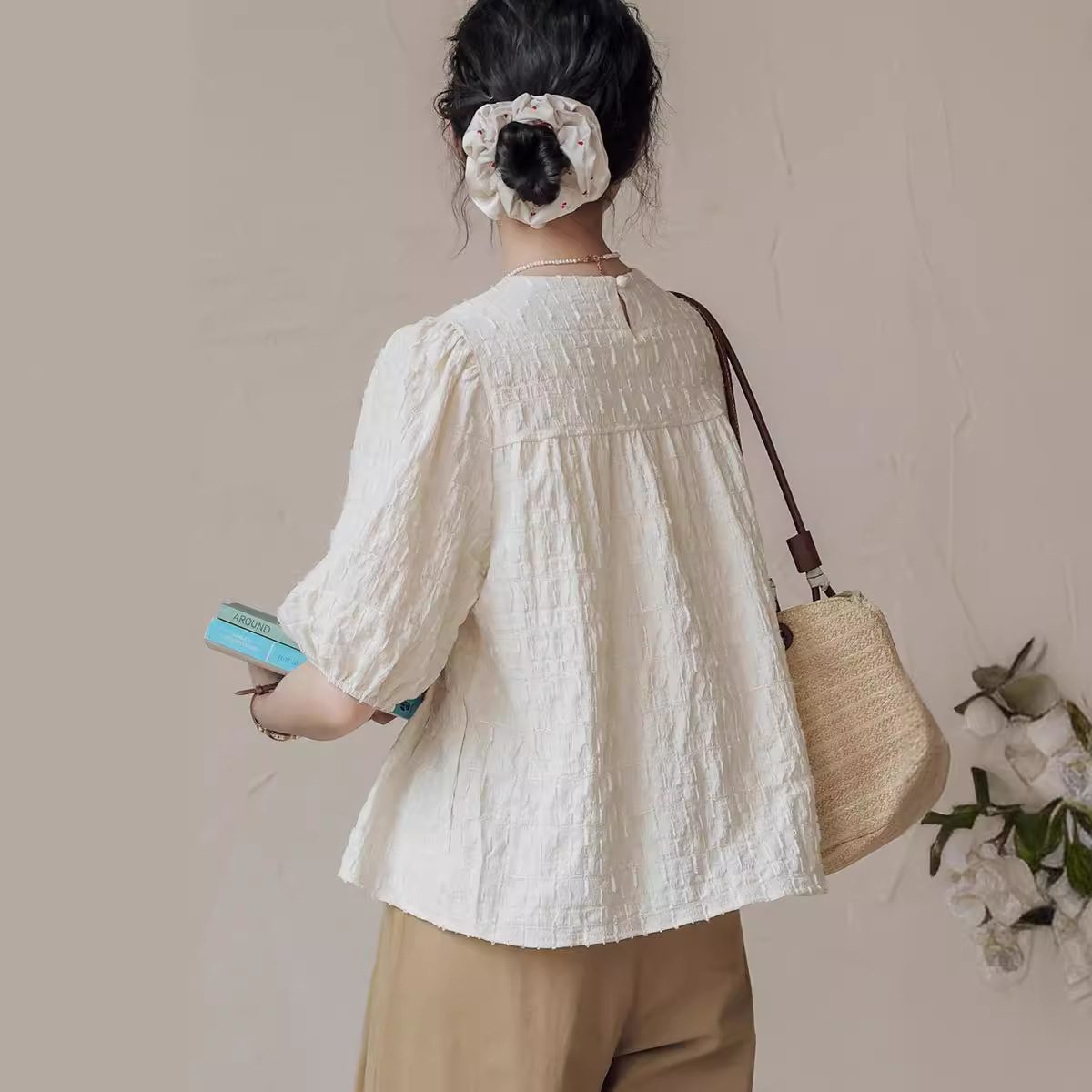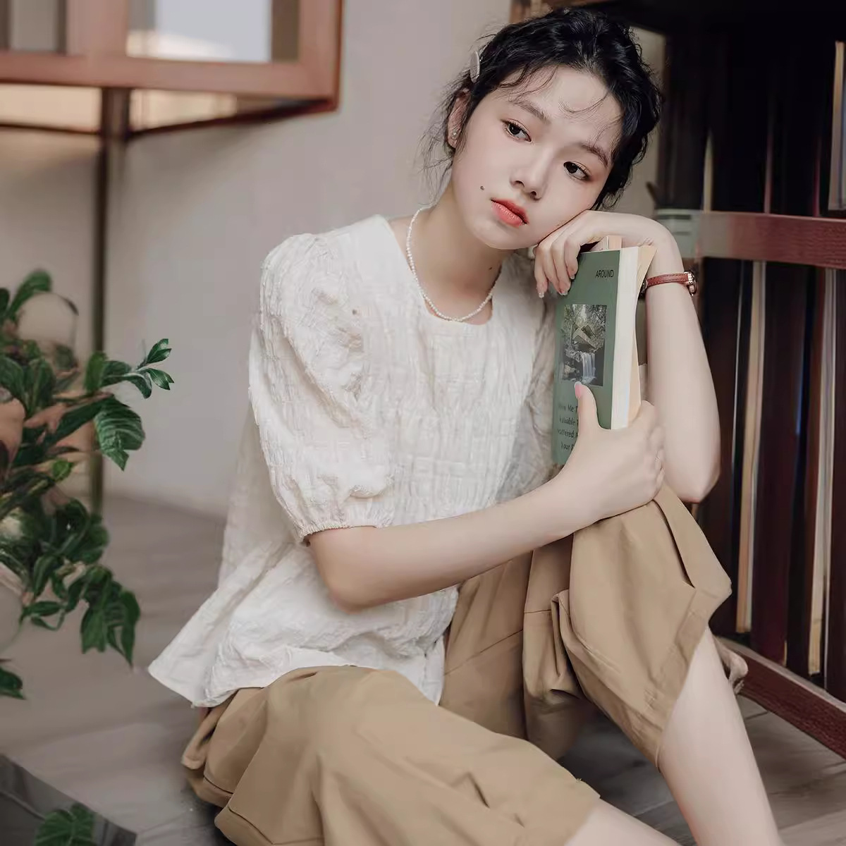 2024夏季新款法式气质褶皱设计感显瘦压褶别致套头圆领衬衫女短袖
