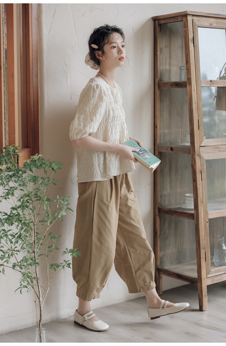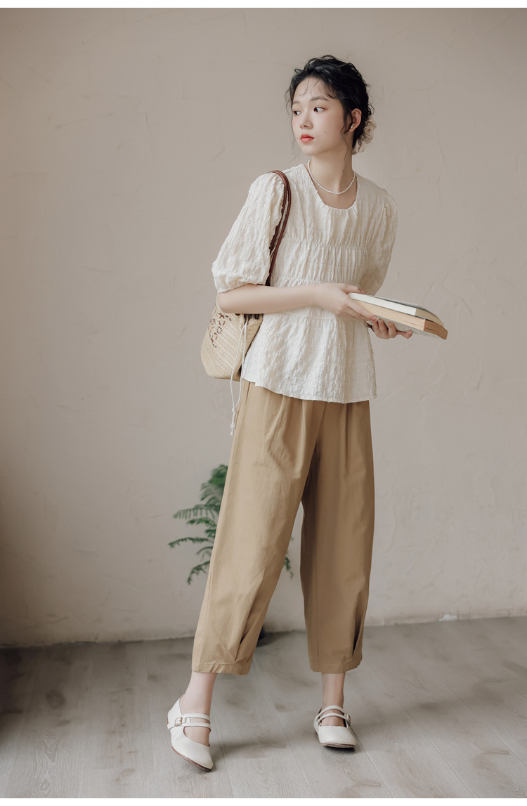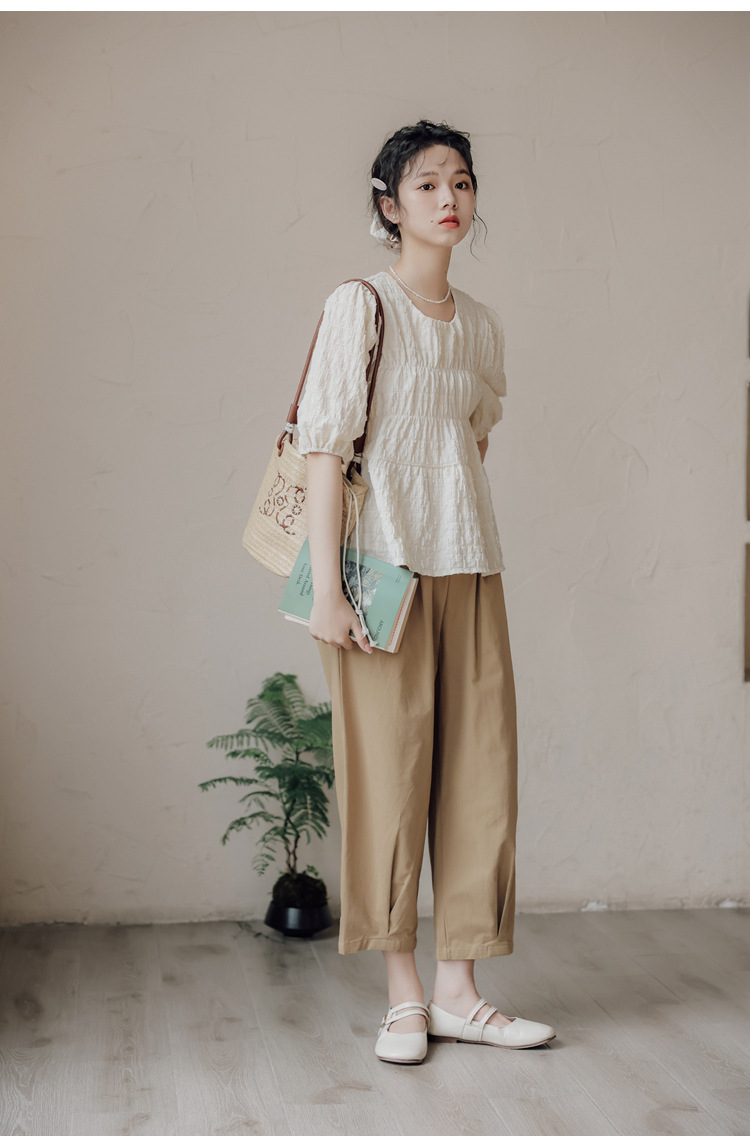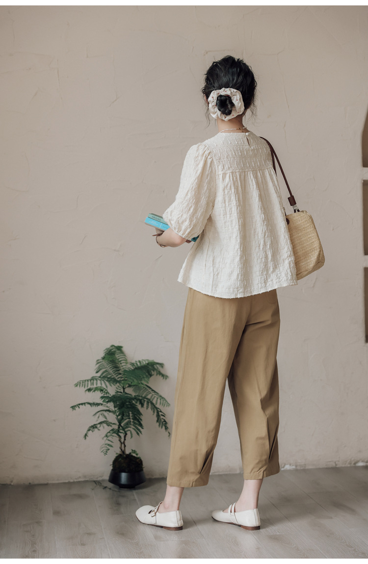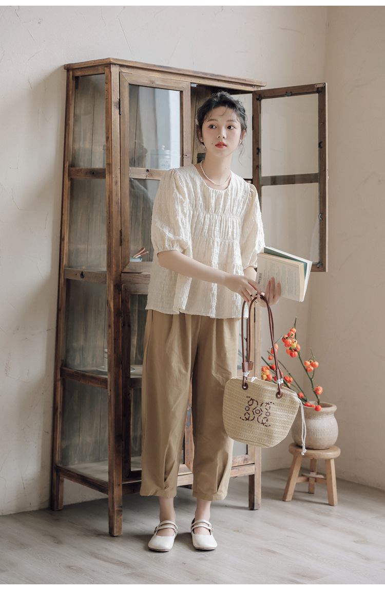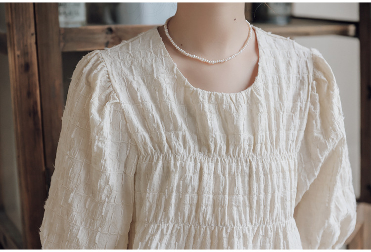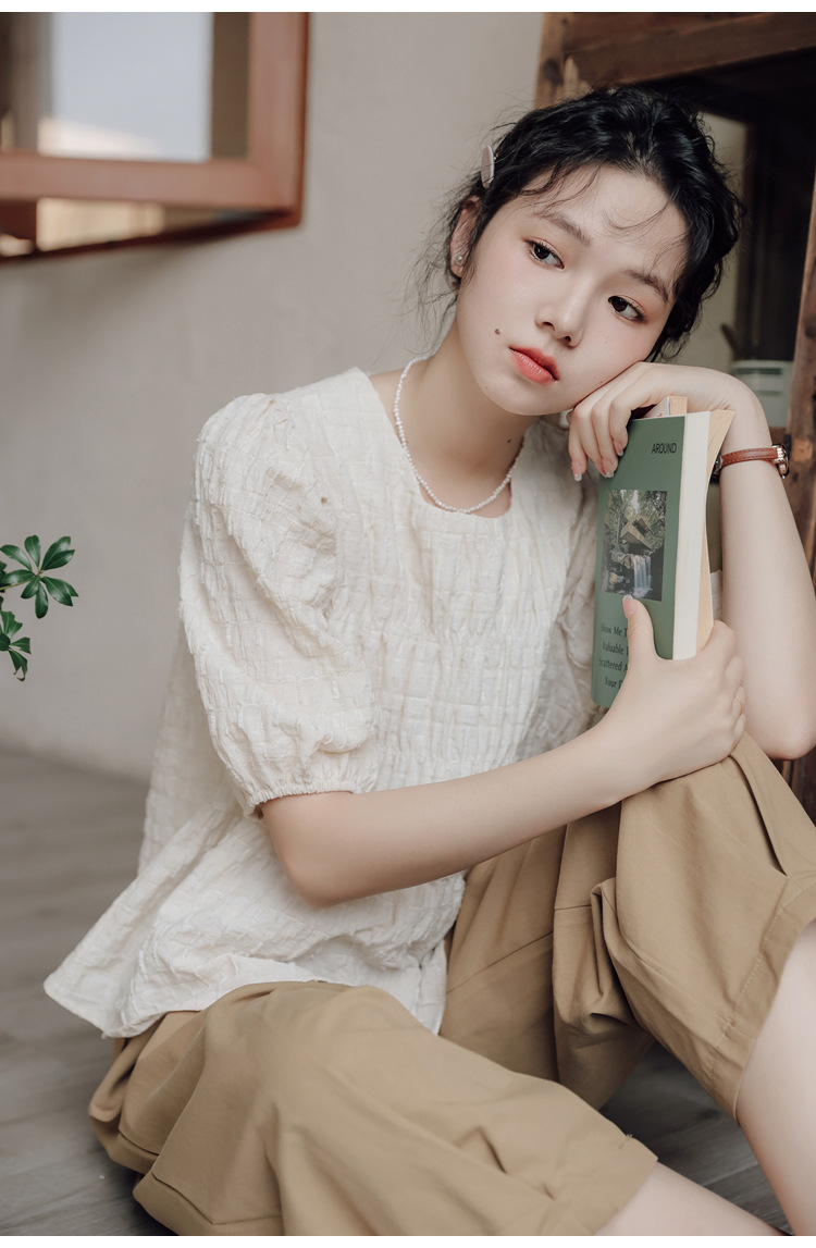 2024夏季新款法式气质褶皱设计感显瘦压褶别致套头圆领衬衫女短袖