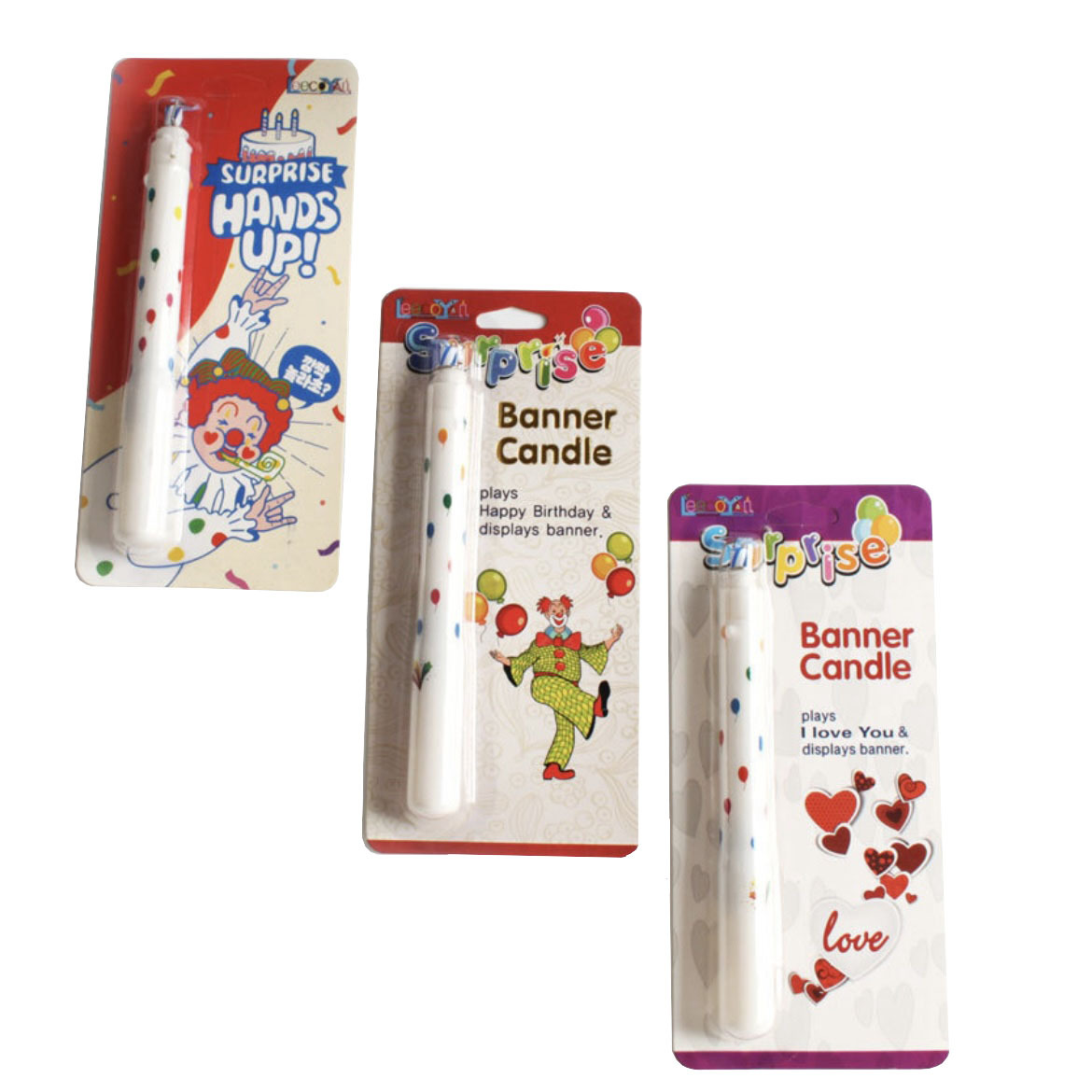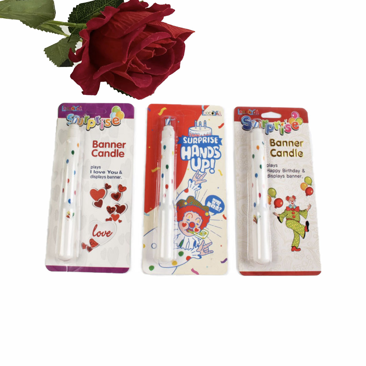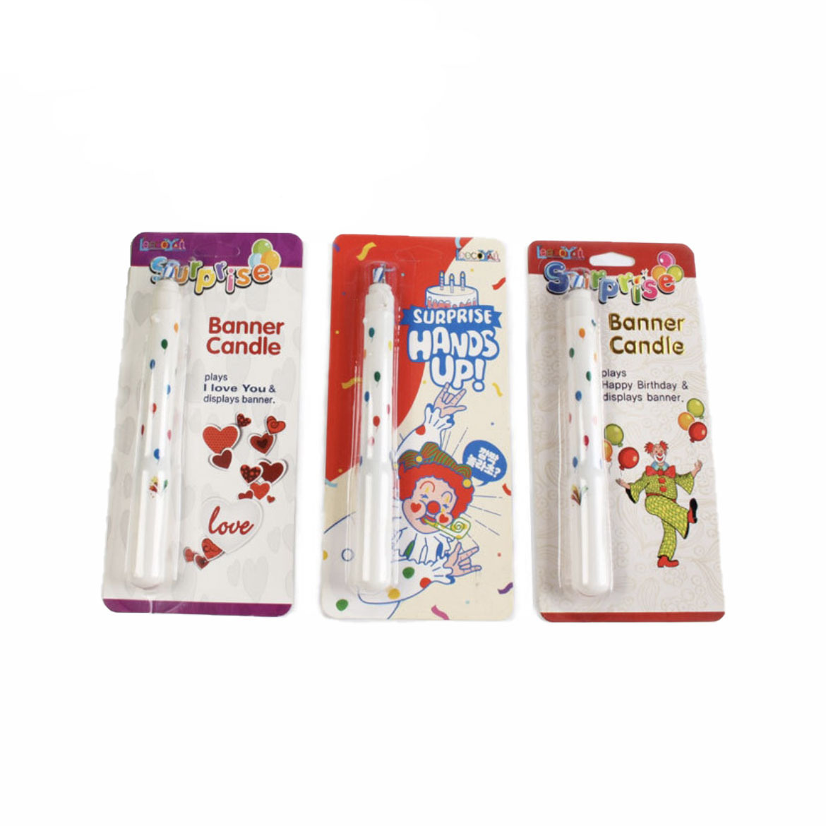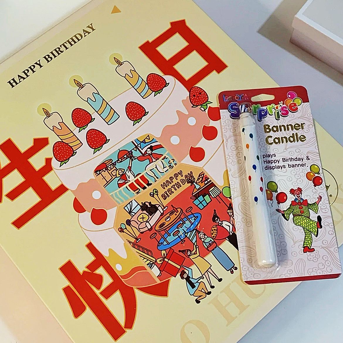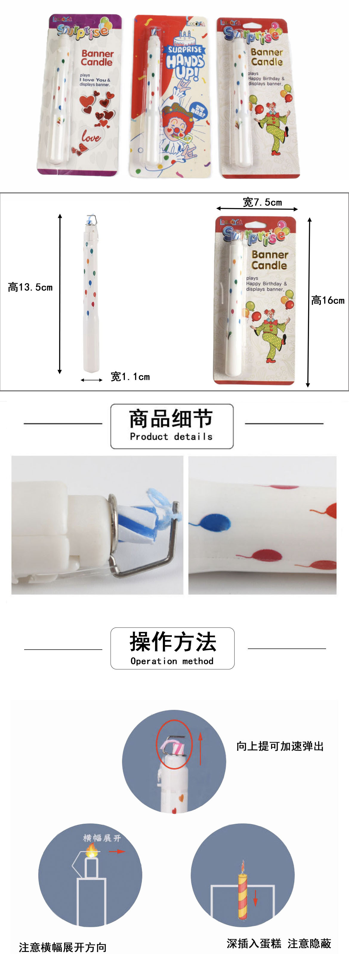 2,建议不点燃蜡烛的情况下一定要测试一下哦,直接用手指把顶部透明皮筋拨弄松掉,正常横幅会自动弹出来。