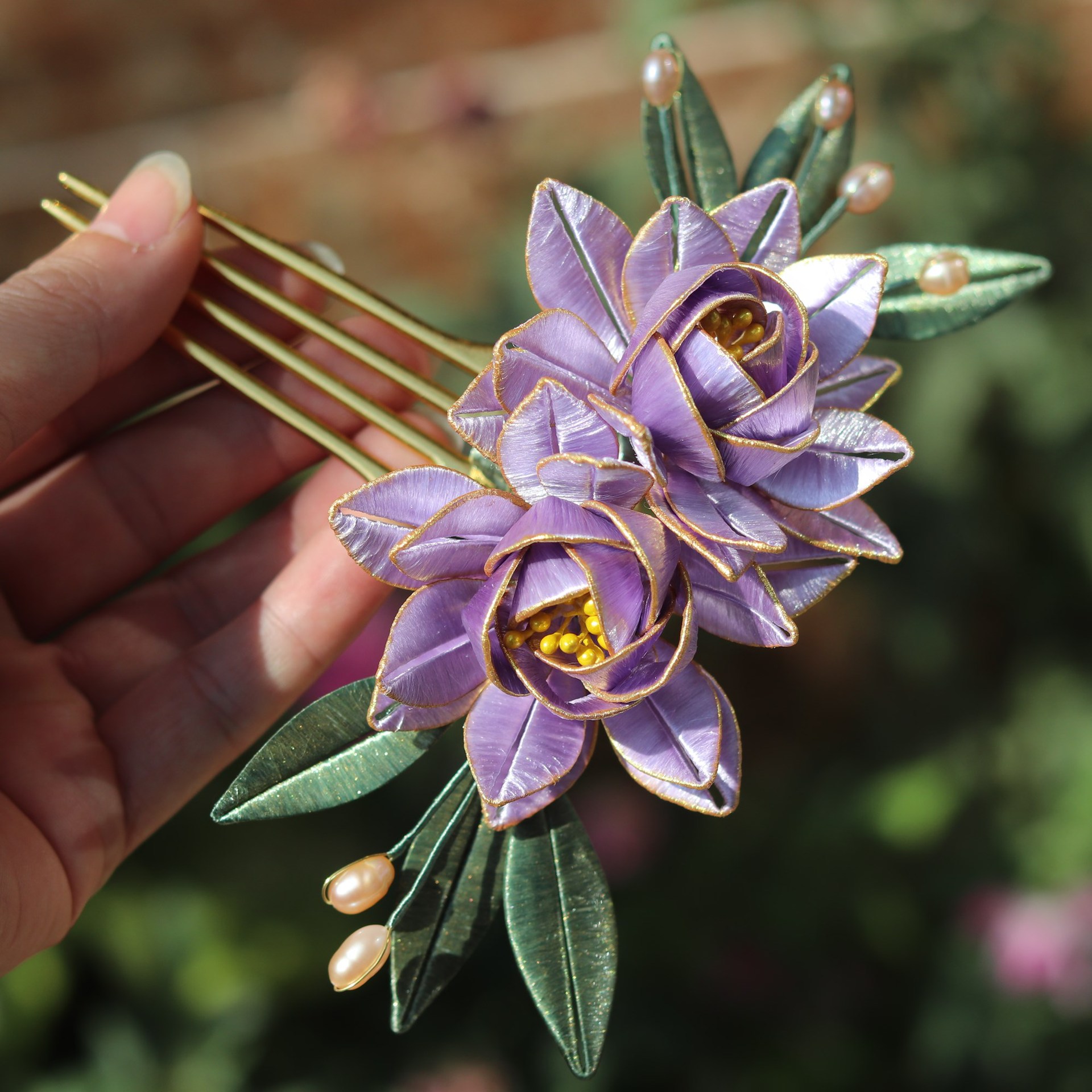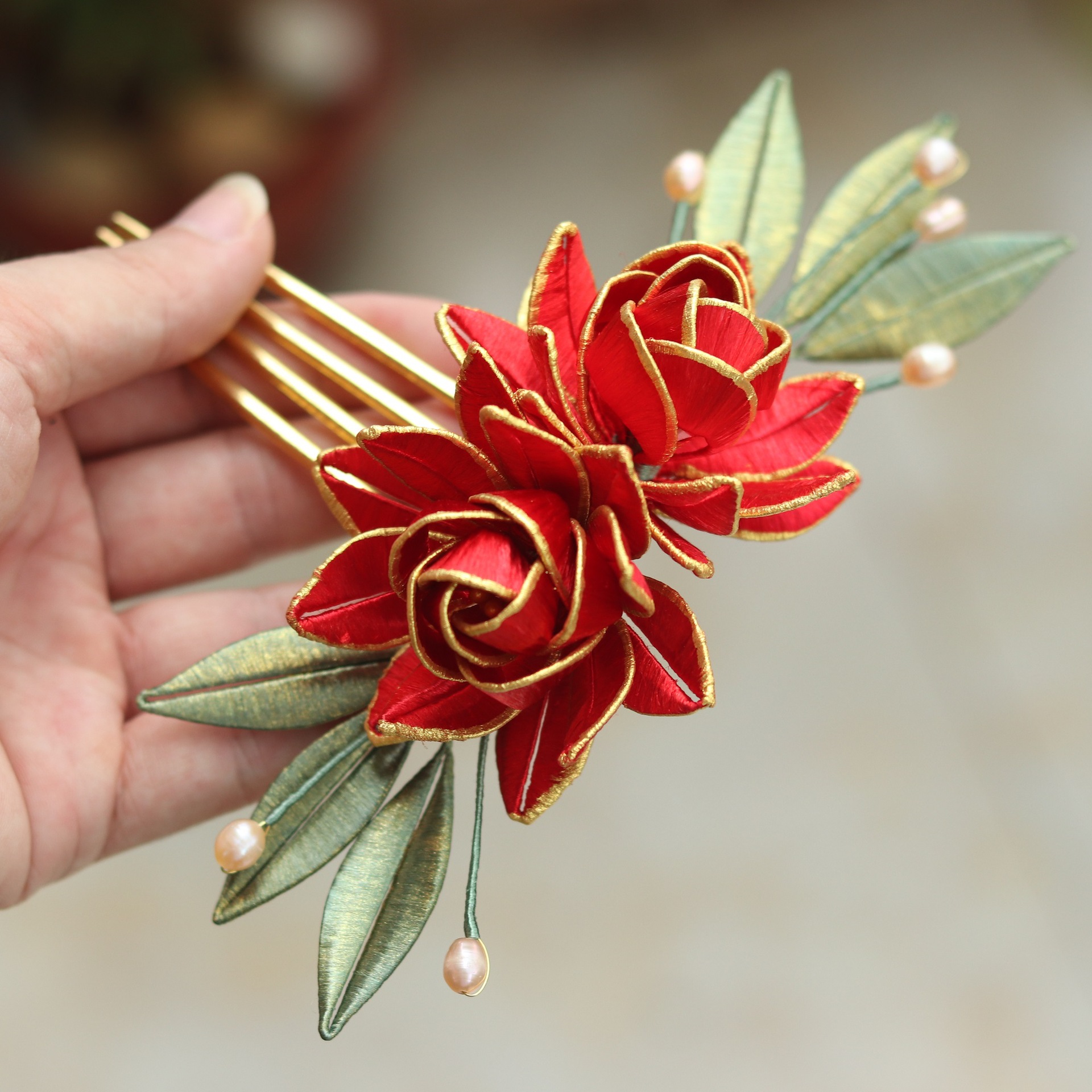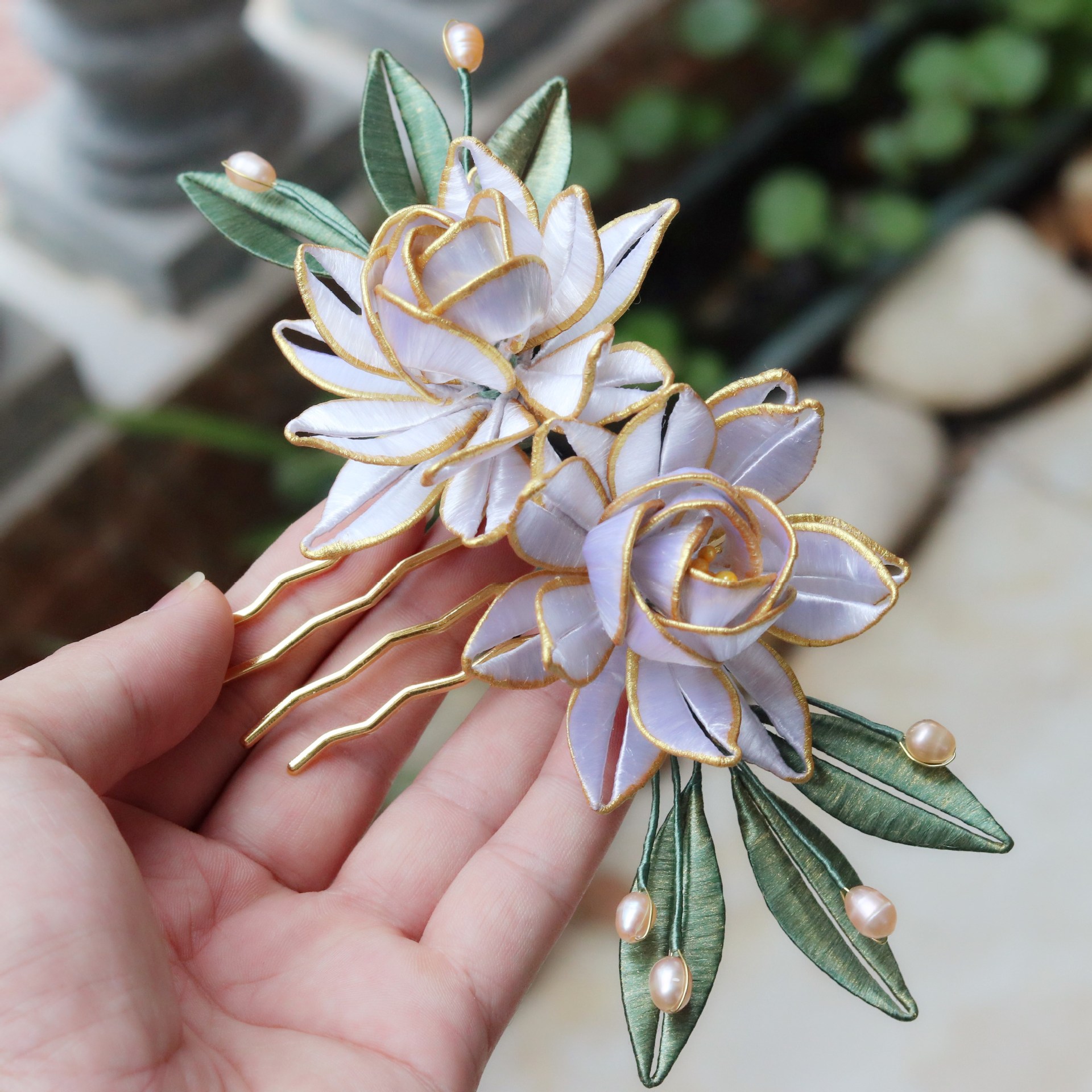 栀子花发梳缠花描金古风汉服配饰发簪簪子复古珍珠发饰钗夹小清新