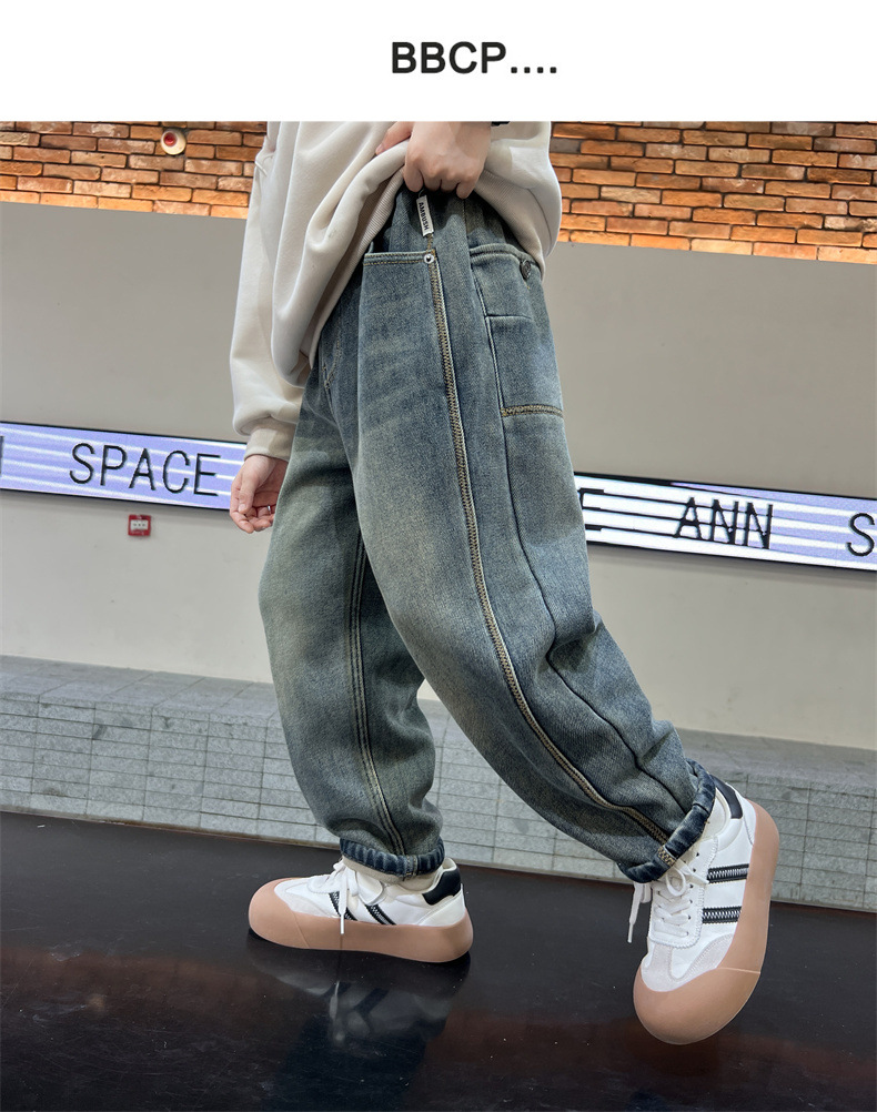 男童加绒牛仔裤2024新款冬装一体绒裤子中大童加厚潮范男孩洋气冬