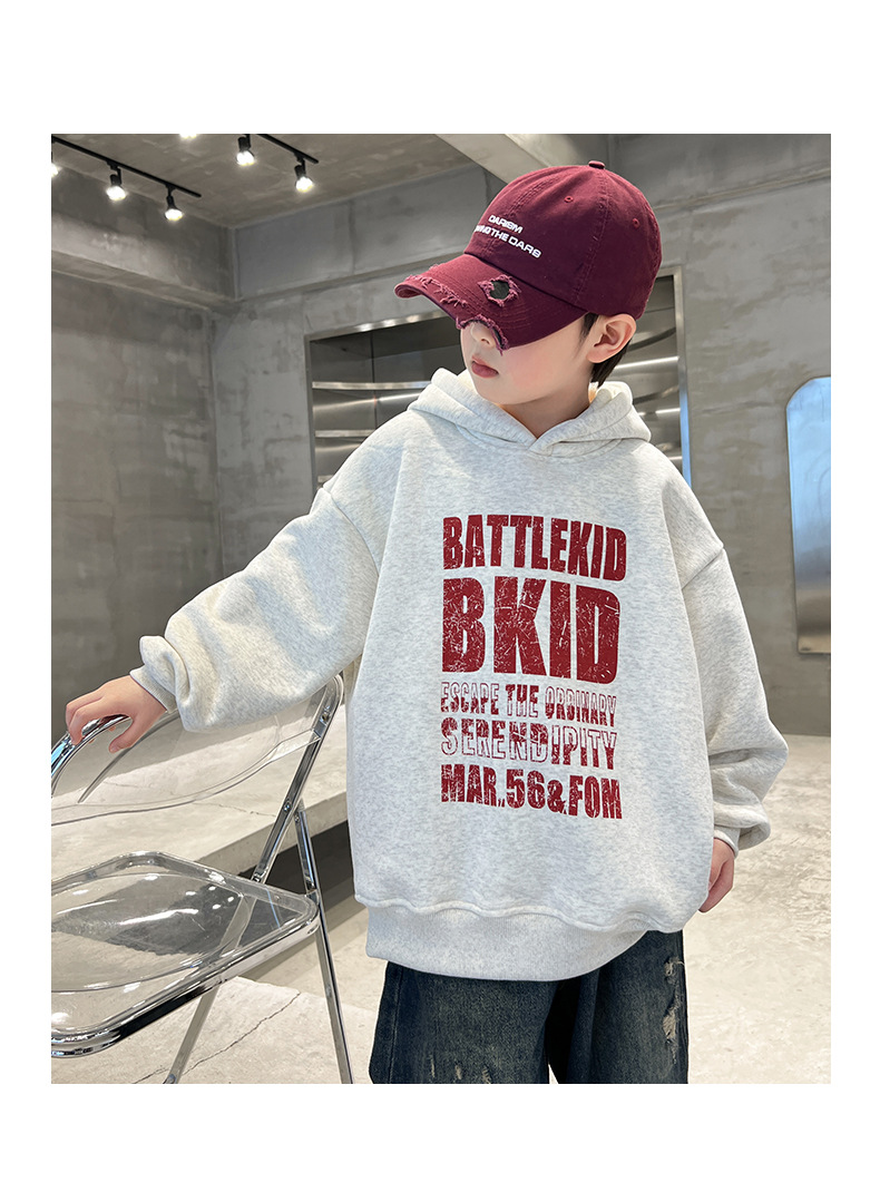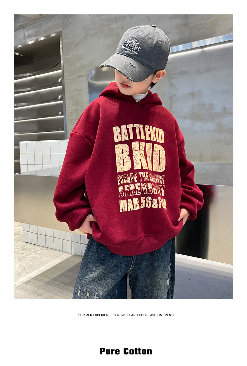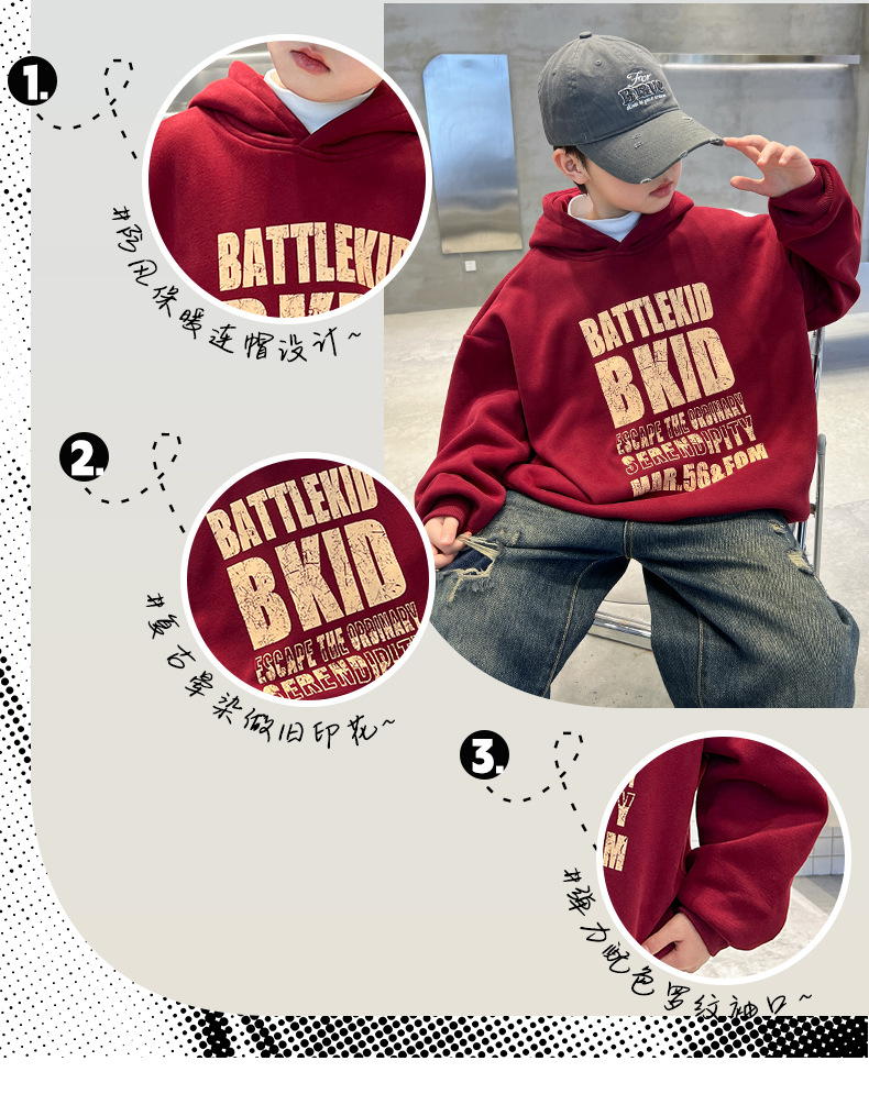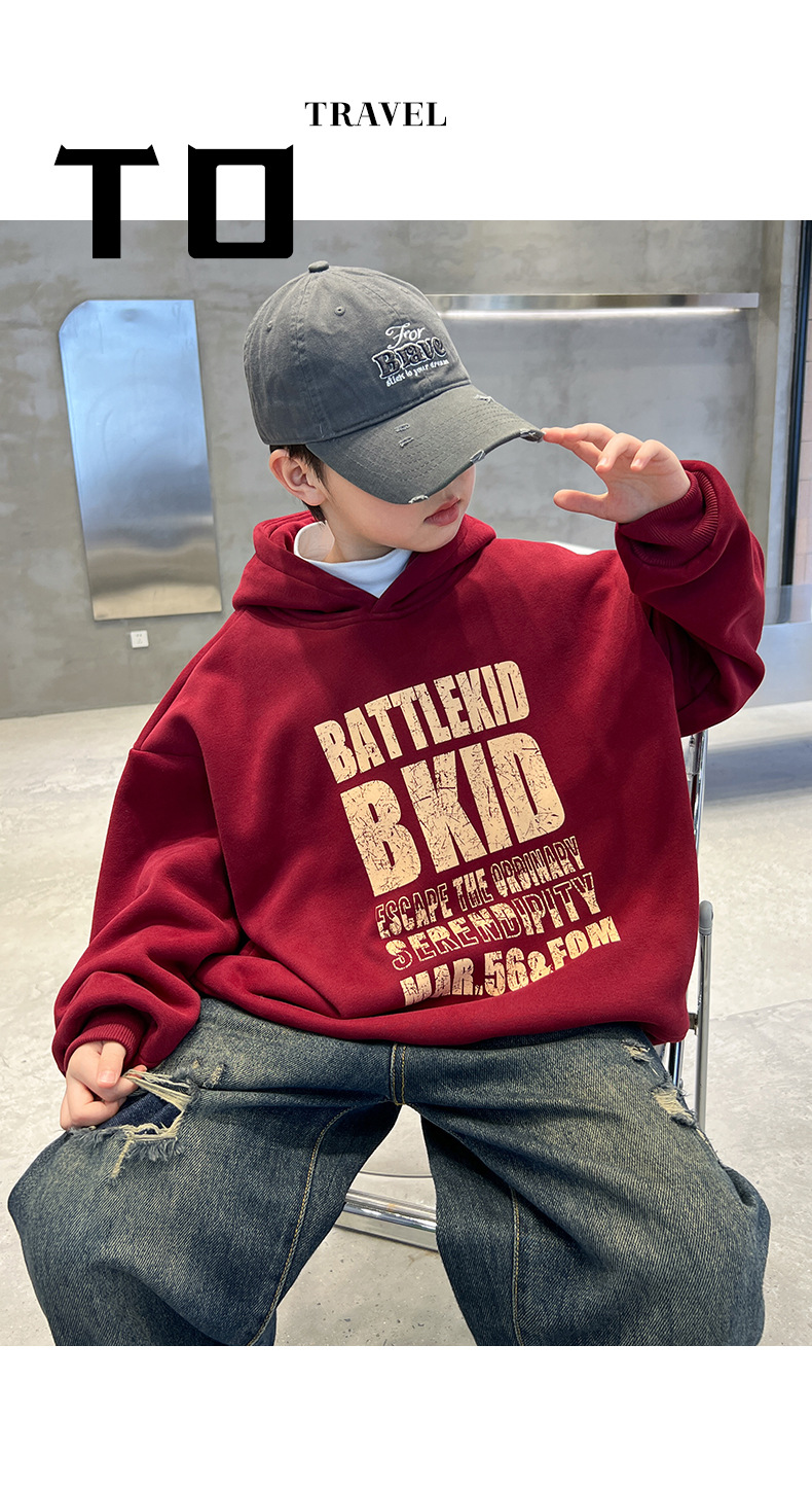 男童加绒卫衣连帽冬款2024新款大儿童装秋冬季美式一体绒红色上衣