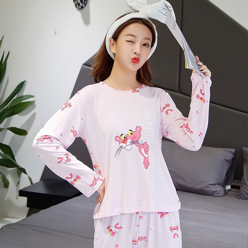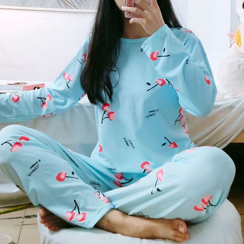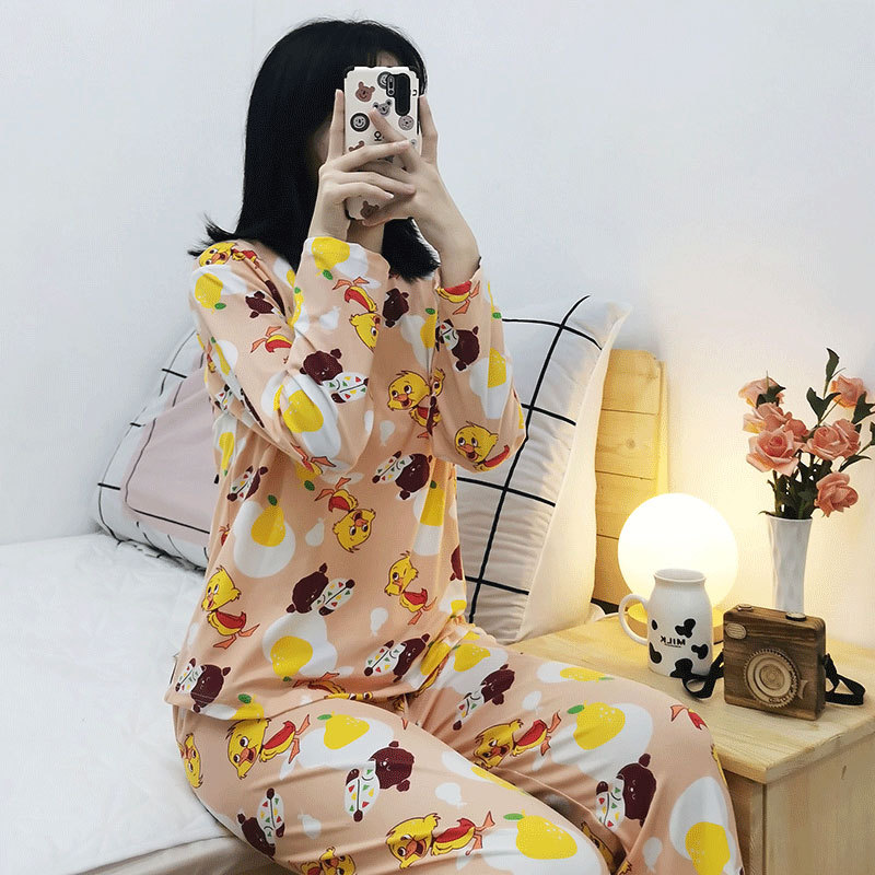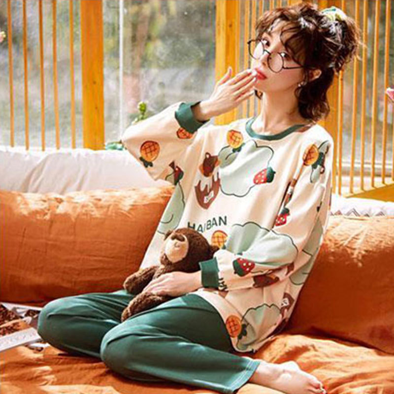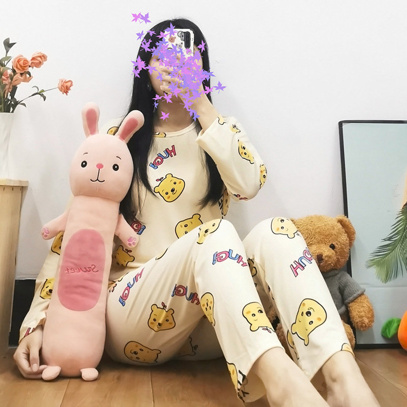 简约休闲风春秋季睡衣女韩系纯色格子控长袖可外穿宽松家居服套装