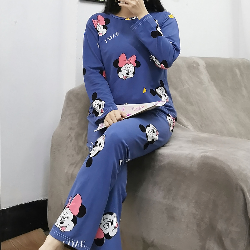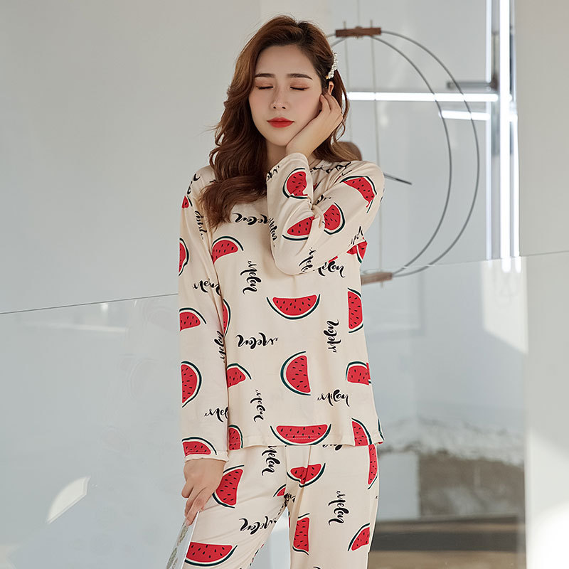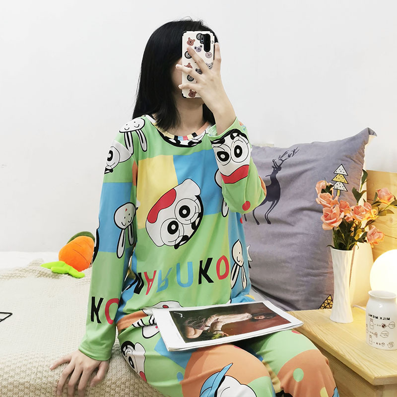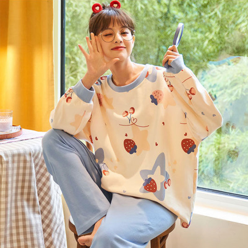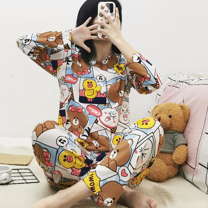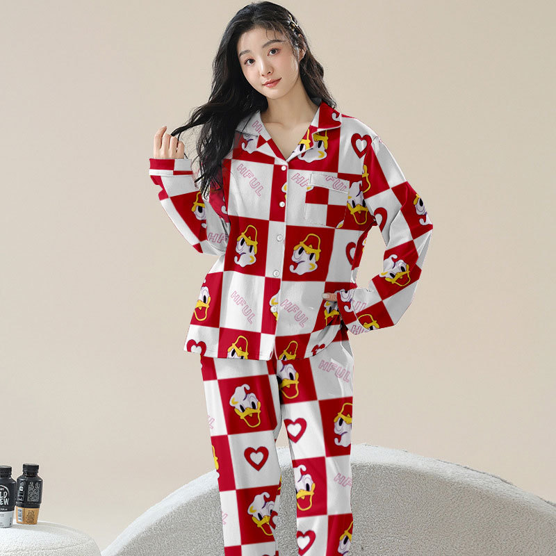 简约休闲风春秋季睡衣女韩系纯色格子控长袖可外穿宽松家居服套装