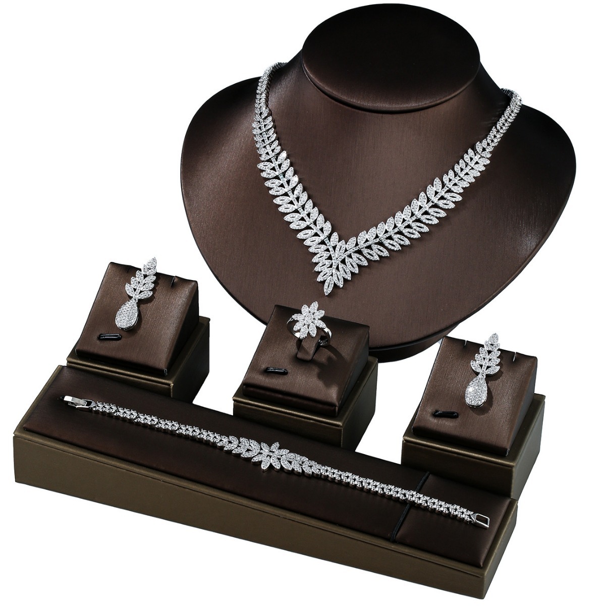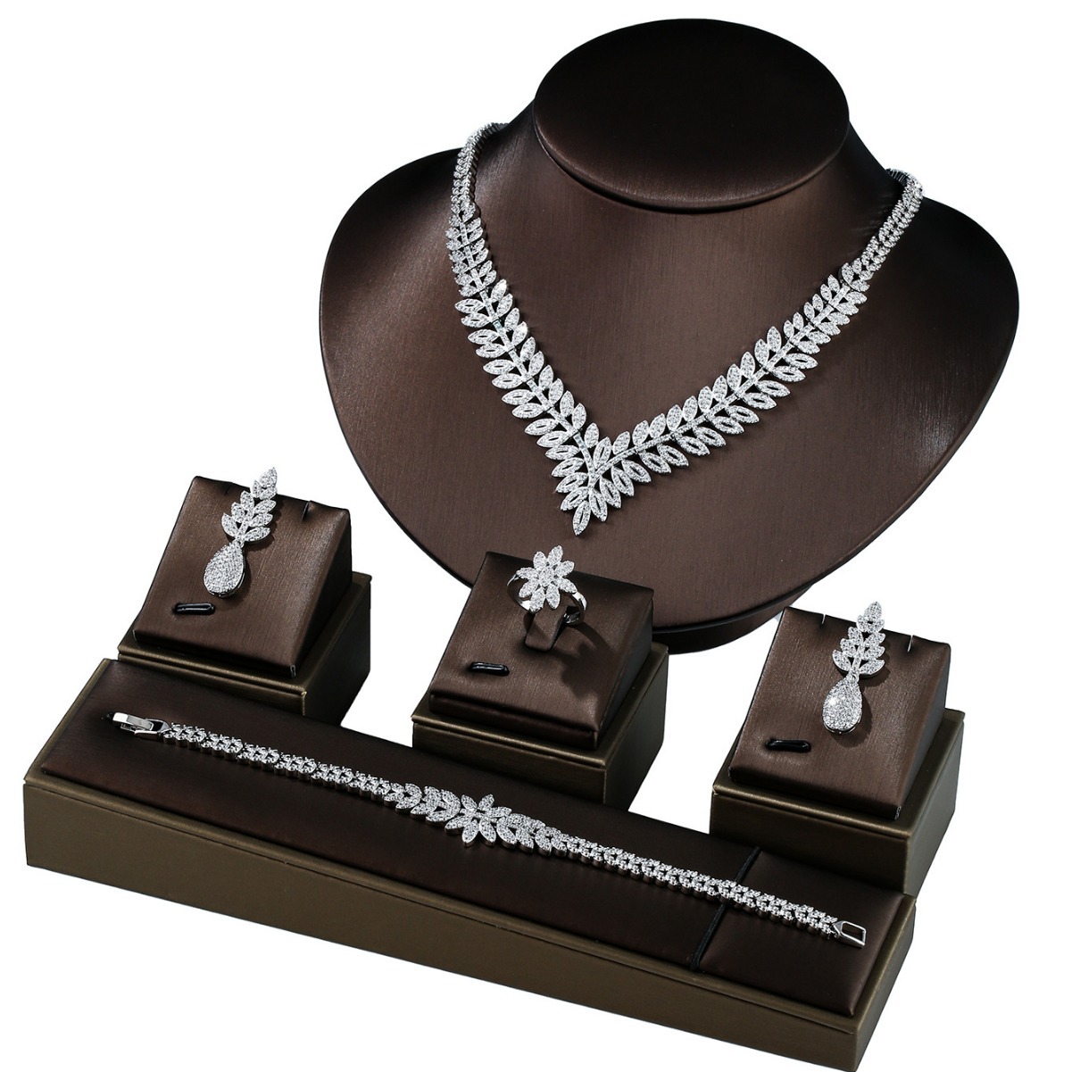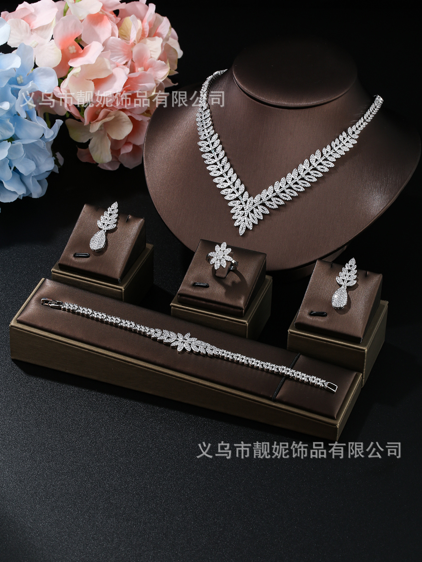 新款四件装新娘套装铜微镶锆石婚礼配饰项链耳环手链戒指