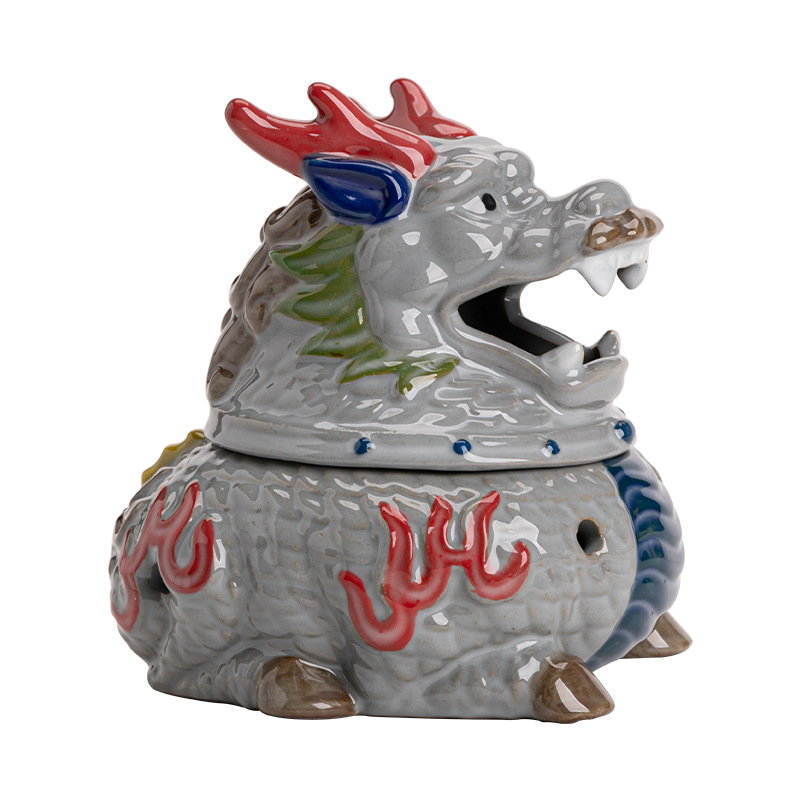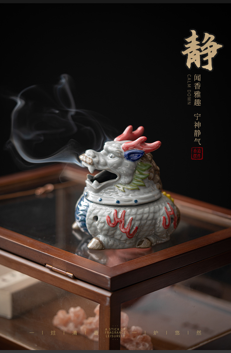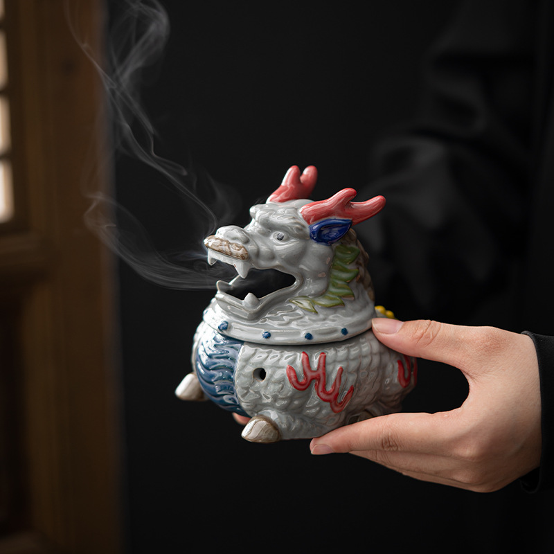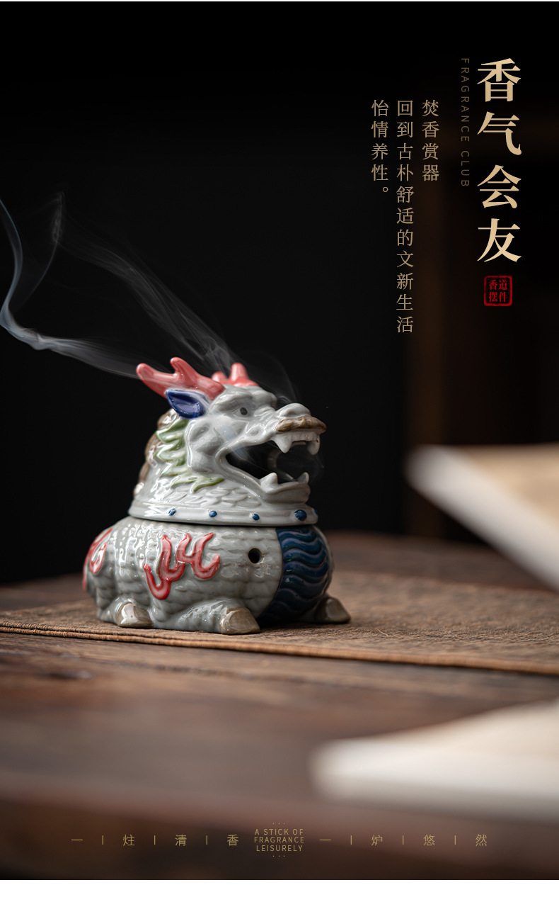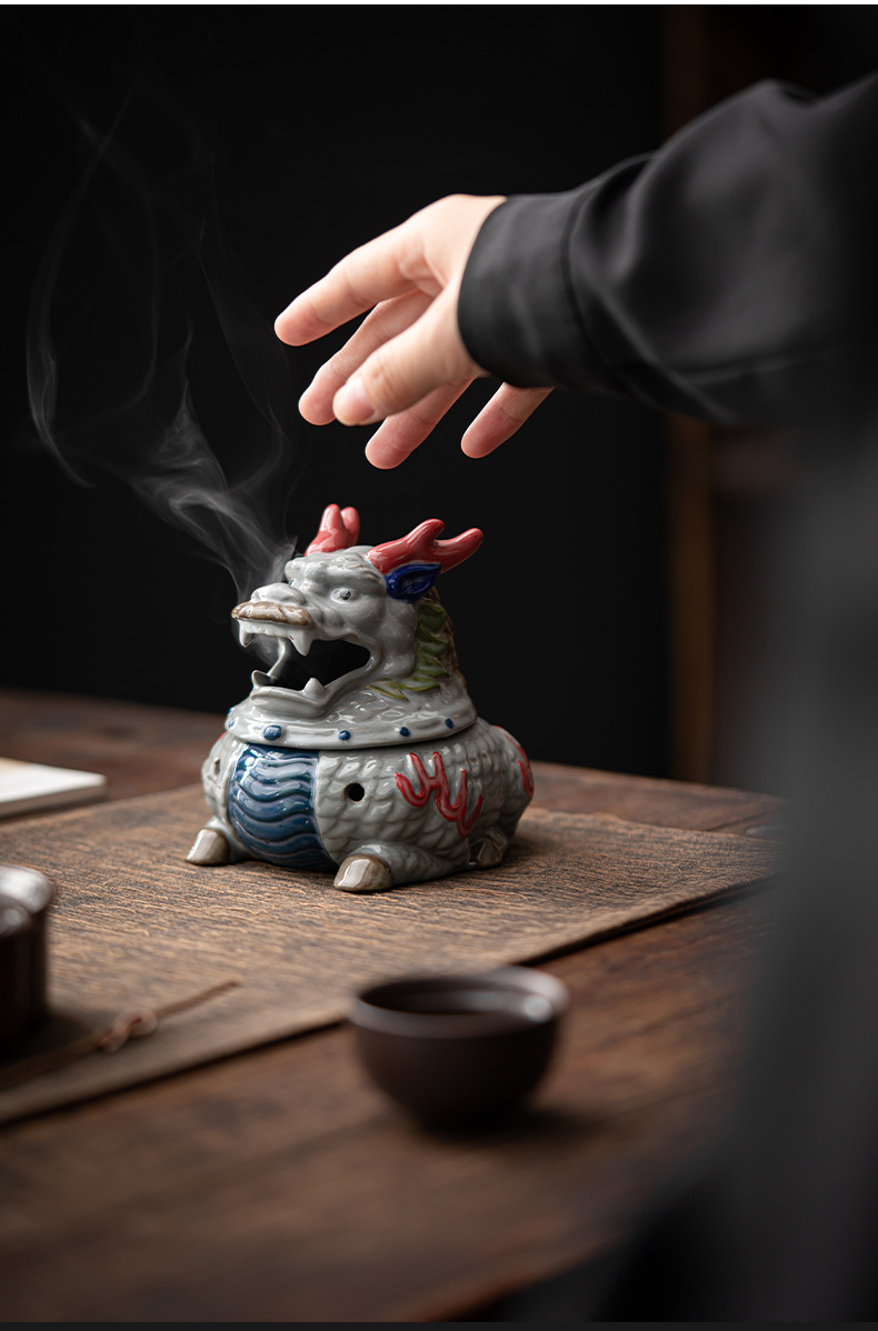 彩陶麒麟香炉 神兽古陶泥 斗彩仿古陶瓷手彩 熏香创意香薰炉香道