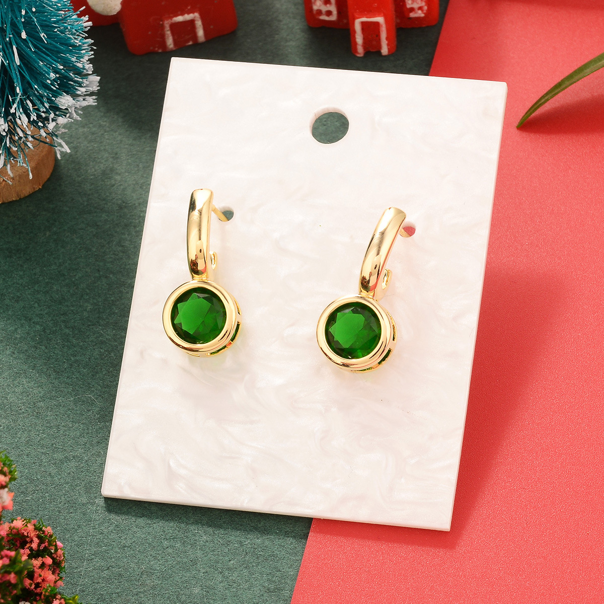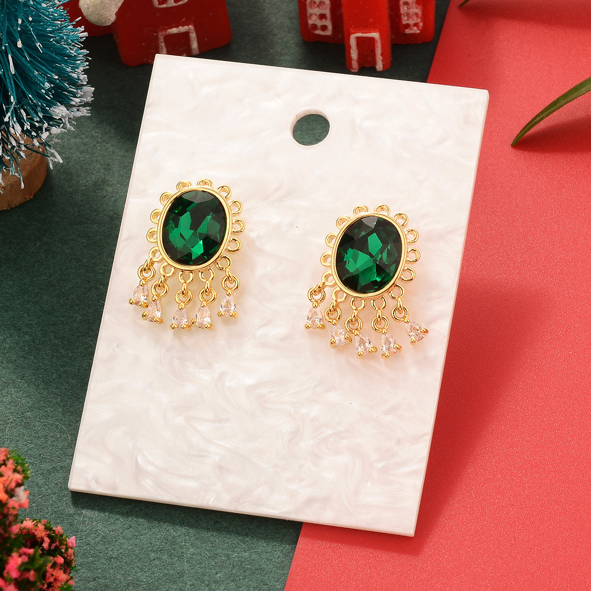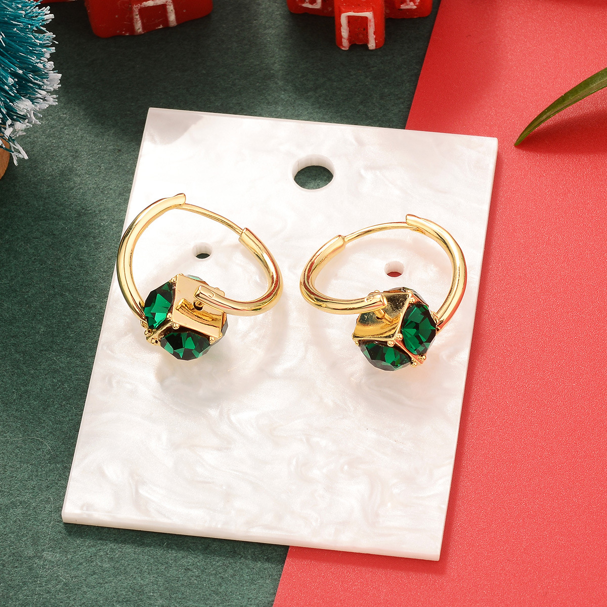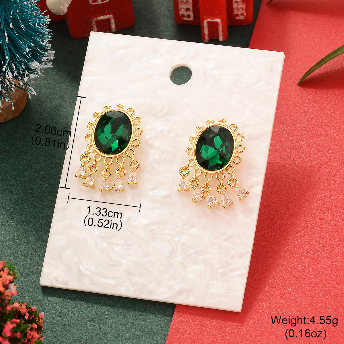 欧美圣诞节祖母绿复古铜镀真金镶锆石耳环中古Vintage高级感耳饰
