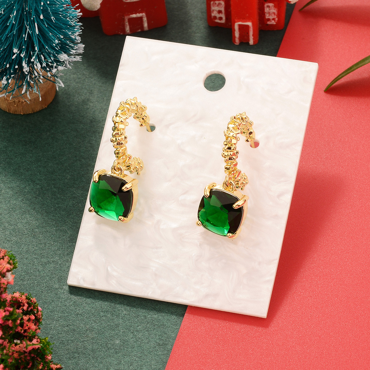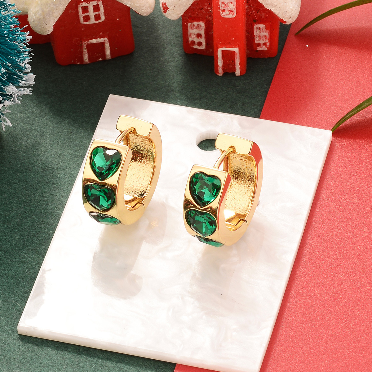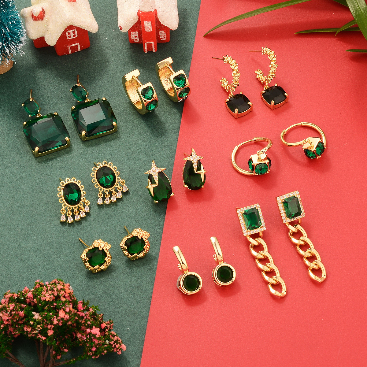 欧美圣诞节祖母绿复古铜镀真金镶锆石耳环中古Vintage高级感耳饰