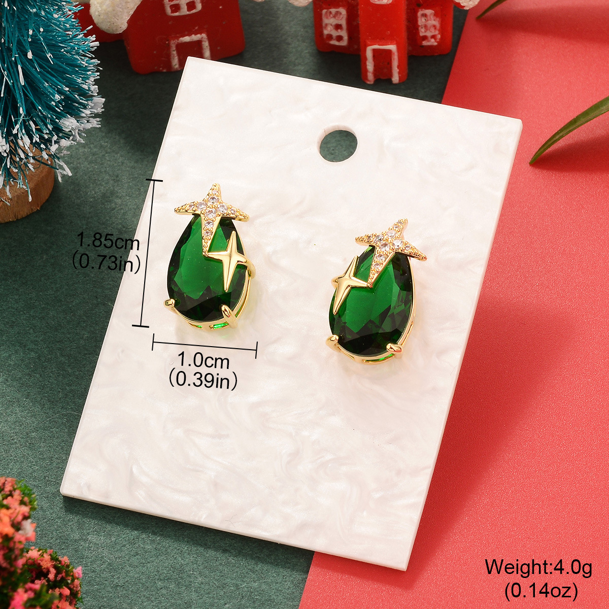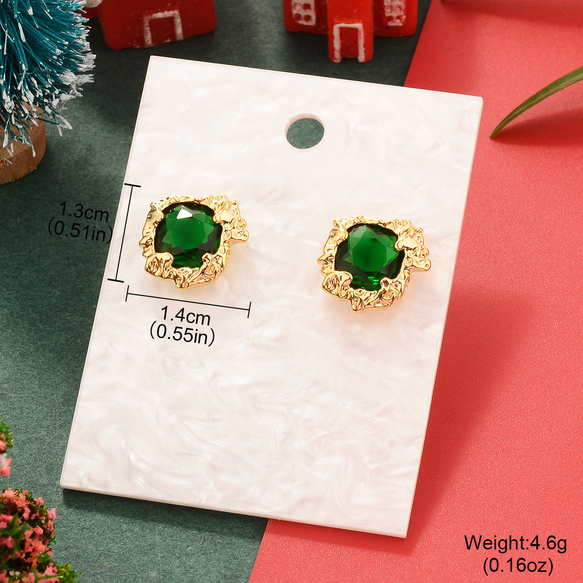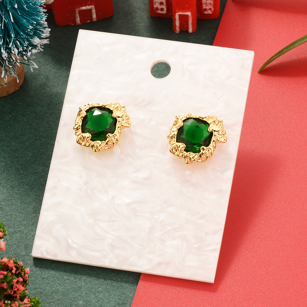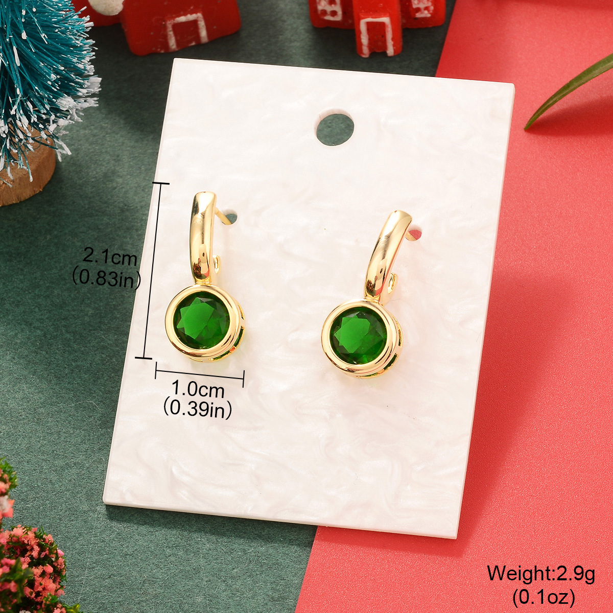 欧美圣诞节祖母绿复古铜镀真金镶锆石耳环中古Vintage高级感耳饰