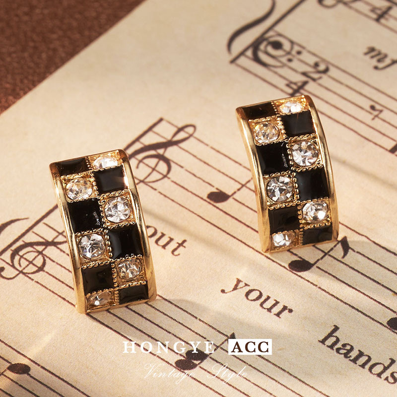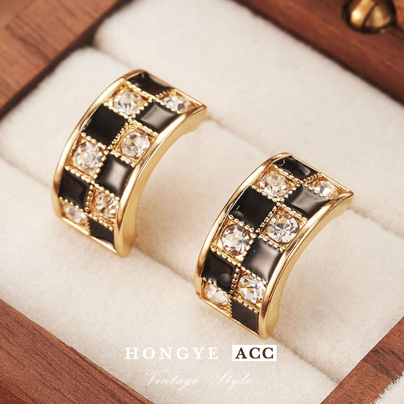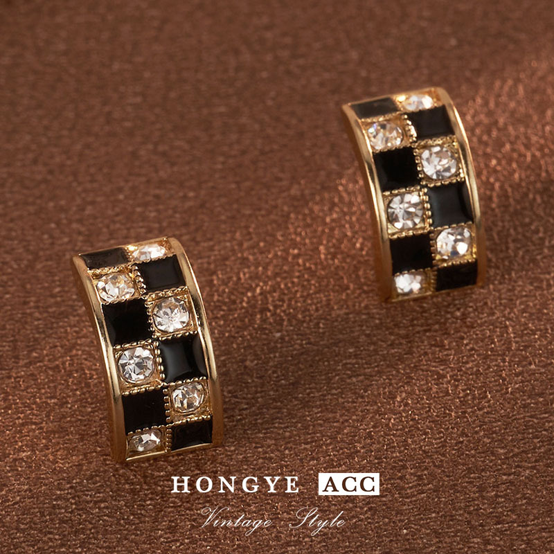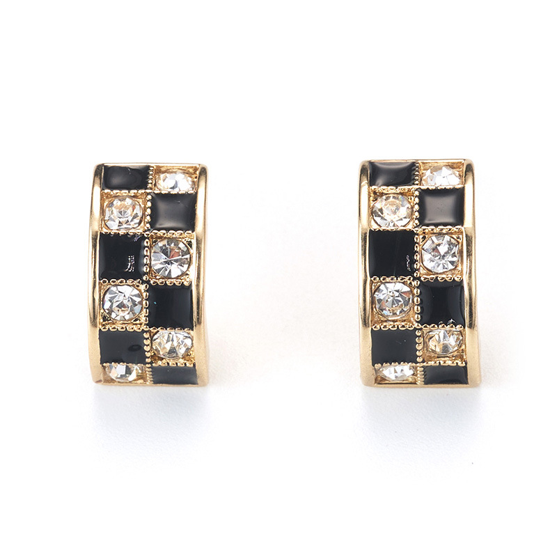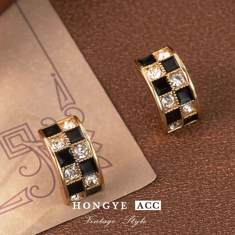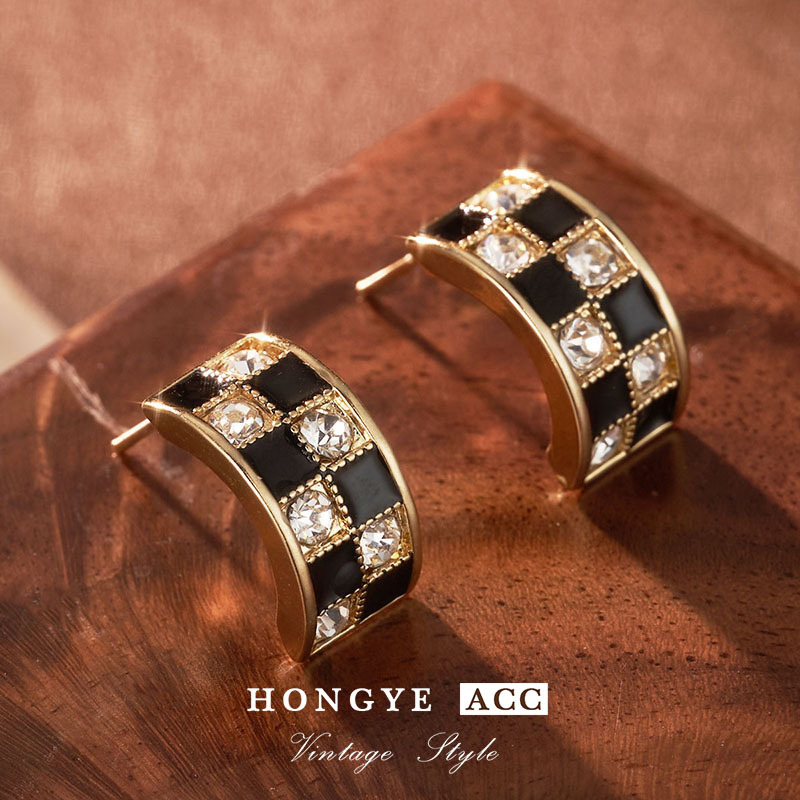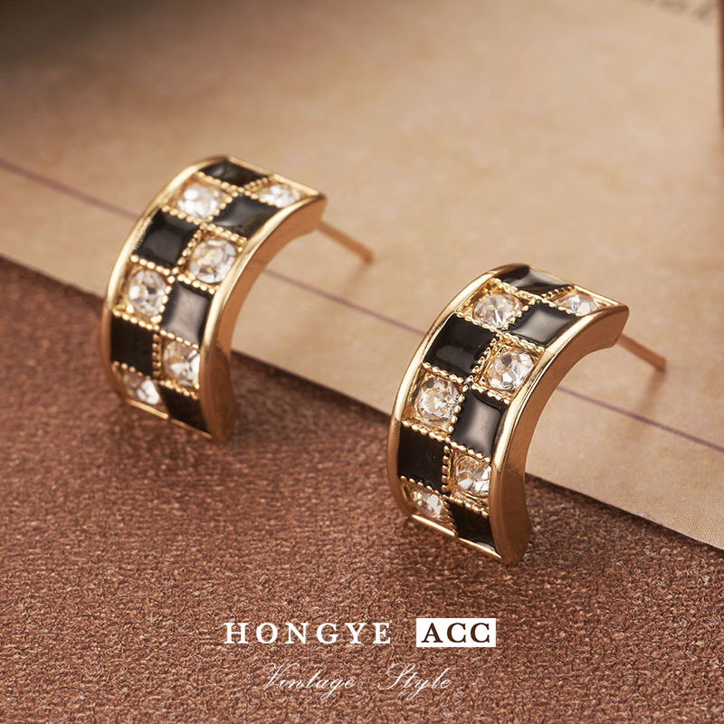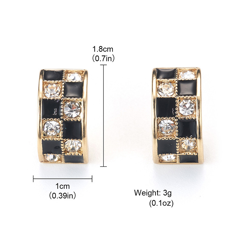 经典黑白格C字小香风时尚百搭高级感合金镀14K金镶锆耳环批发耳饰