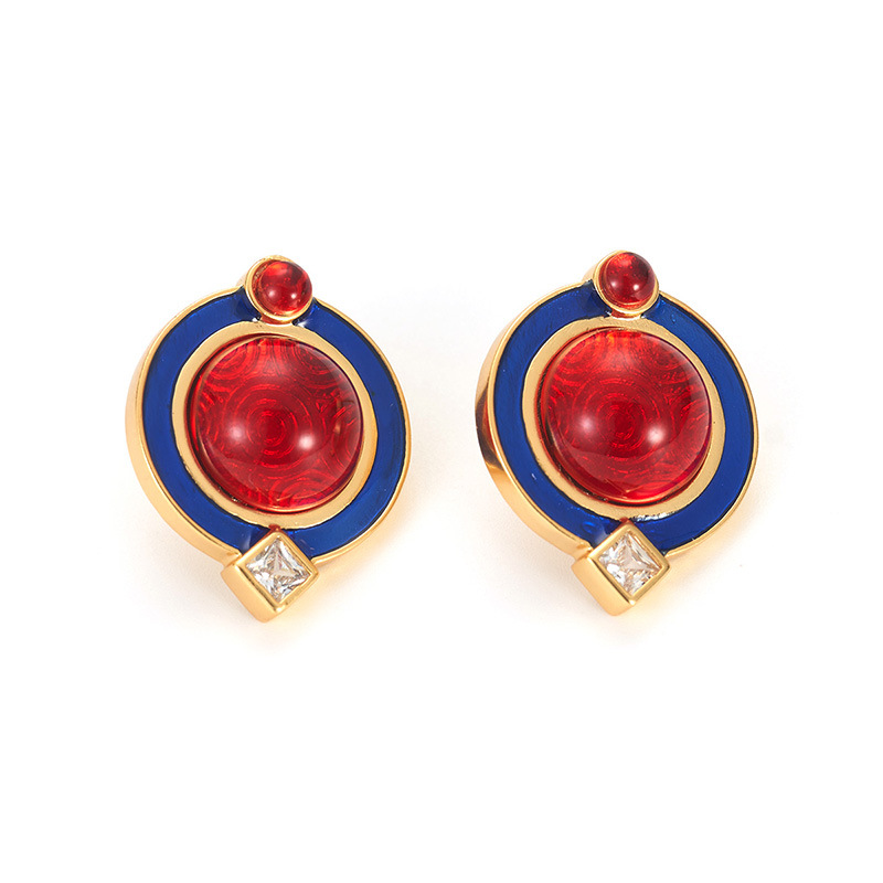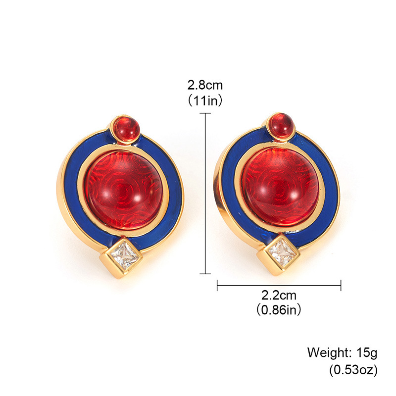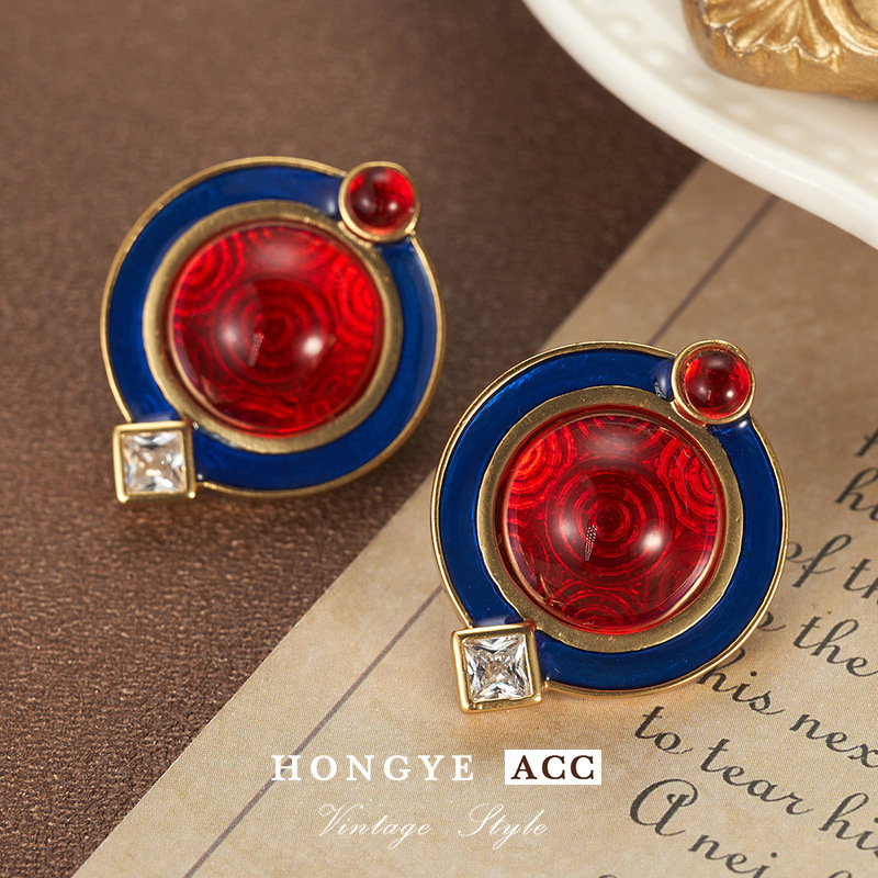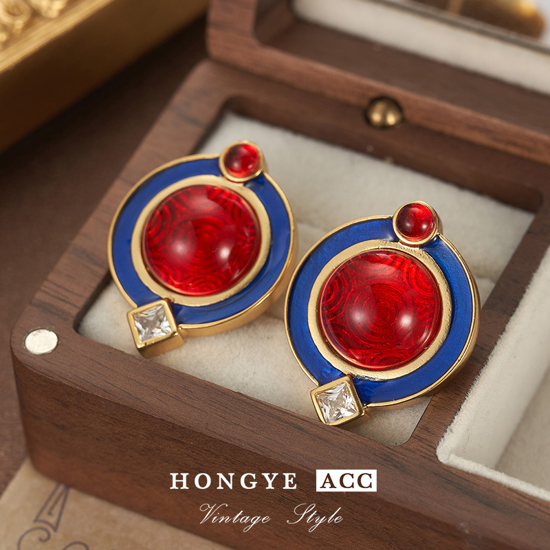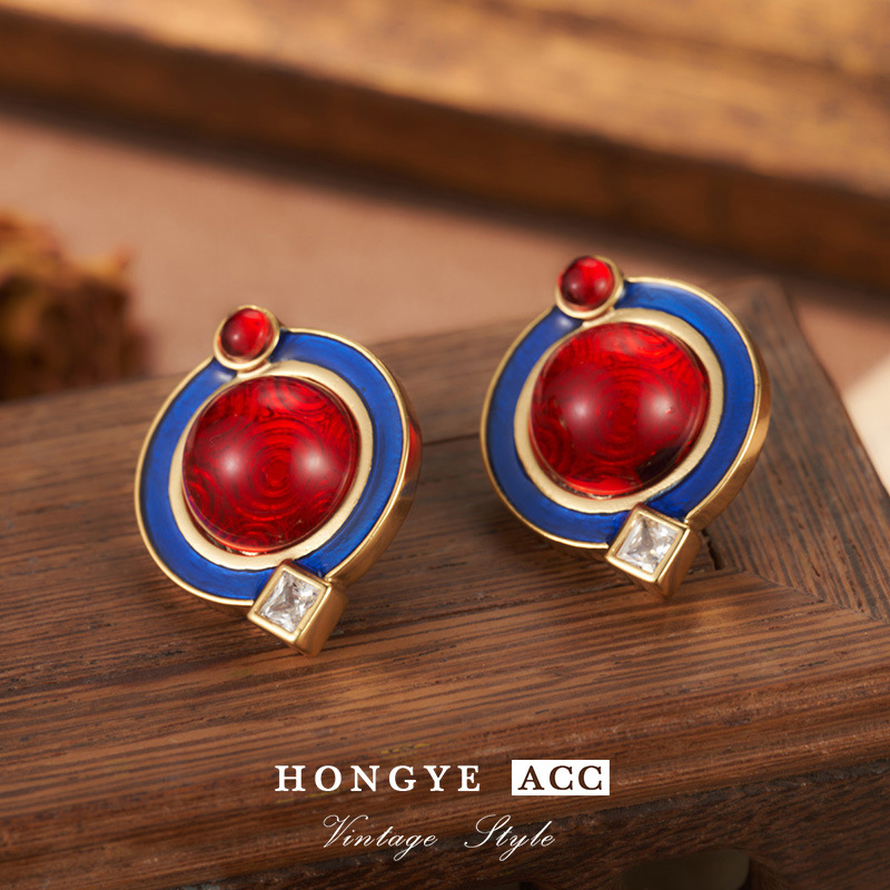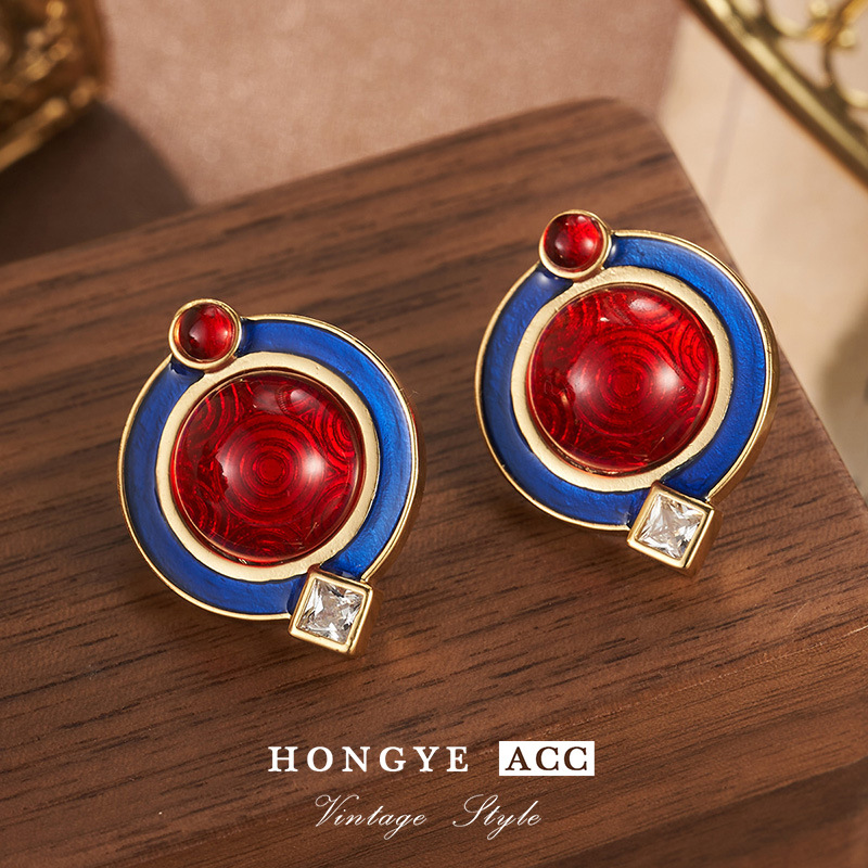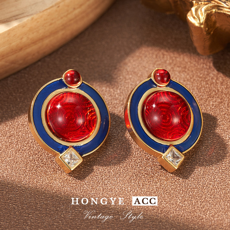 复古镶钻耳饰925银针小众宫廷风高级感红蓝配色时尚个性耳环批发