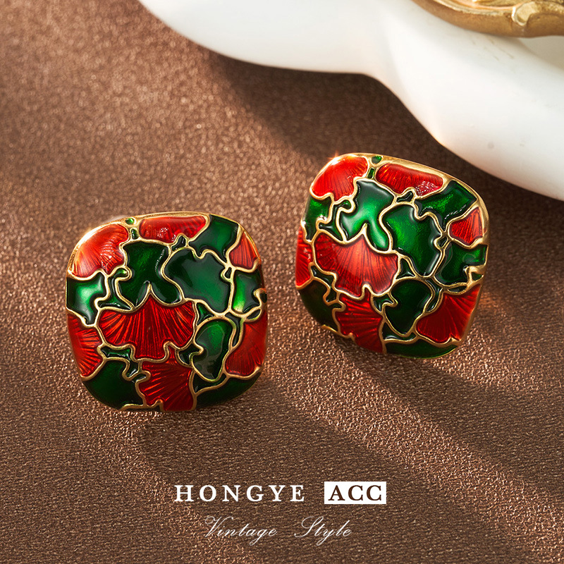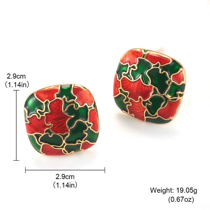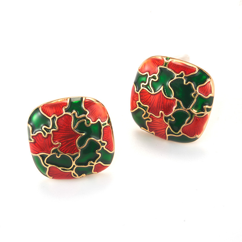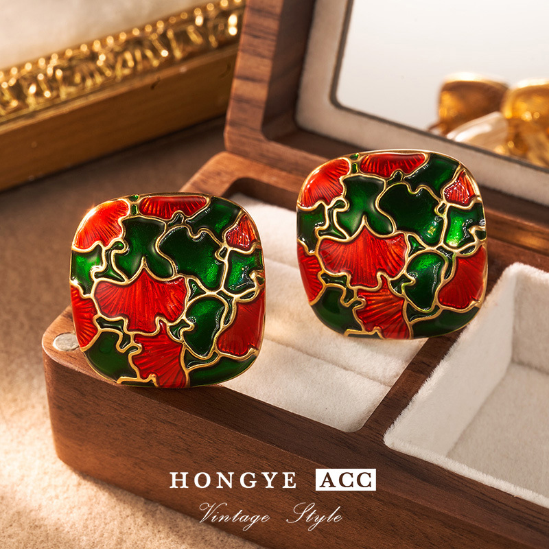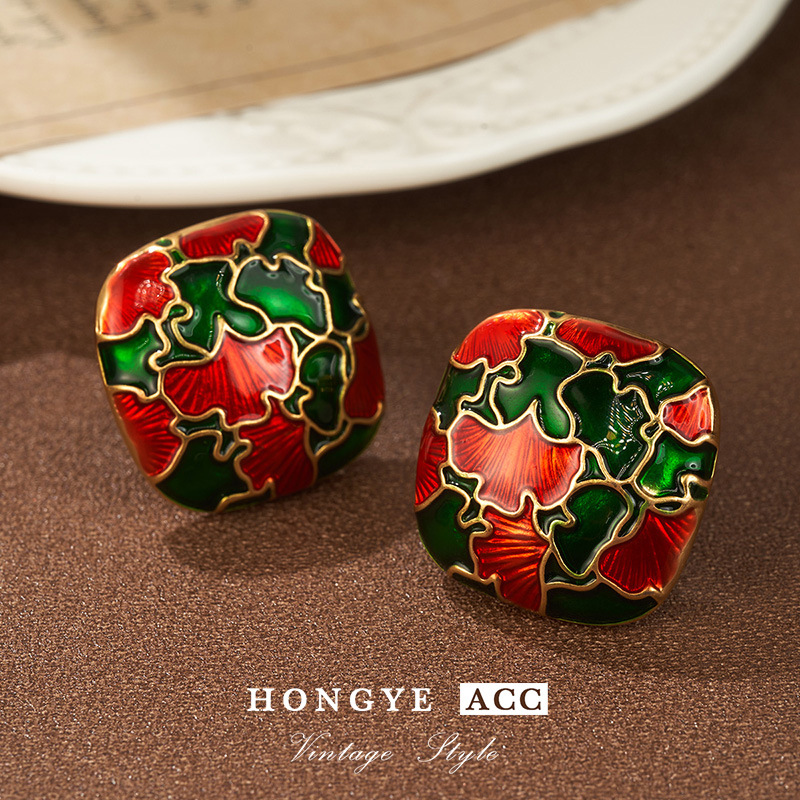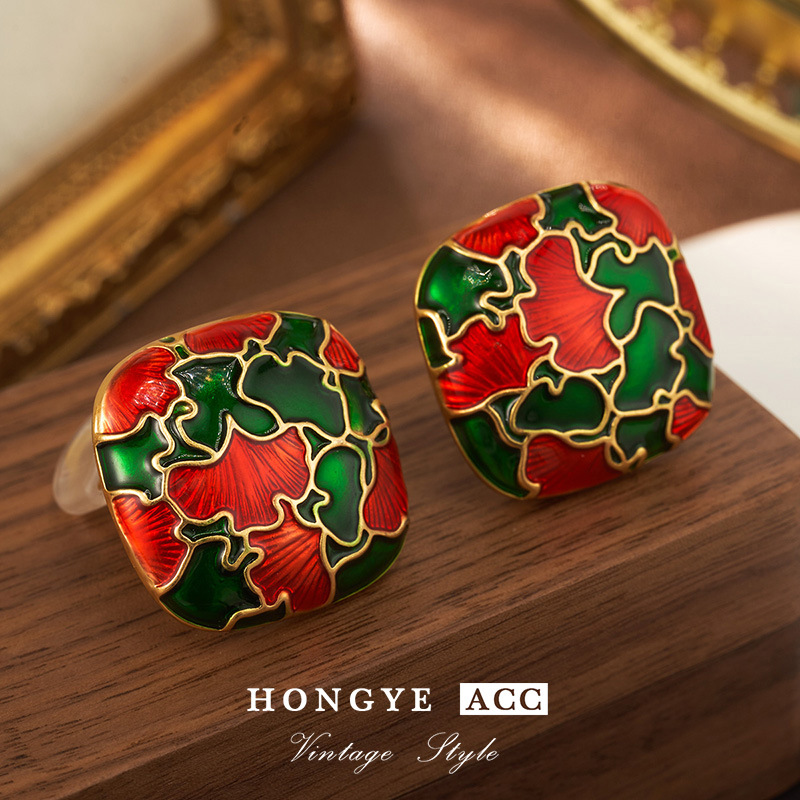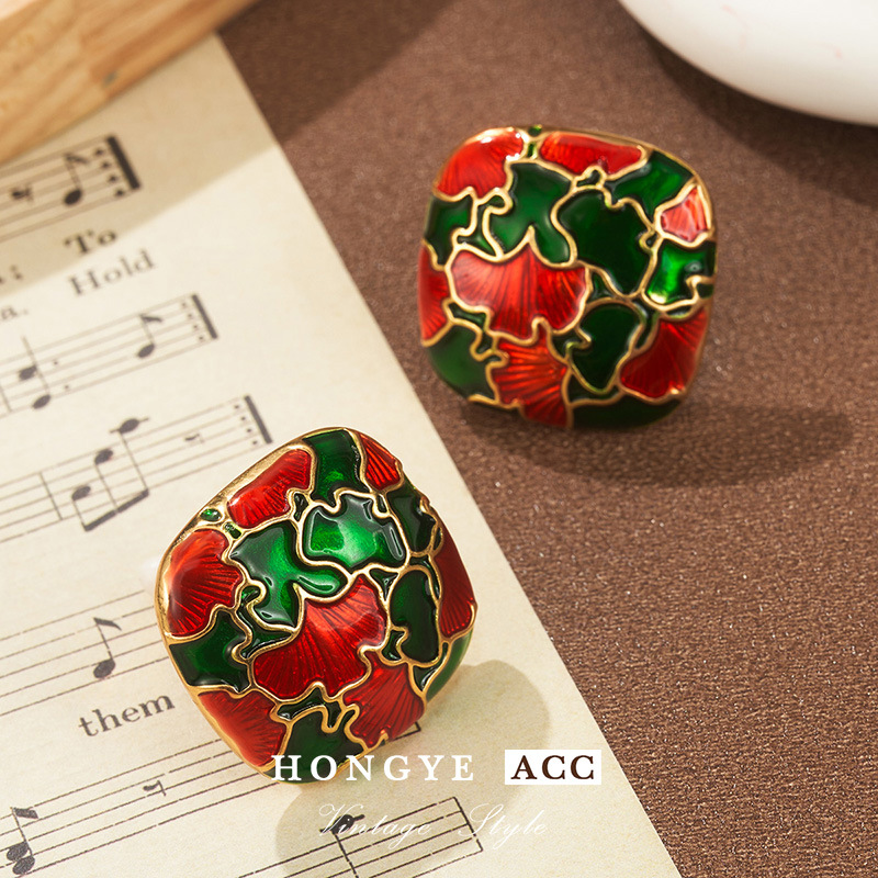 红绿正方耳夹中古vintage文艺复古宫廷风春夏耳饰珐琅不规则图案