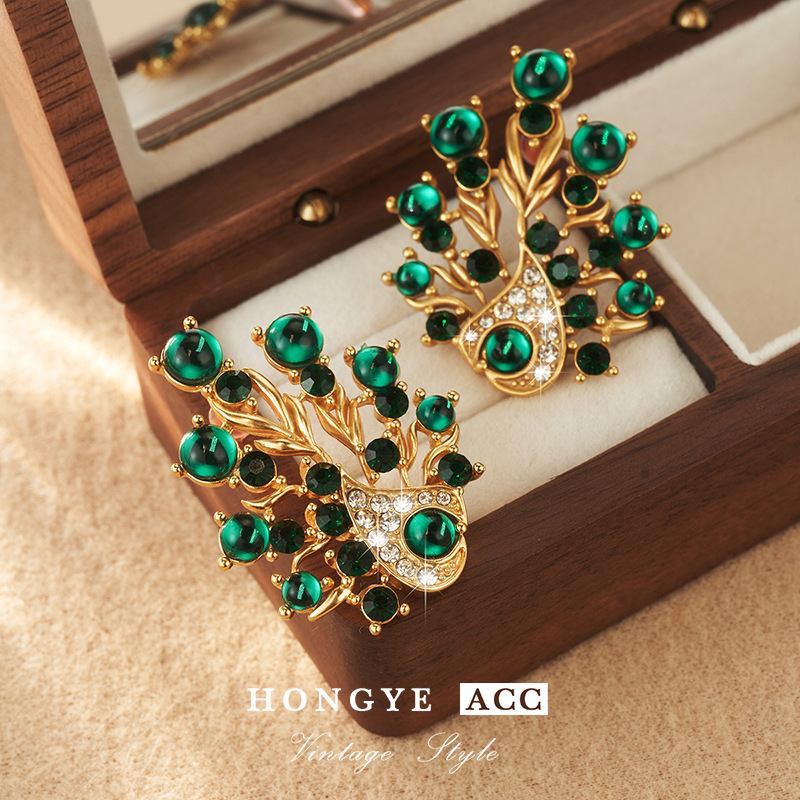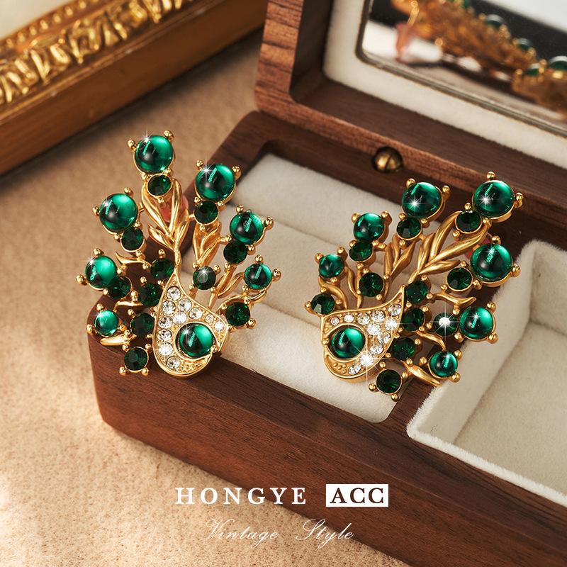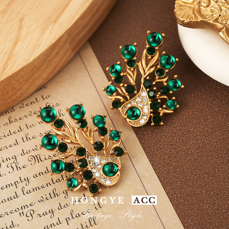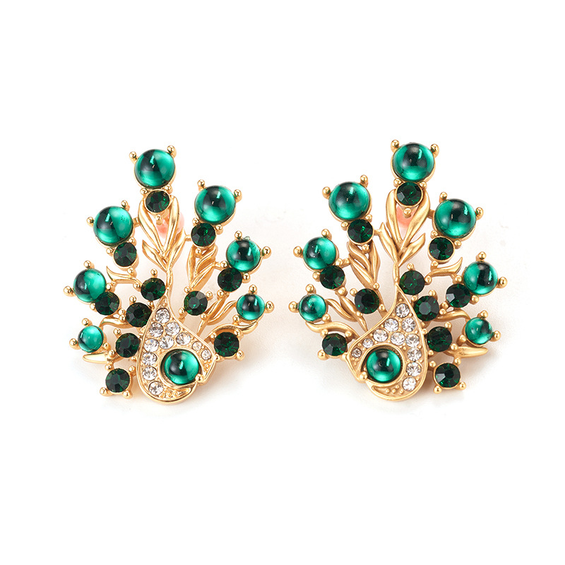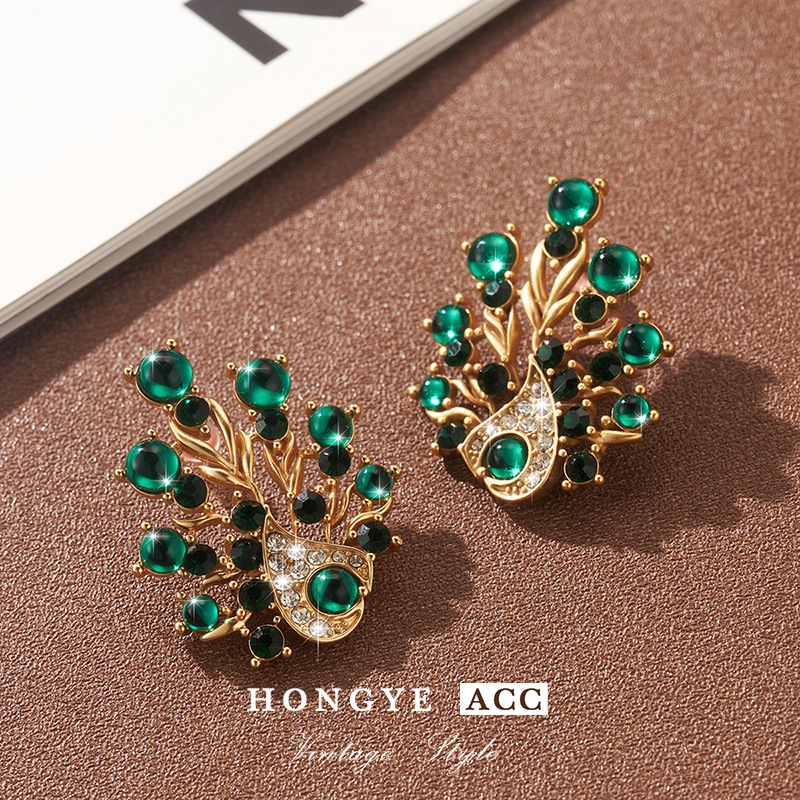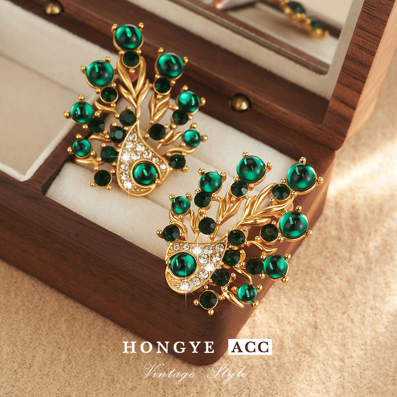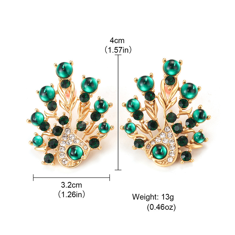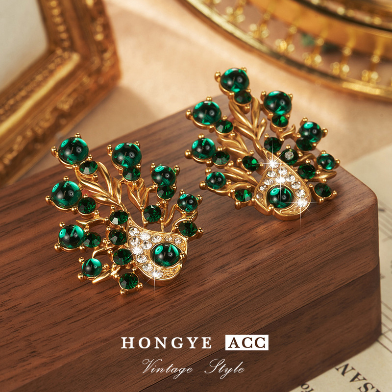 复古镶钻耳饰孔雀夸张耳钉高级Vintage饰品时尚925耳环新流苏