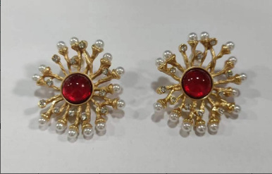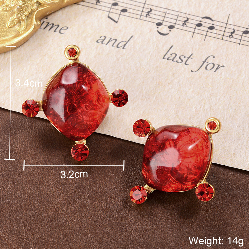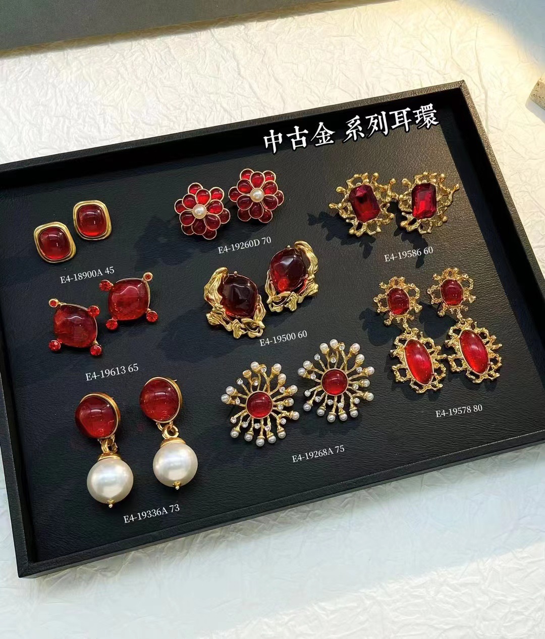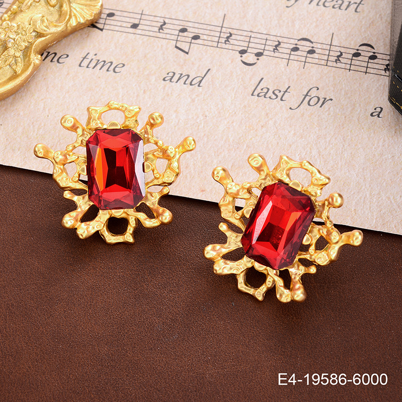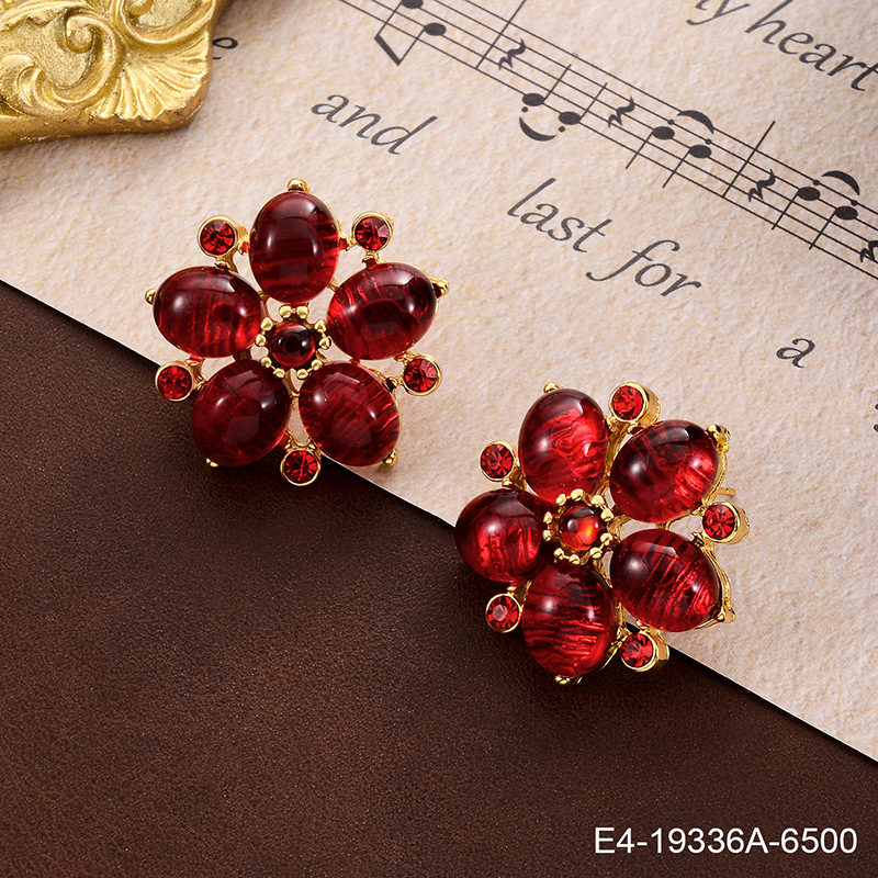 春夏新款中古vintage饰品珍珠红色莱茵石花朵几何耳环小众设计女
