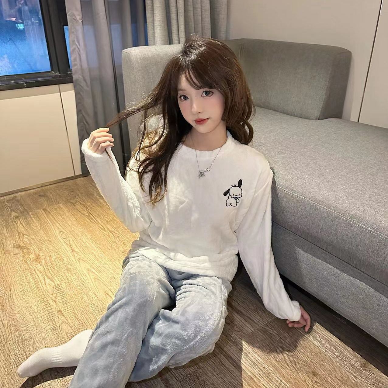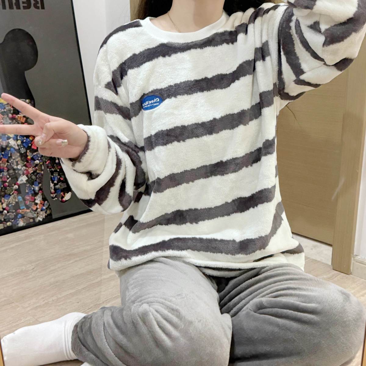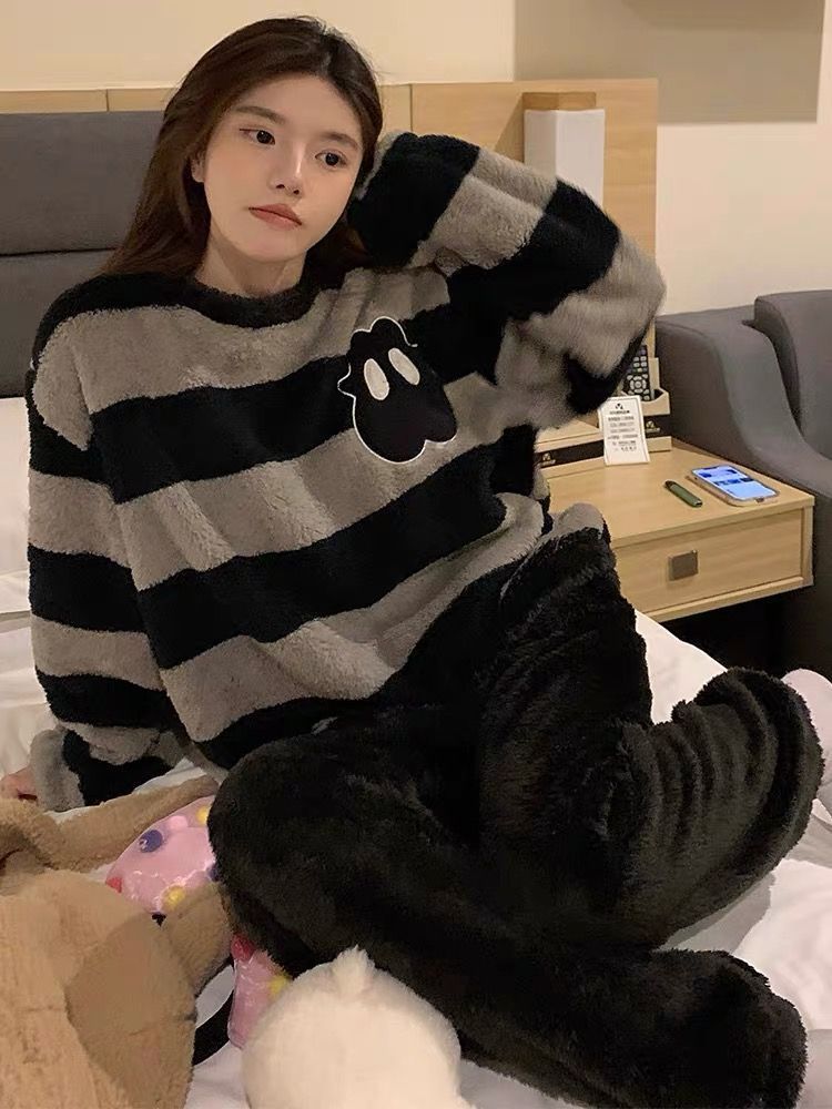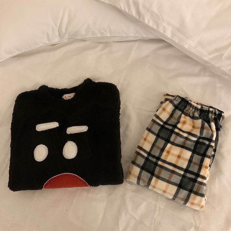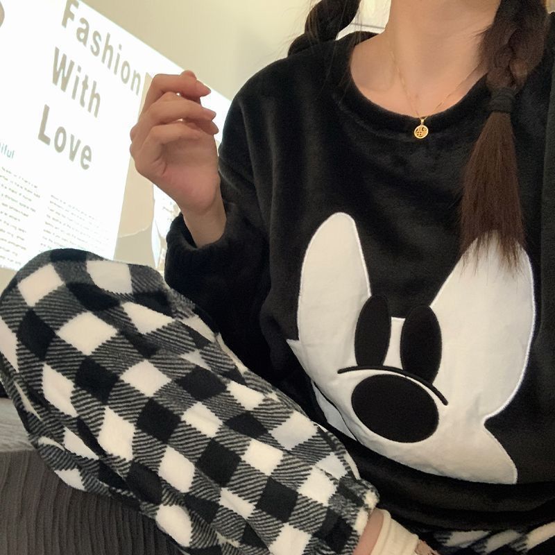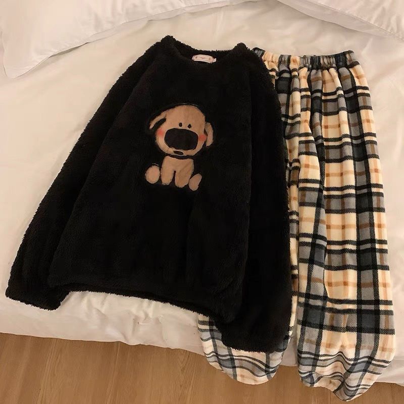圆领可爱高级睡衣套装家居服卡通新款两件套珊瑚格子高级绒秋冬女
