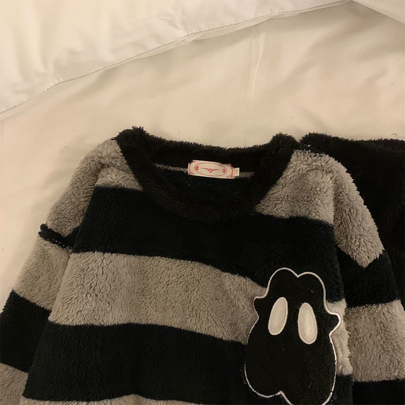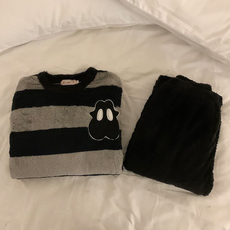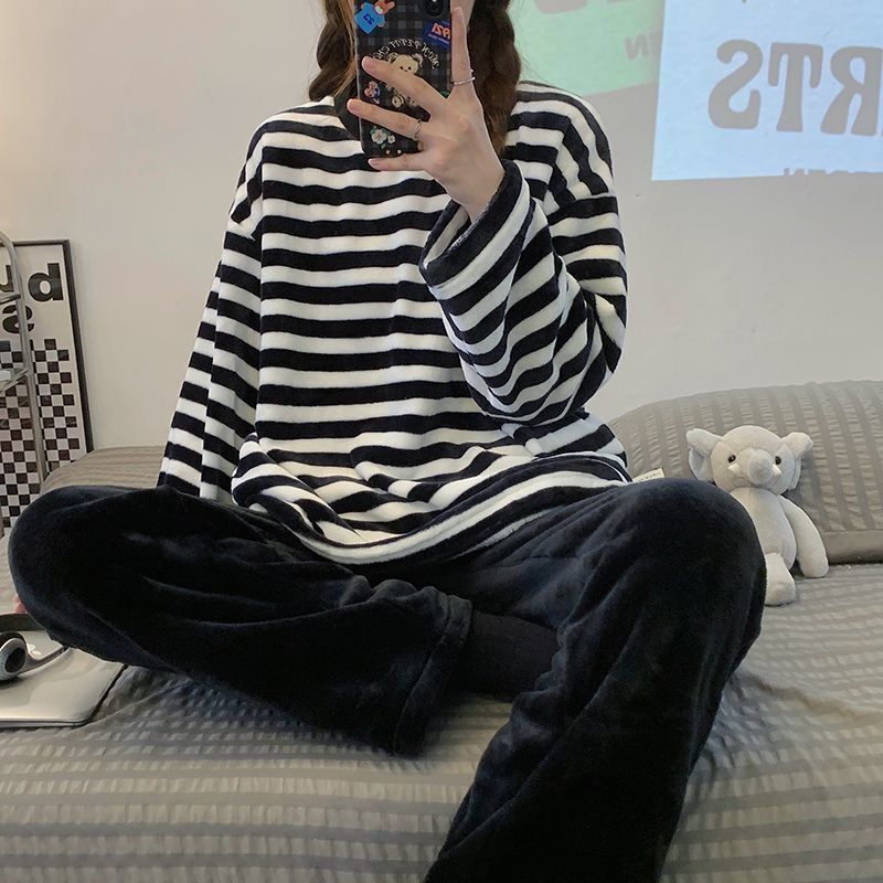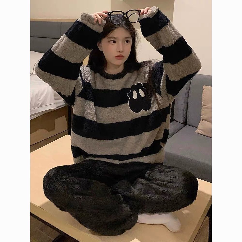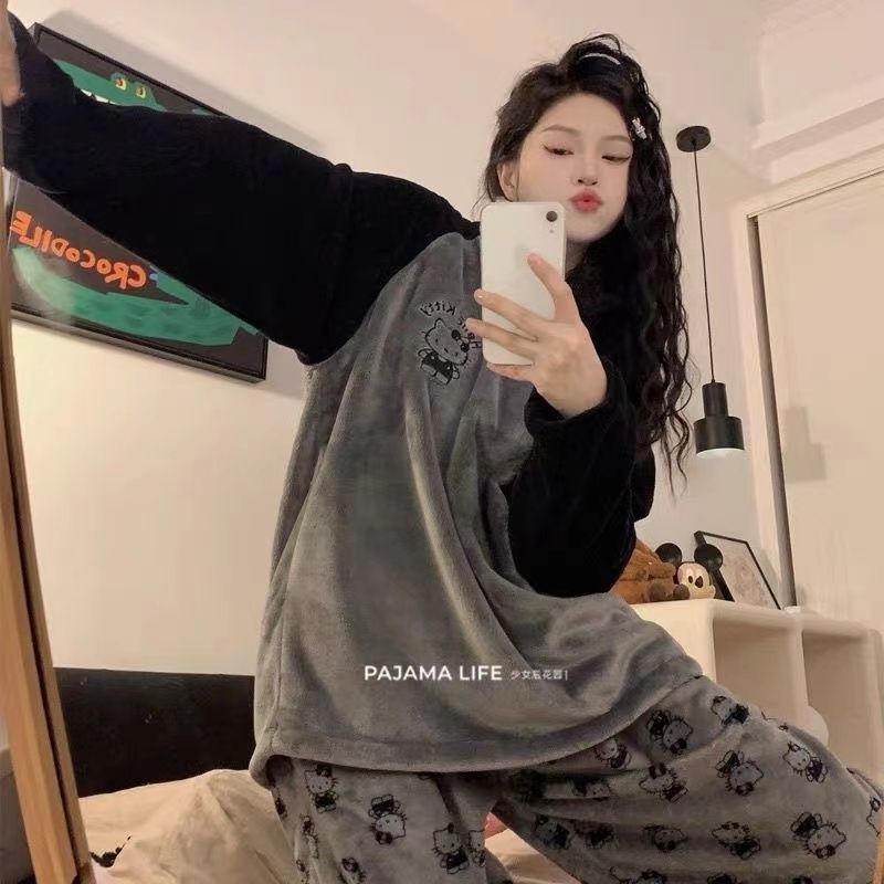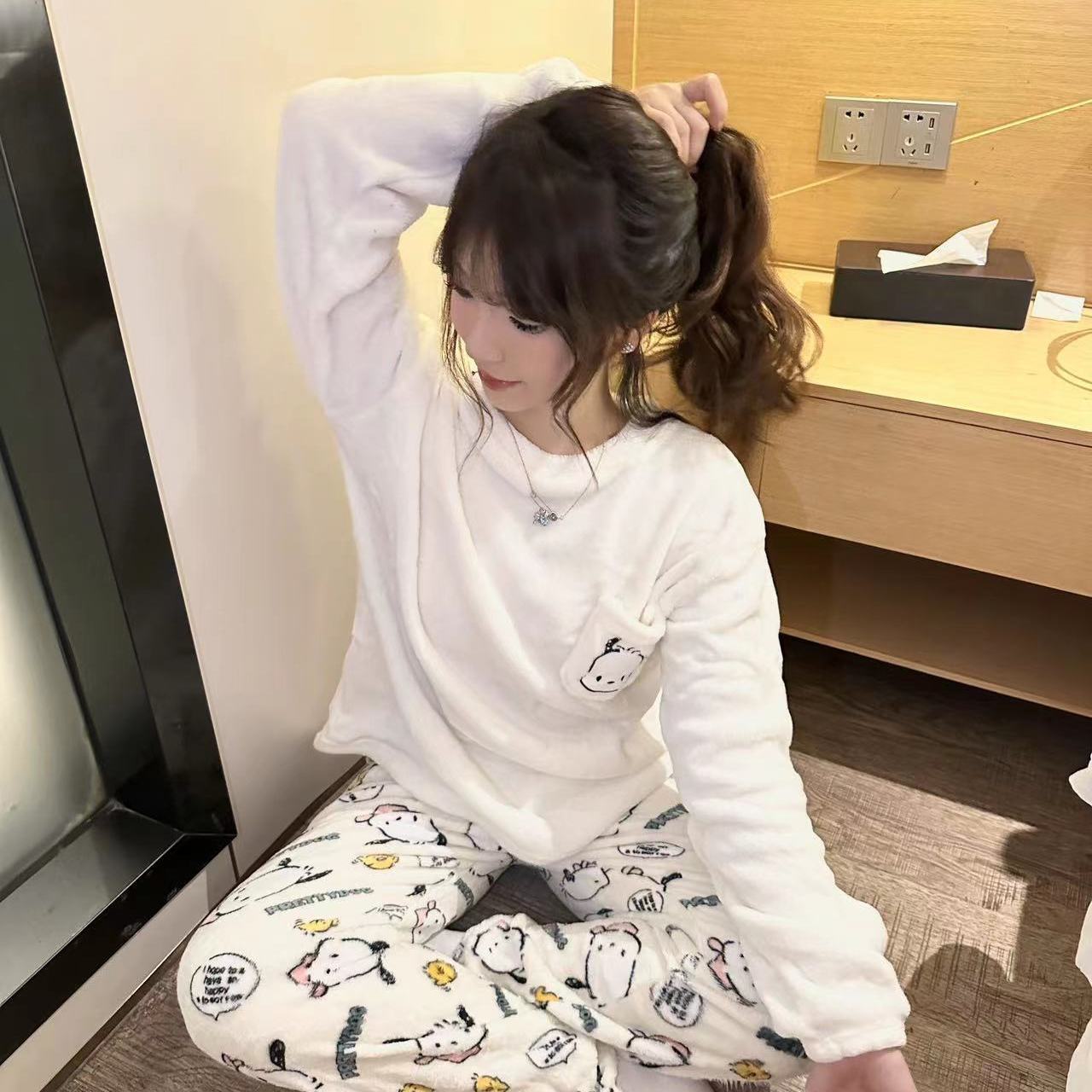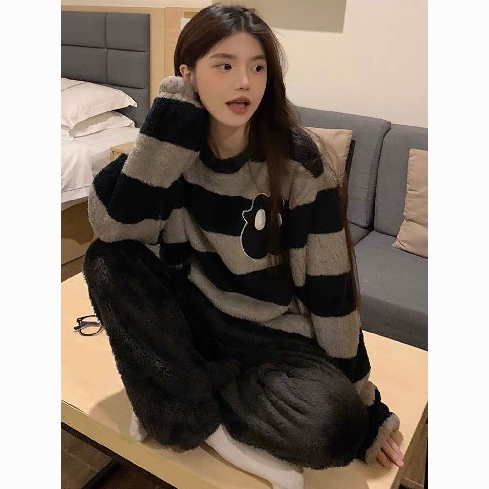圆领可爱高级睡衣套装家居服卡通新款两件套珊瑚格子高级绒秋冬女