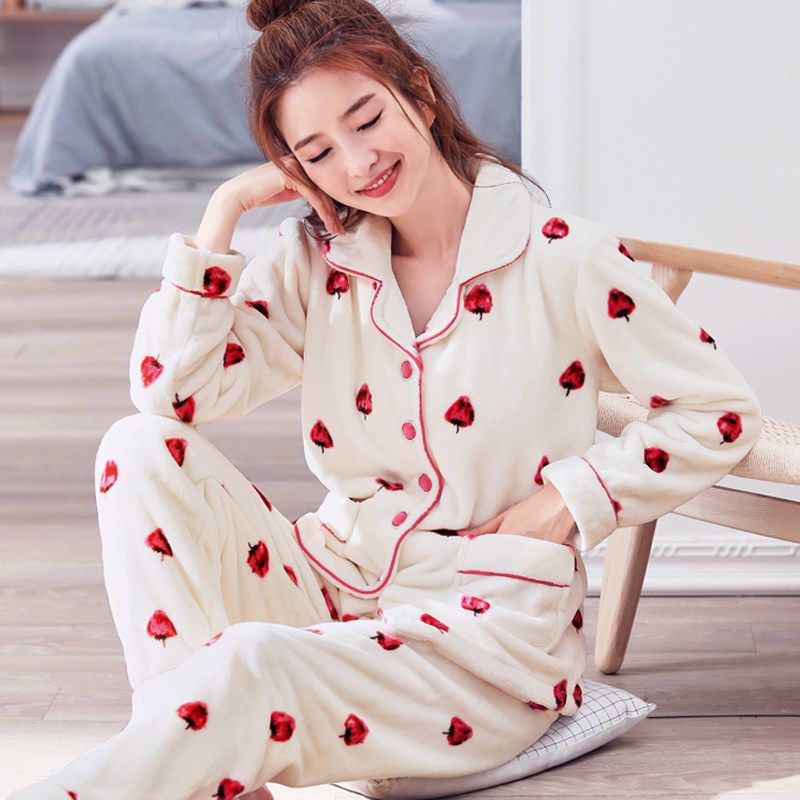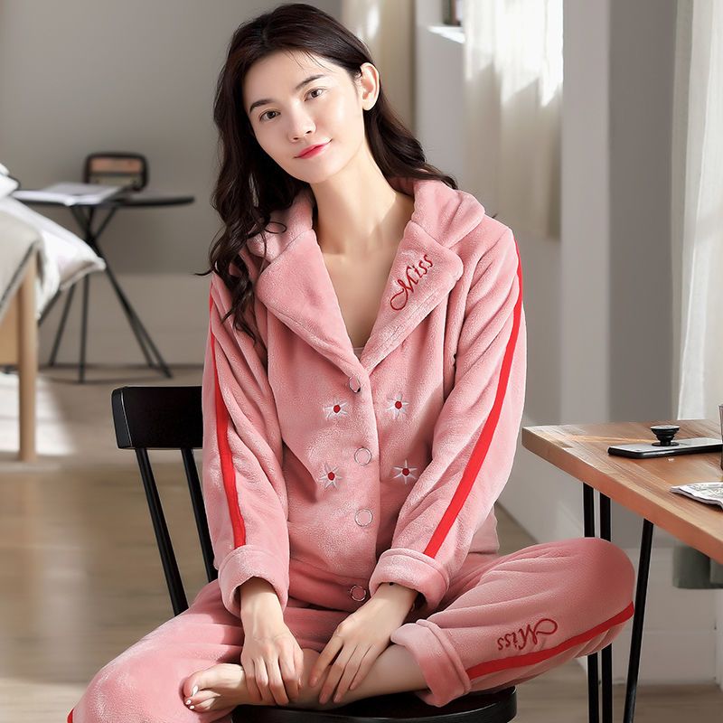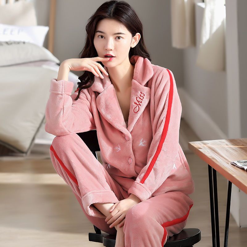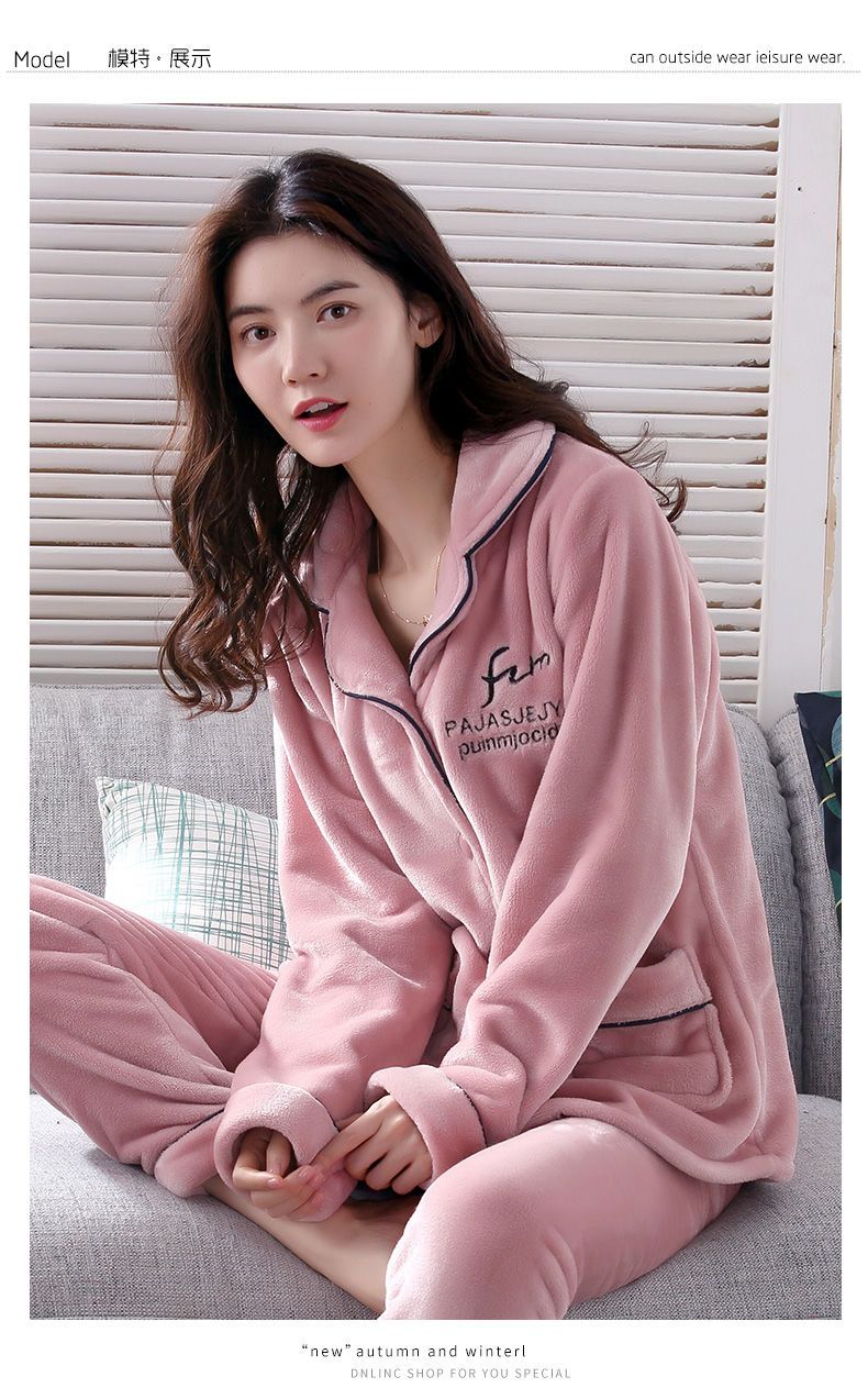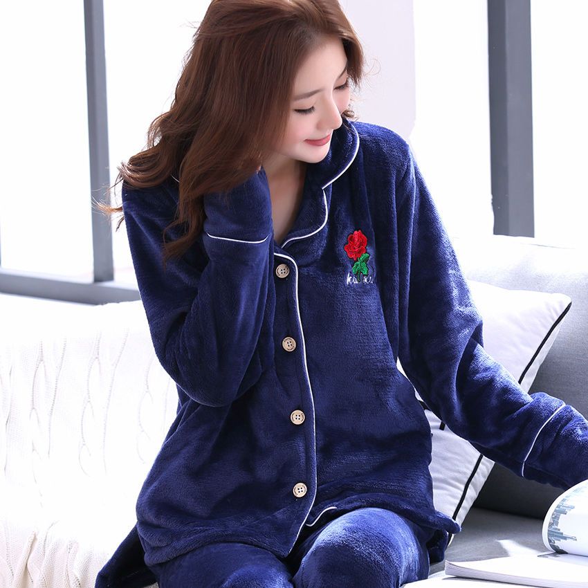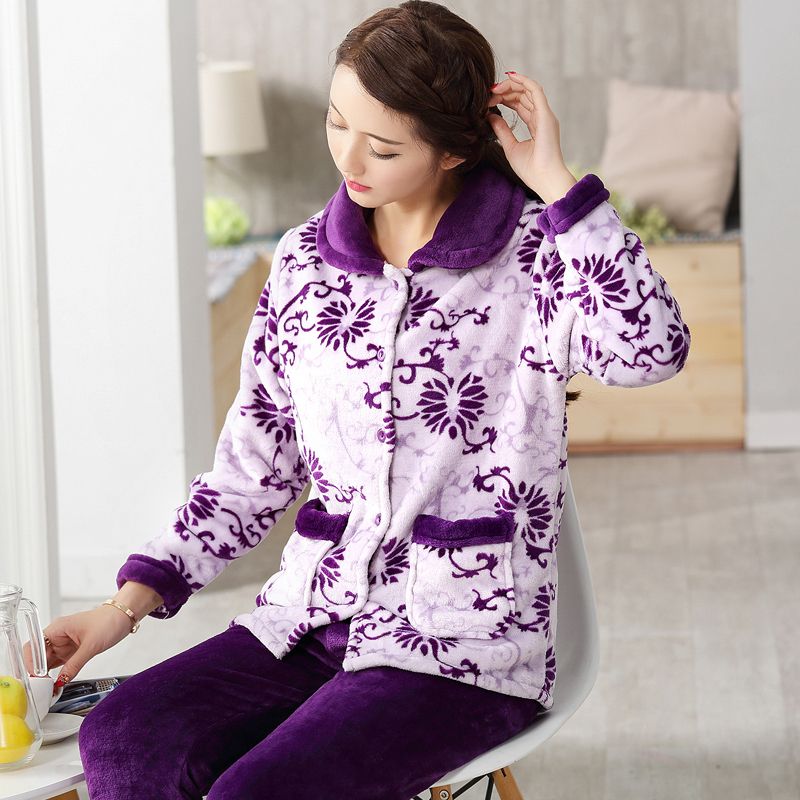 秋冬季珊瑚绒睡衣女冬加厚女士中年加绒法兰绒保暖内衣套装家居服