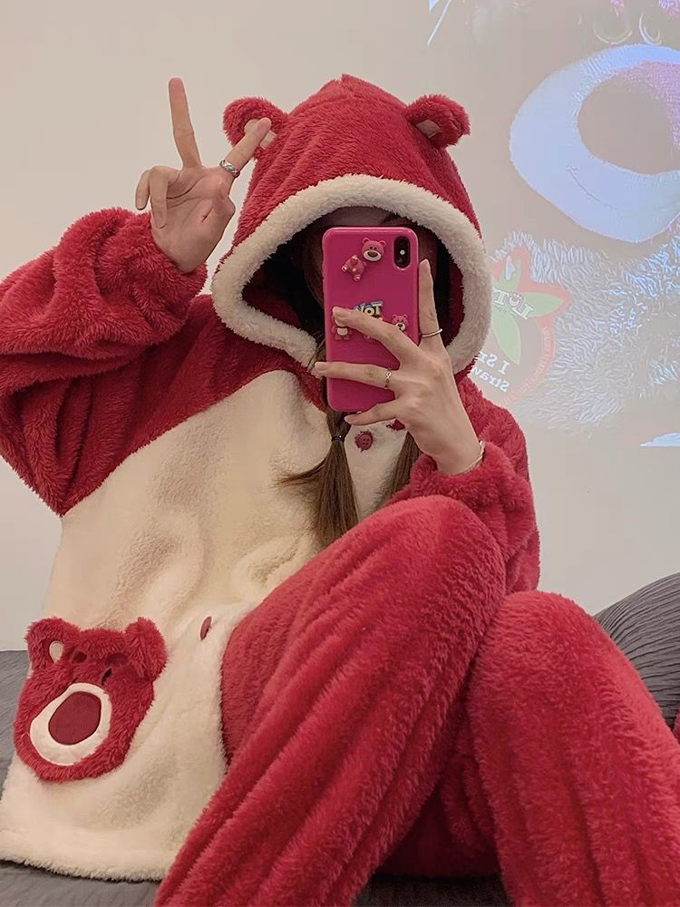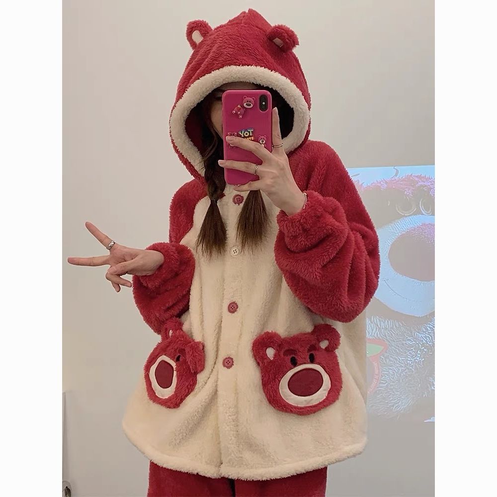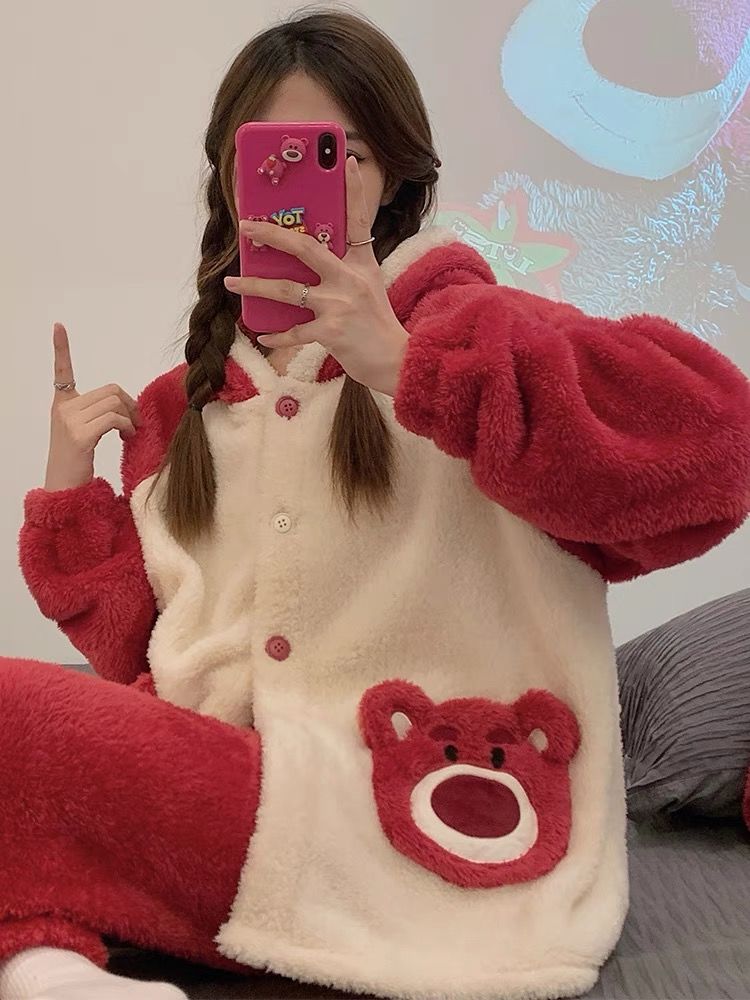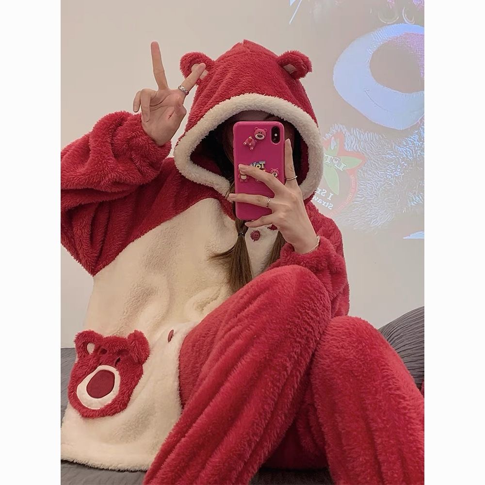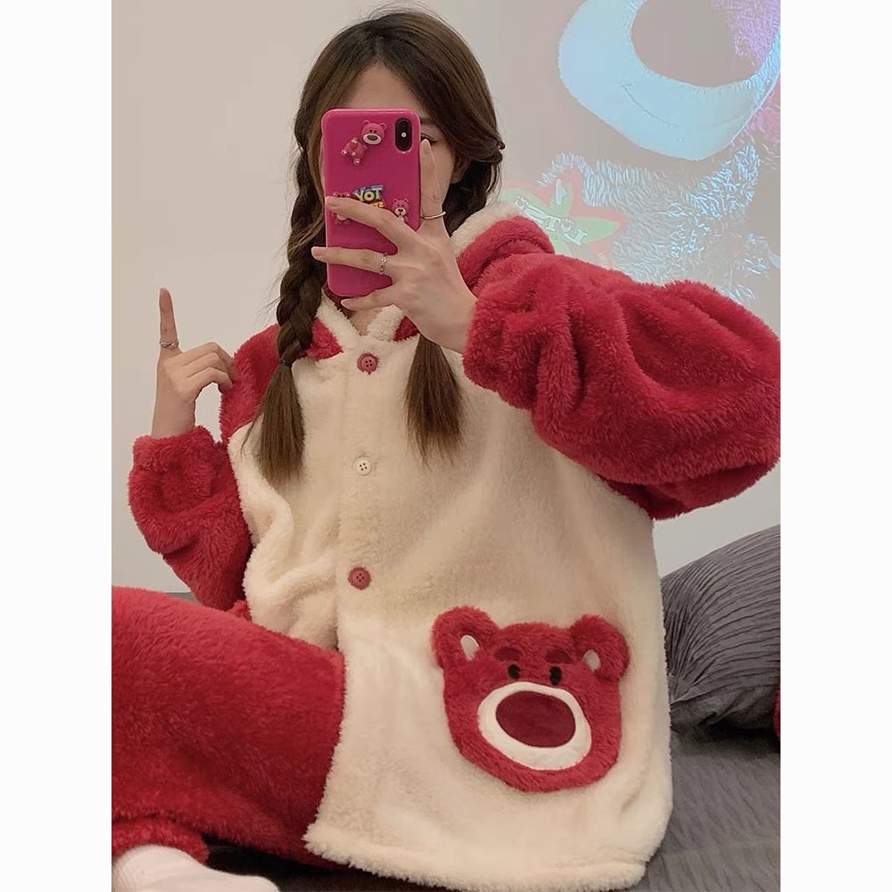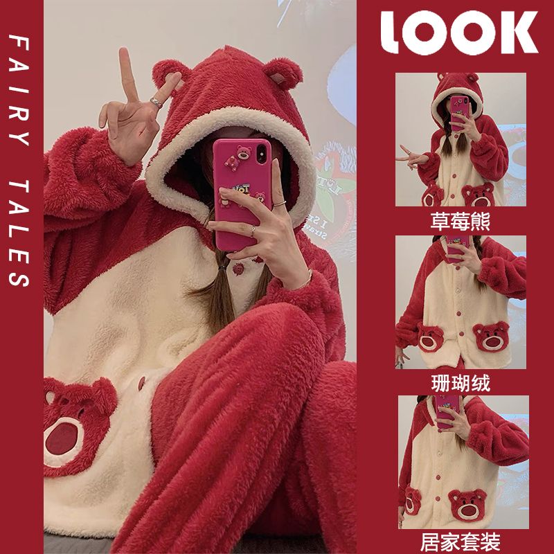 草莓熊珊瑚绒睡衣女冬季加绒加厚法兰绒连帽卡通秋冬款家居服套装