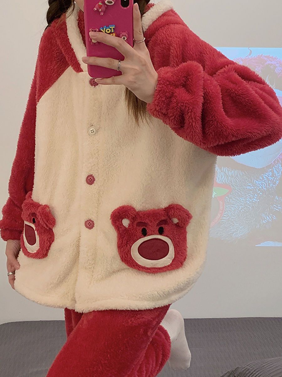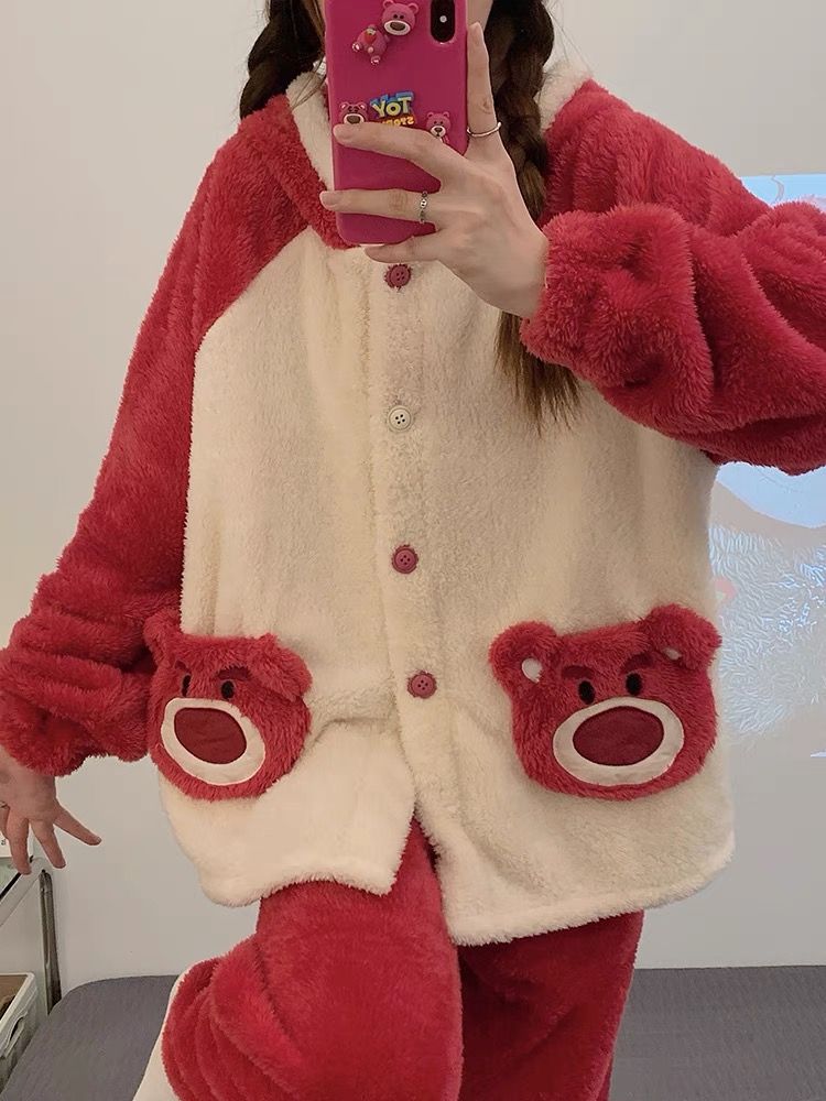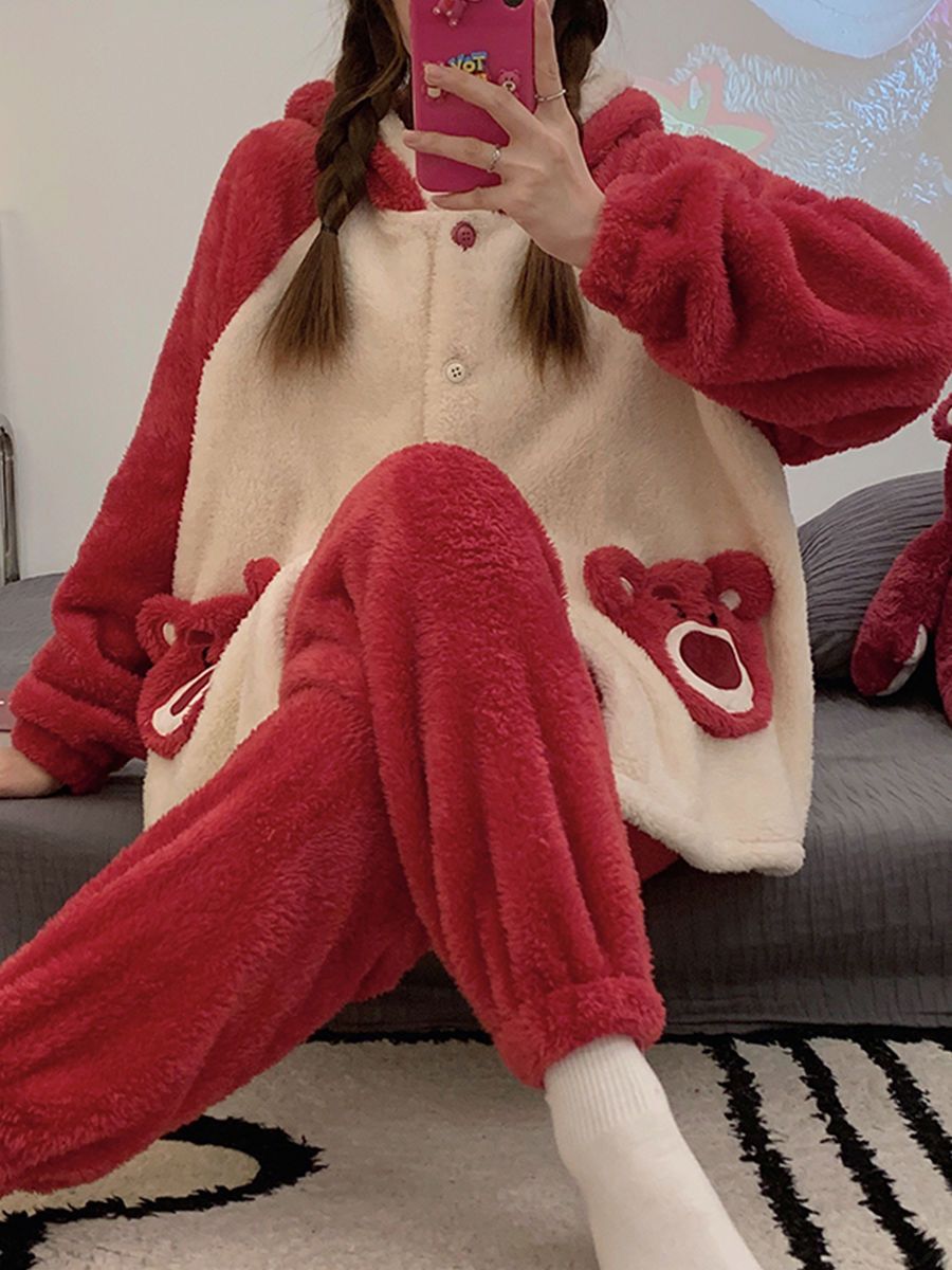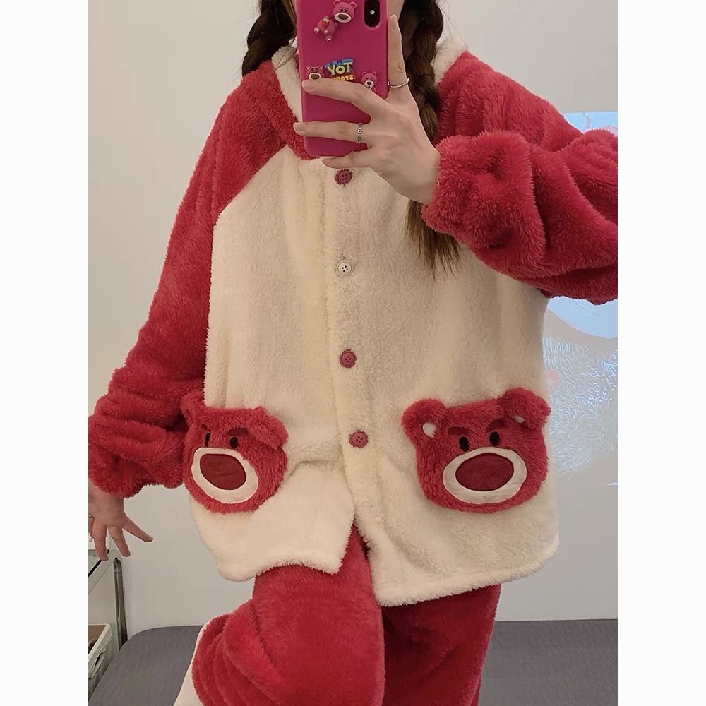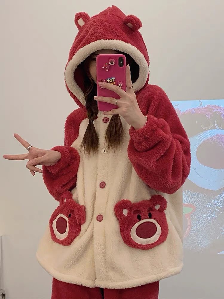 草莓熊珊瑚绒睡衣女冬季加绒加厚法兰绒连帽卡通秋冬款家居服套装