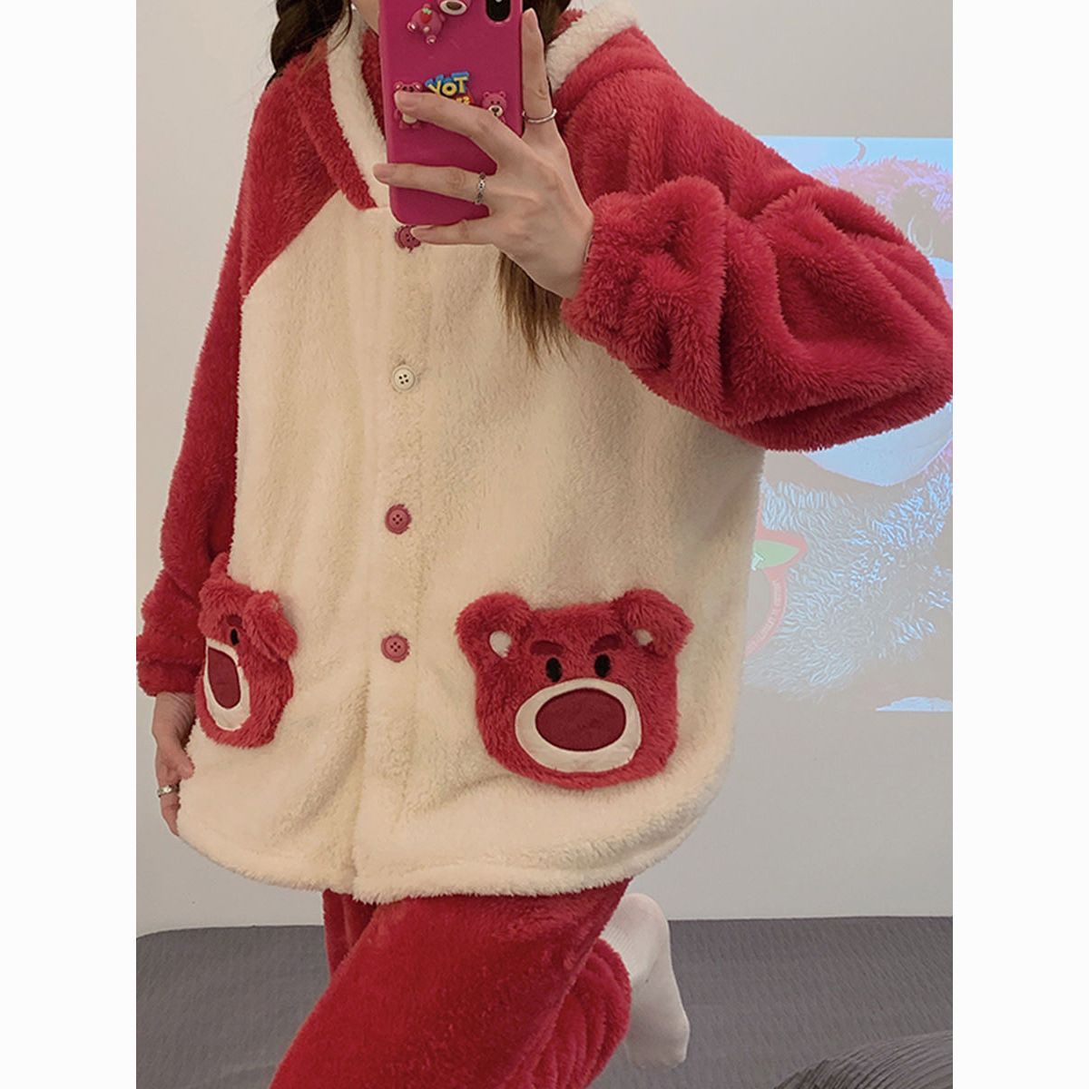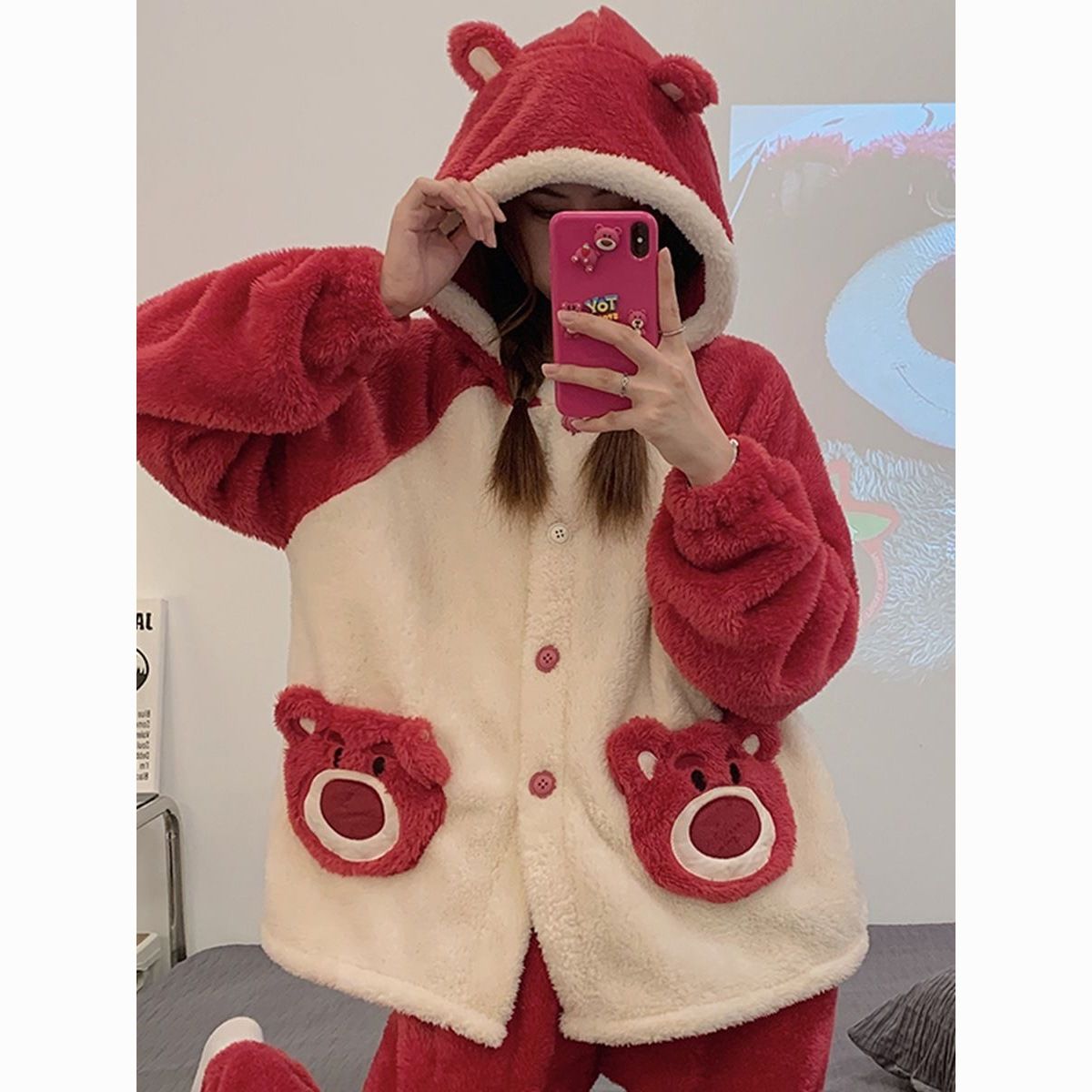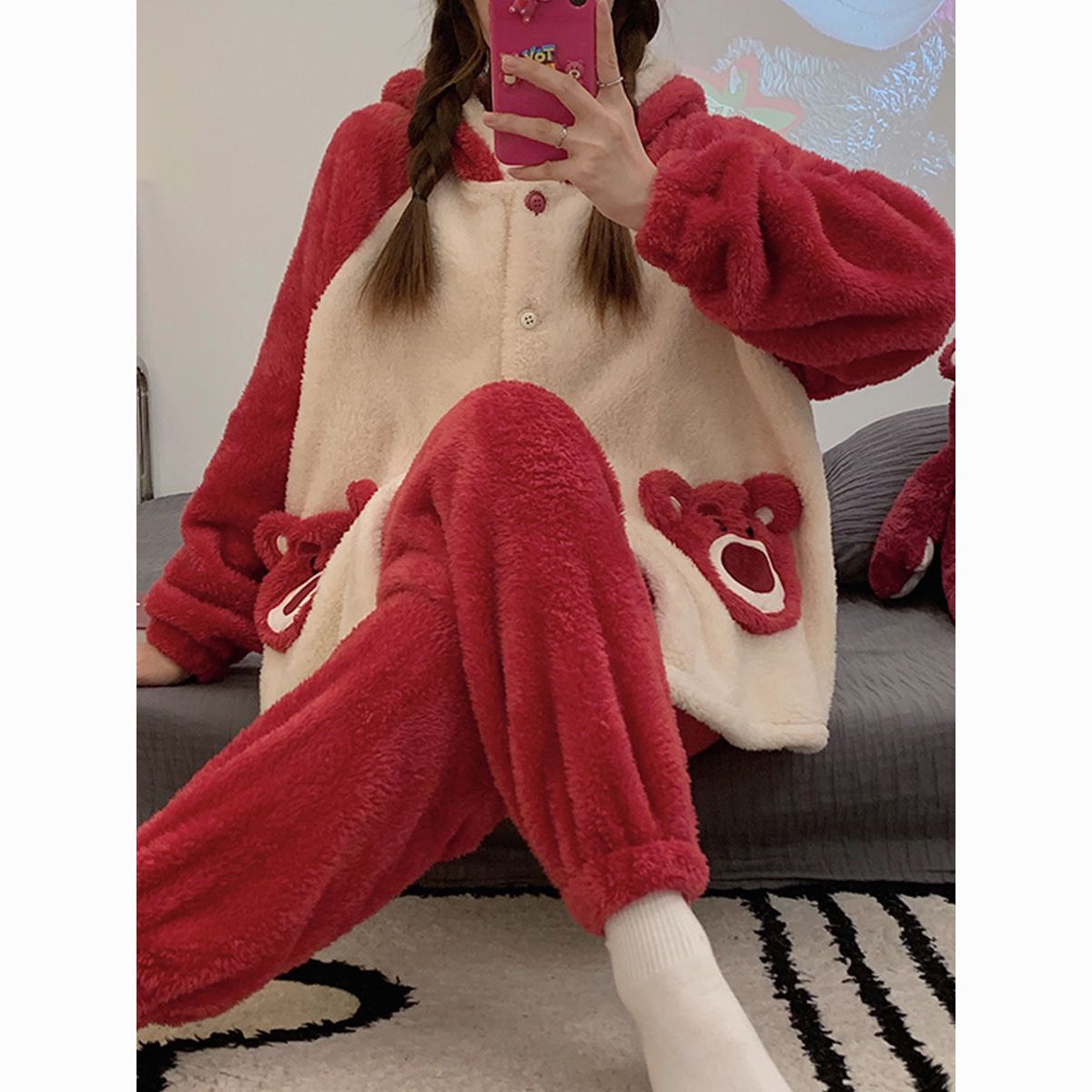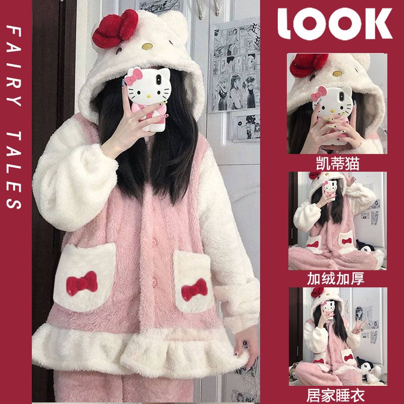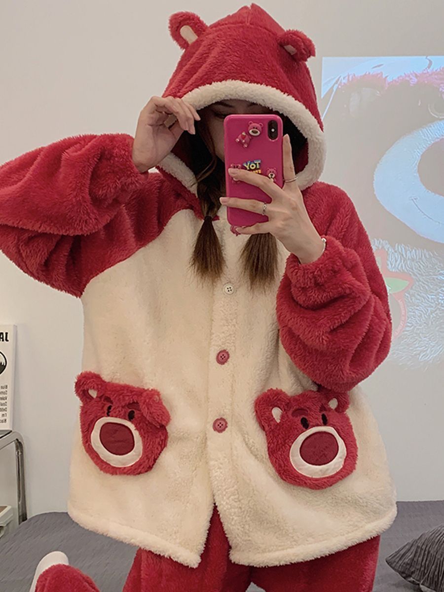 草莓熊珊瑚绒睡衣女冬季加绒加厚法兰绒连帽卡通秋冬款家居服套装