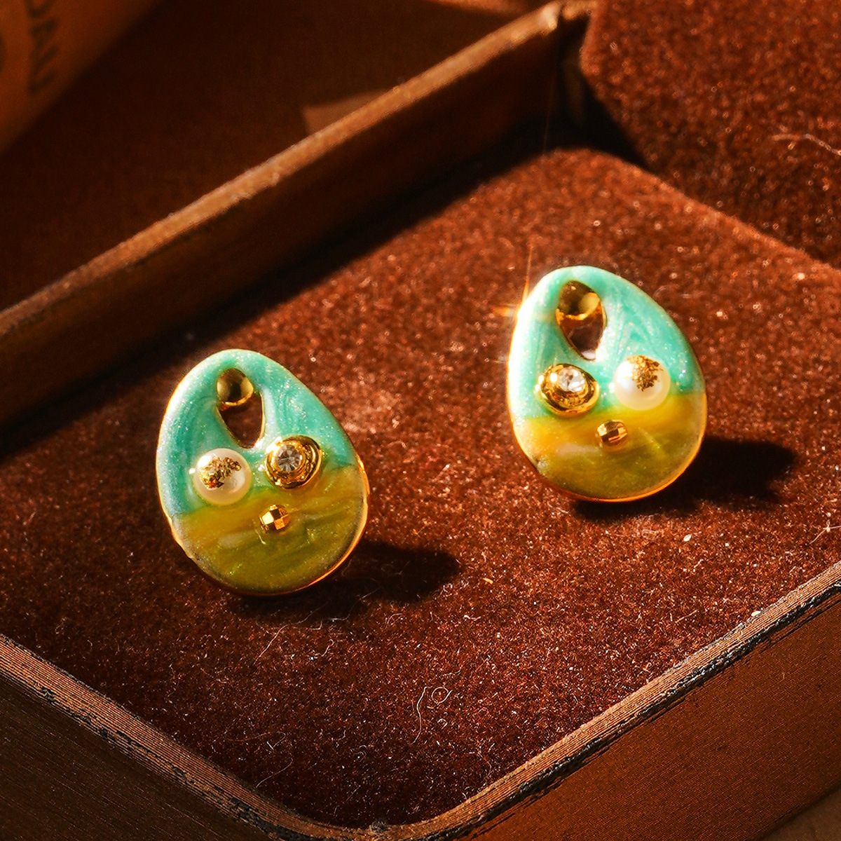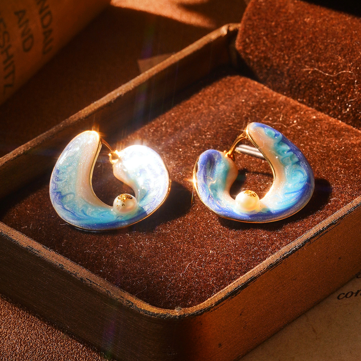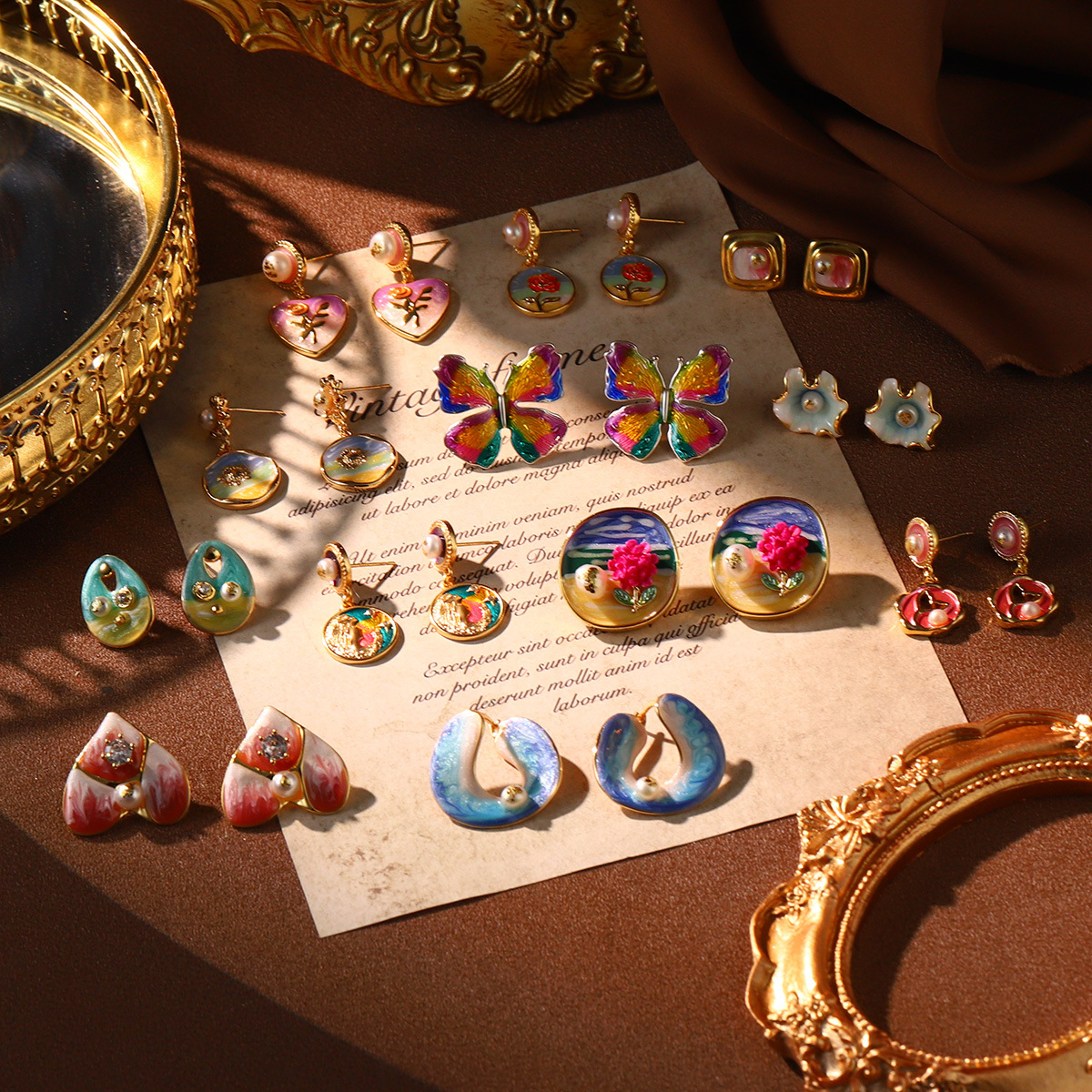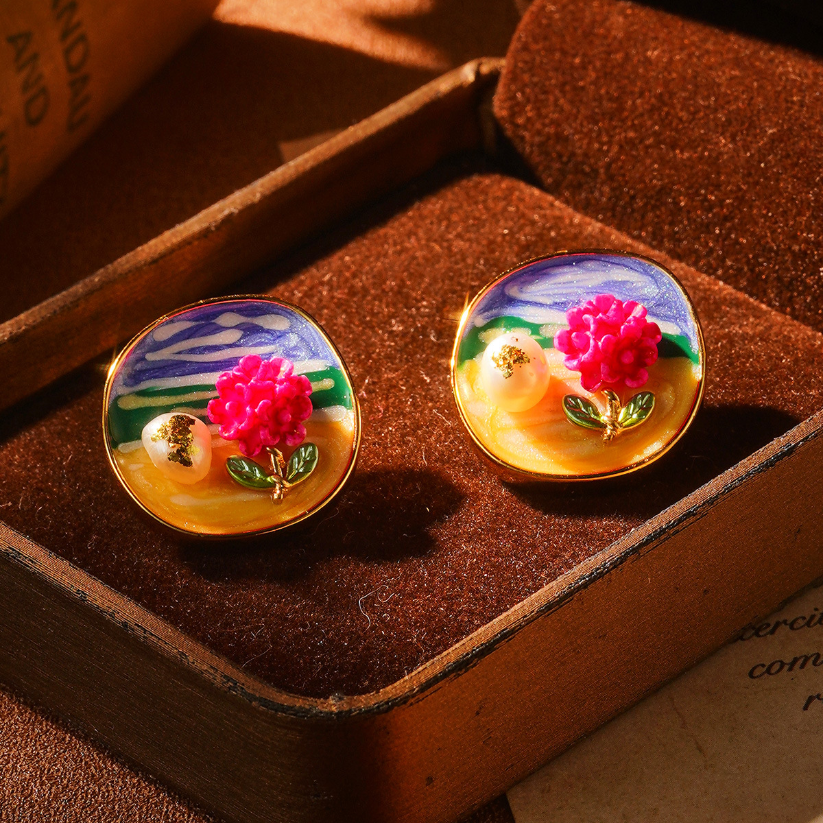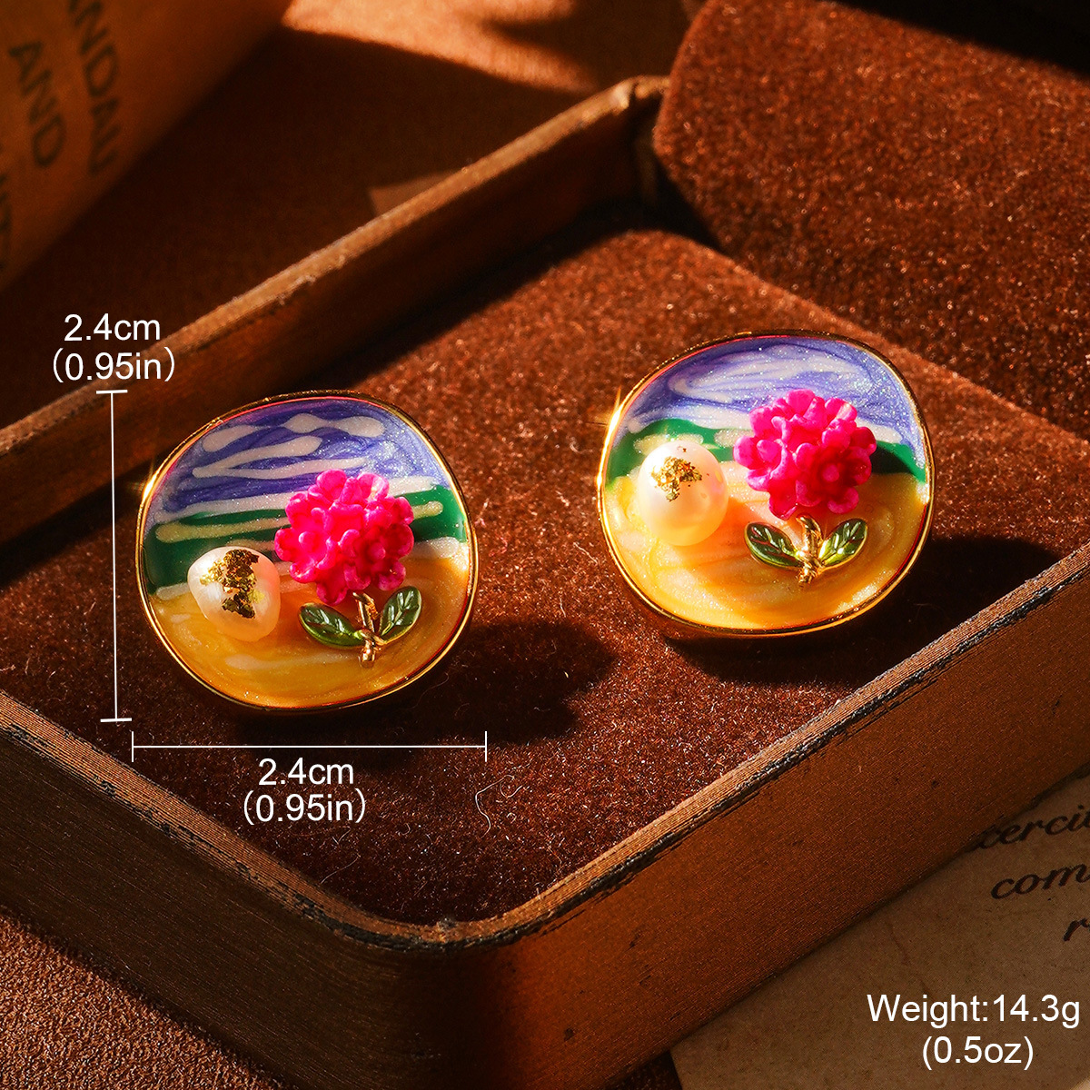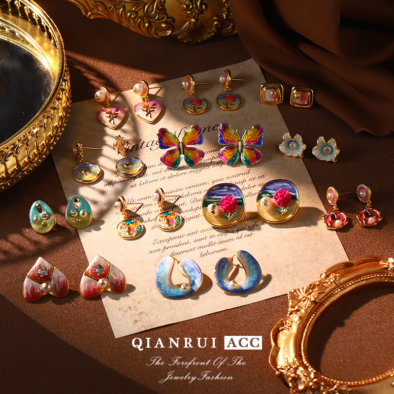 复古法式珐琅耳环小众高级油画系列天然珍珠耳钉小众银针耳饰批发
