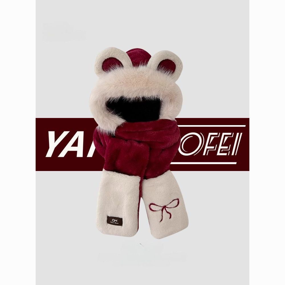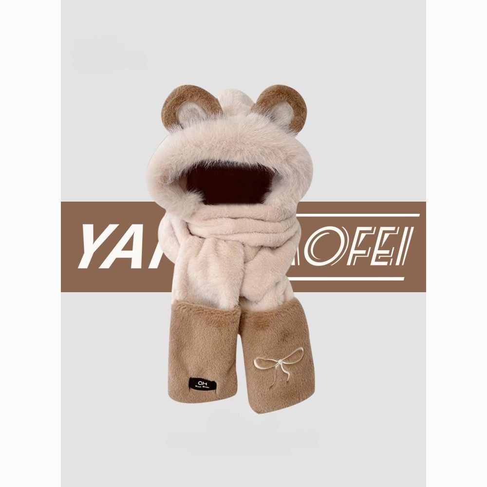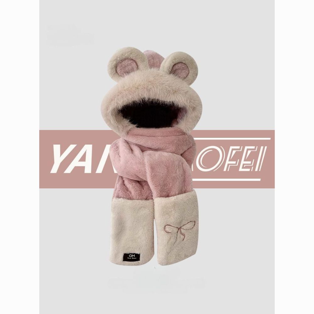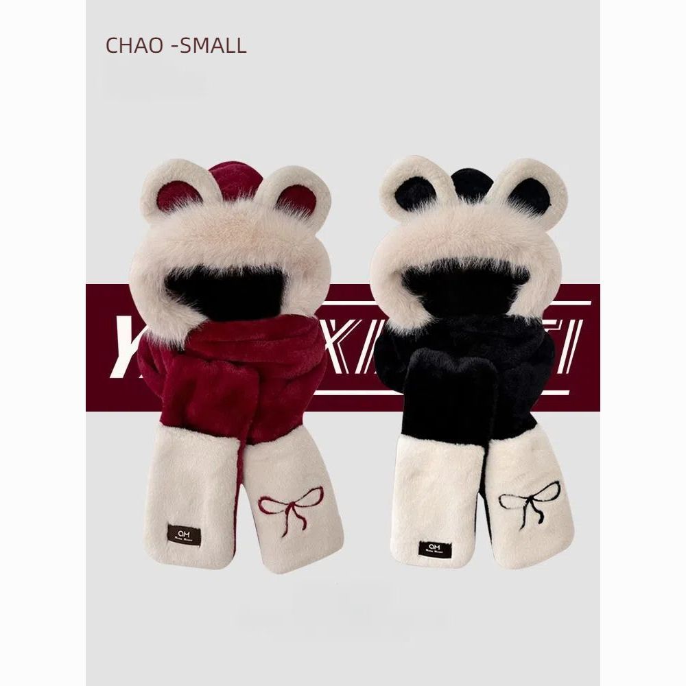 毛绒2024蝴蝶结保暖三件套冬季骑车围巾手套一体护耳雷锋帽子