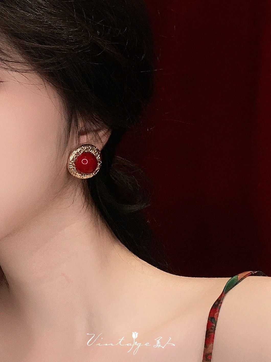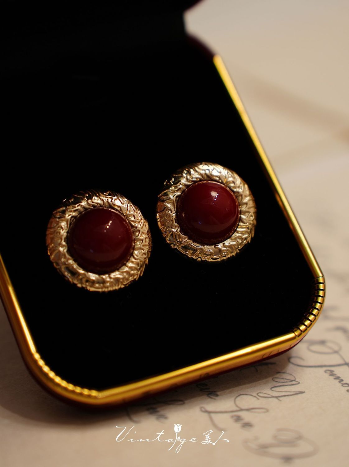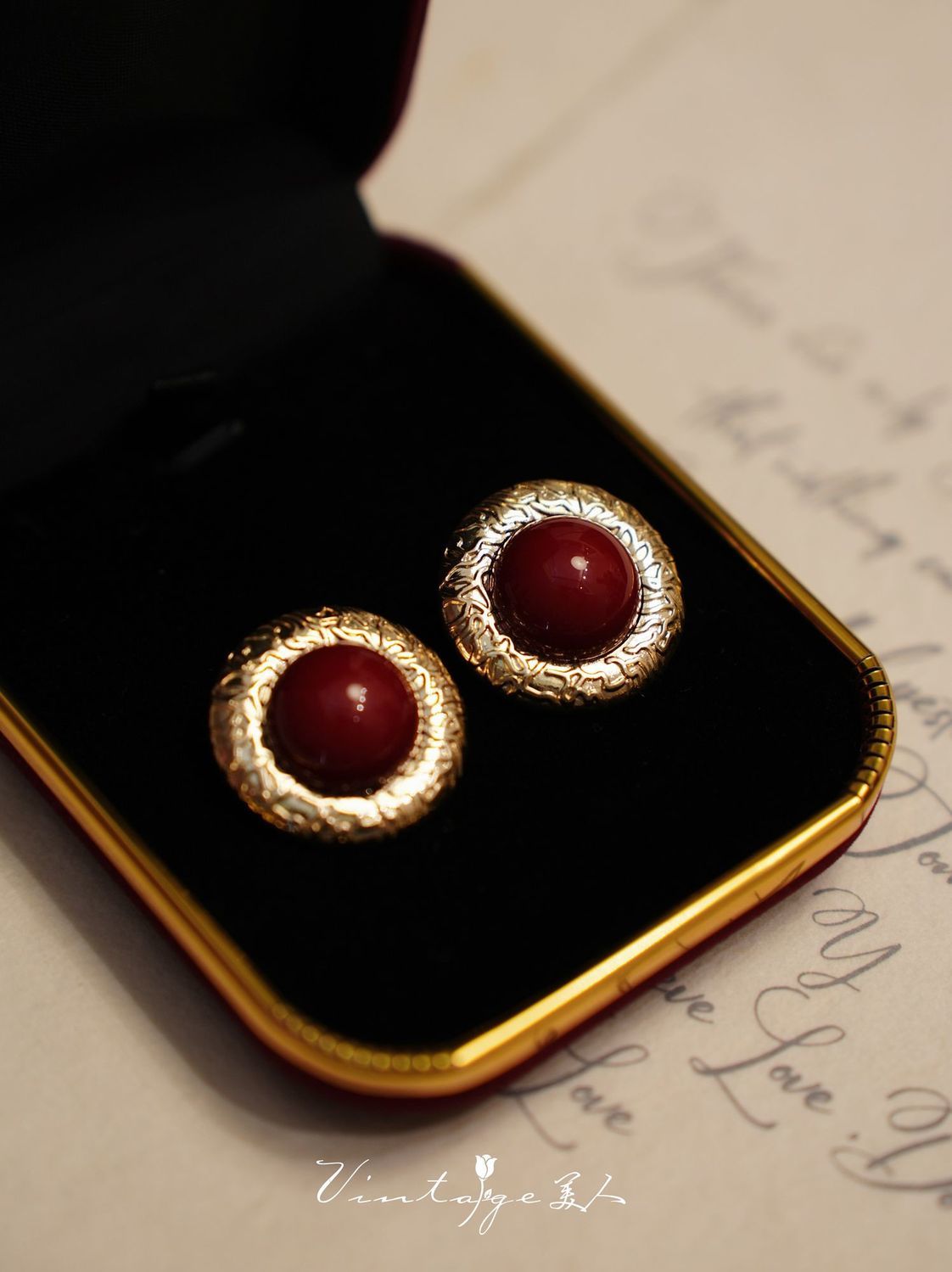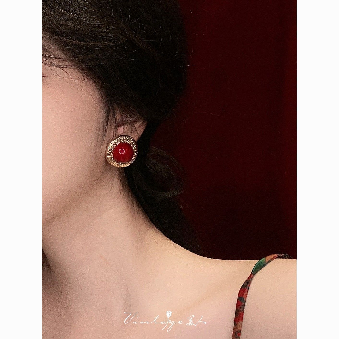 「曼斯菲尔德」复古法式高级感港风红色宝石中古耳钉新款耳饰