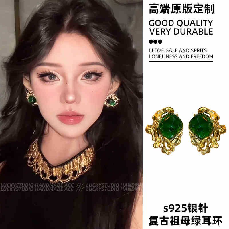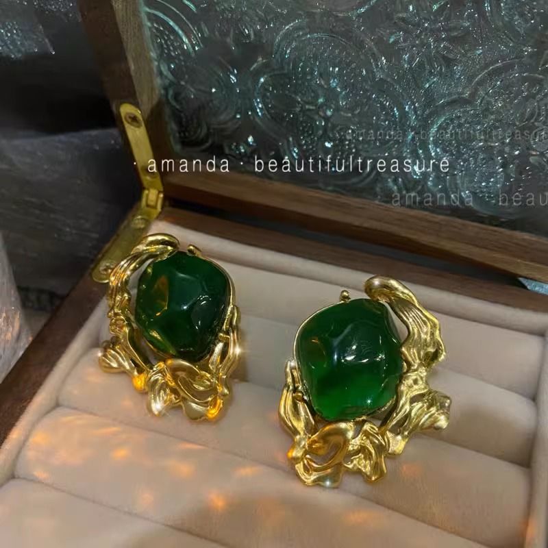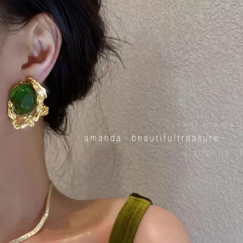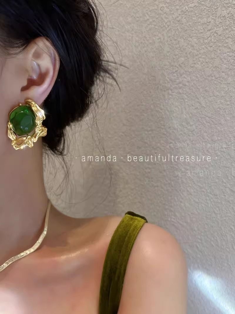 小众中古~夸张绿琉璃复古气质大耳环耳夹欧美法式奢华高级感耳饰