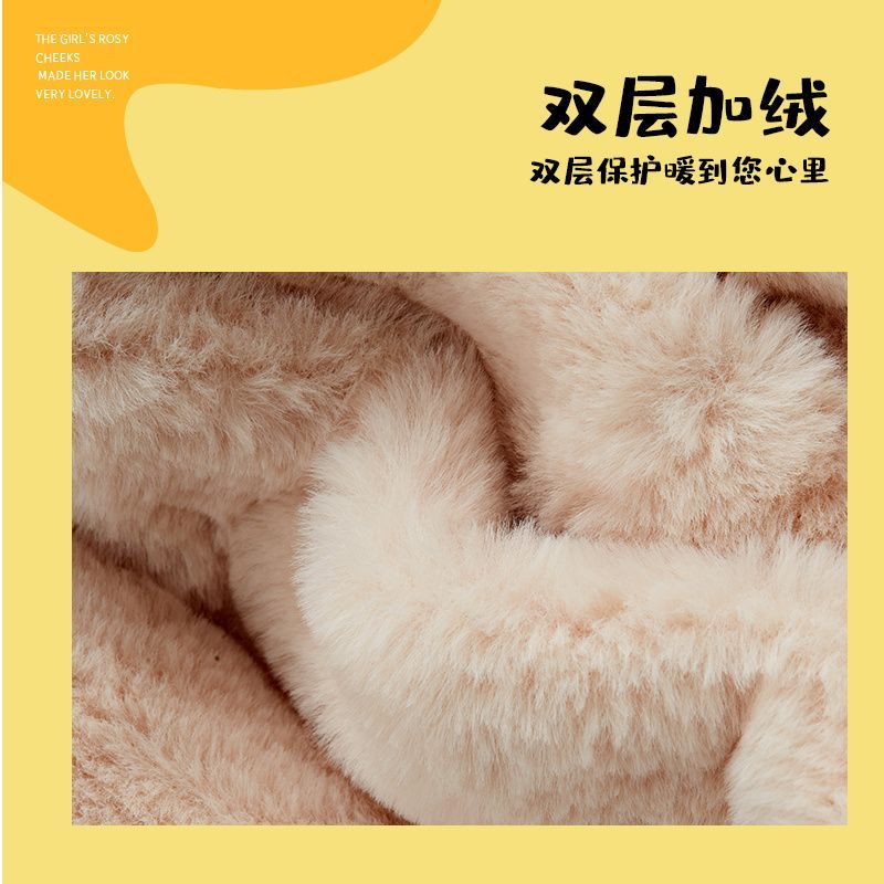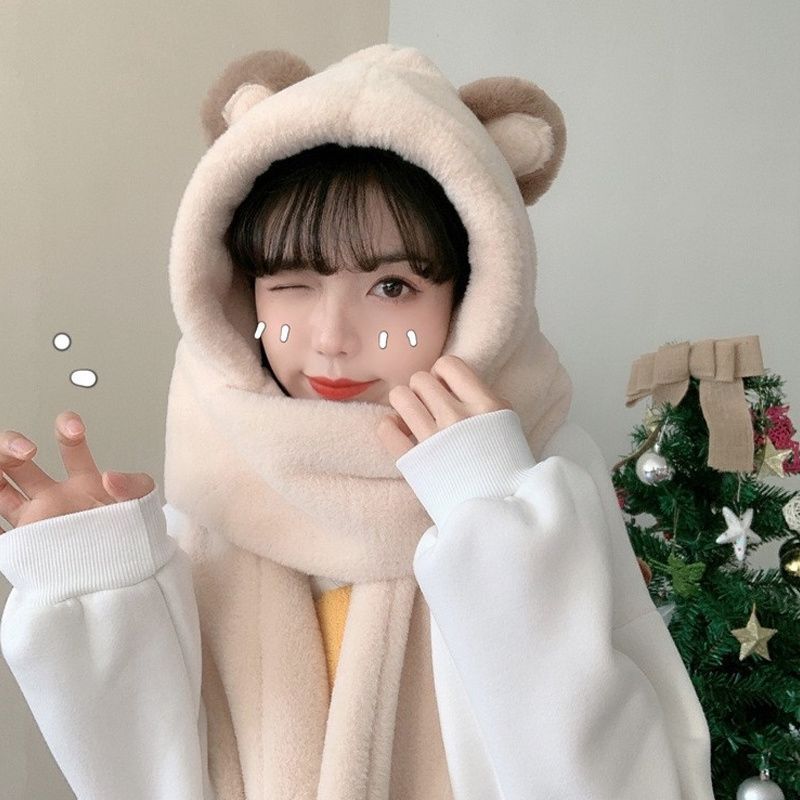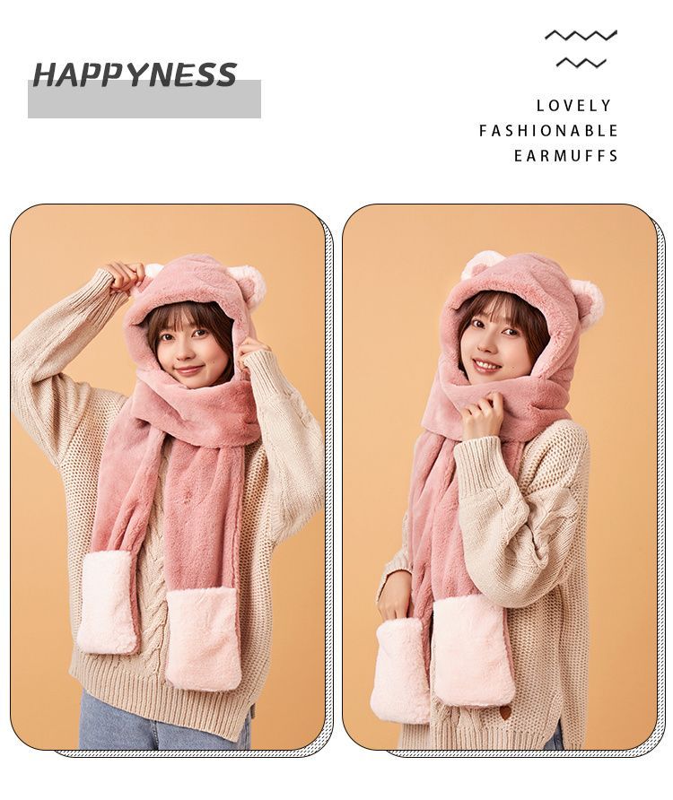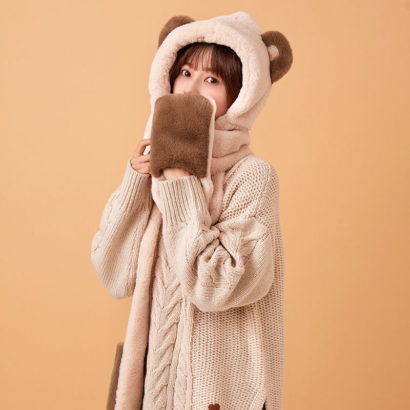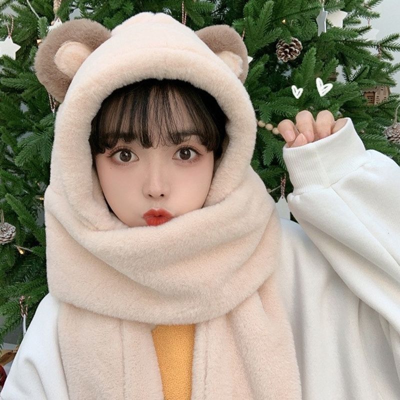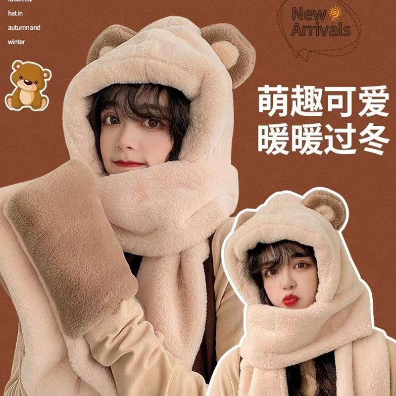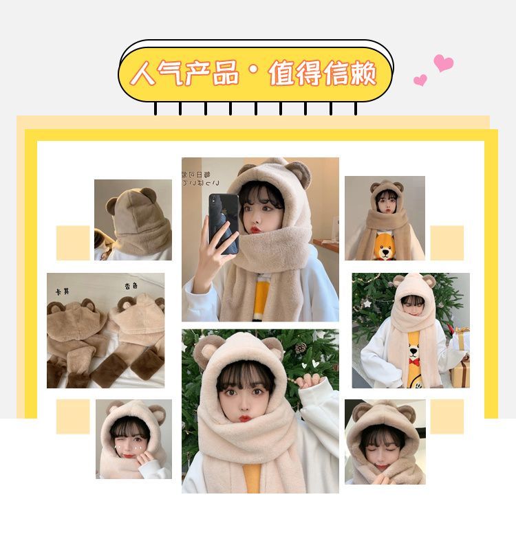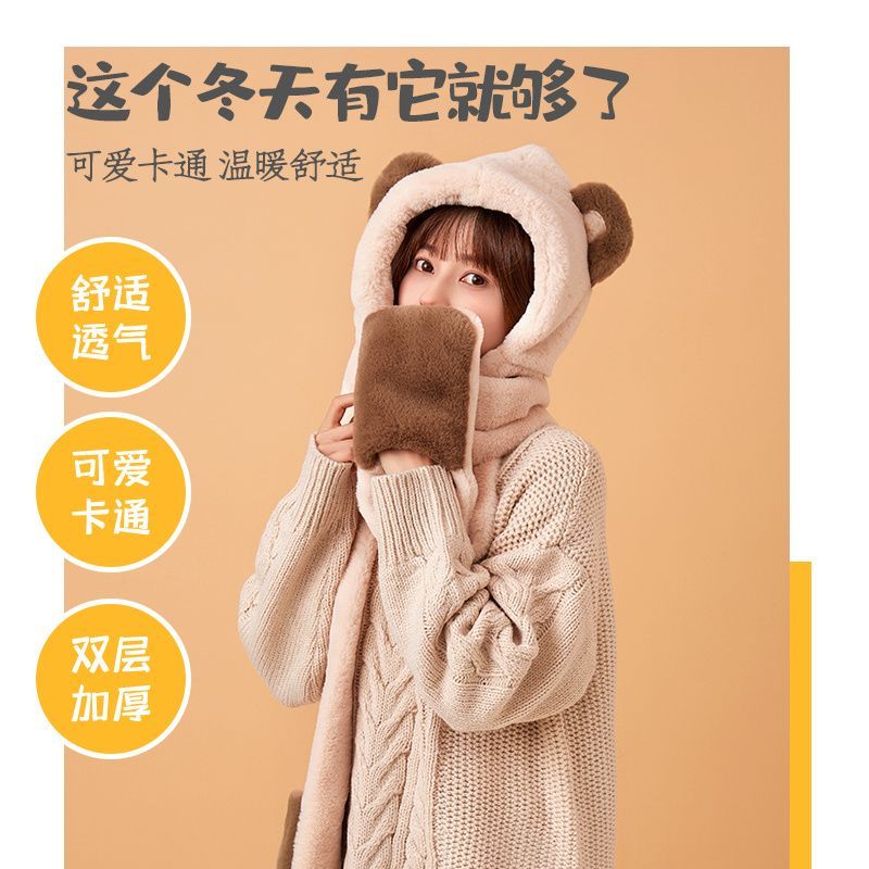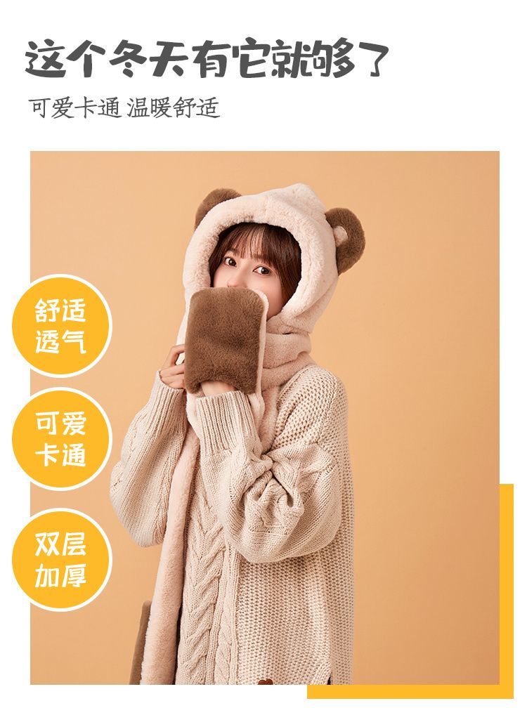 2024新款可爱帽子围巾一体女冬季连帽围脖加厚骑车保暖毛绒多件套