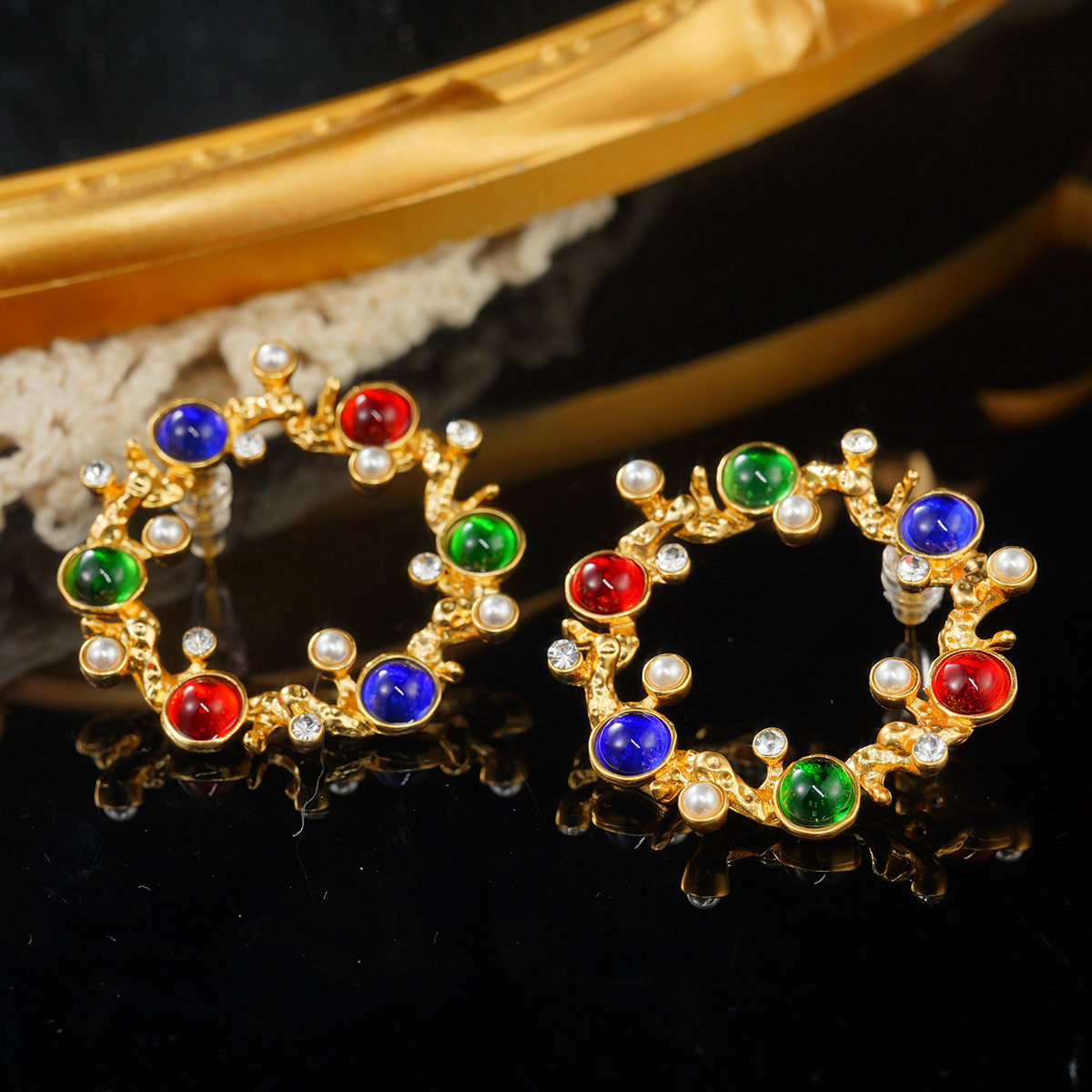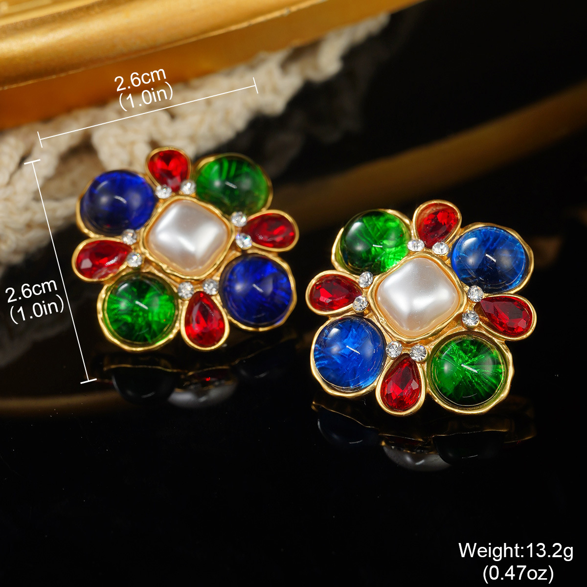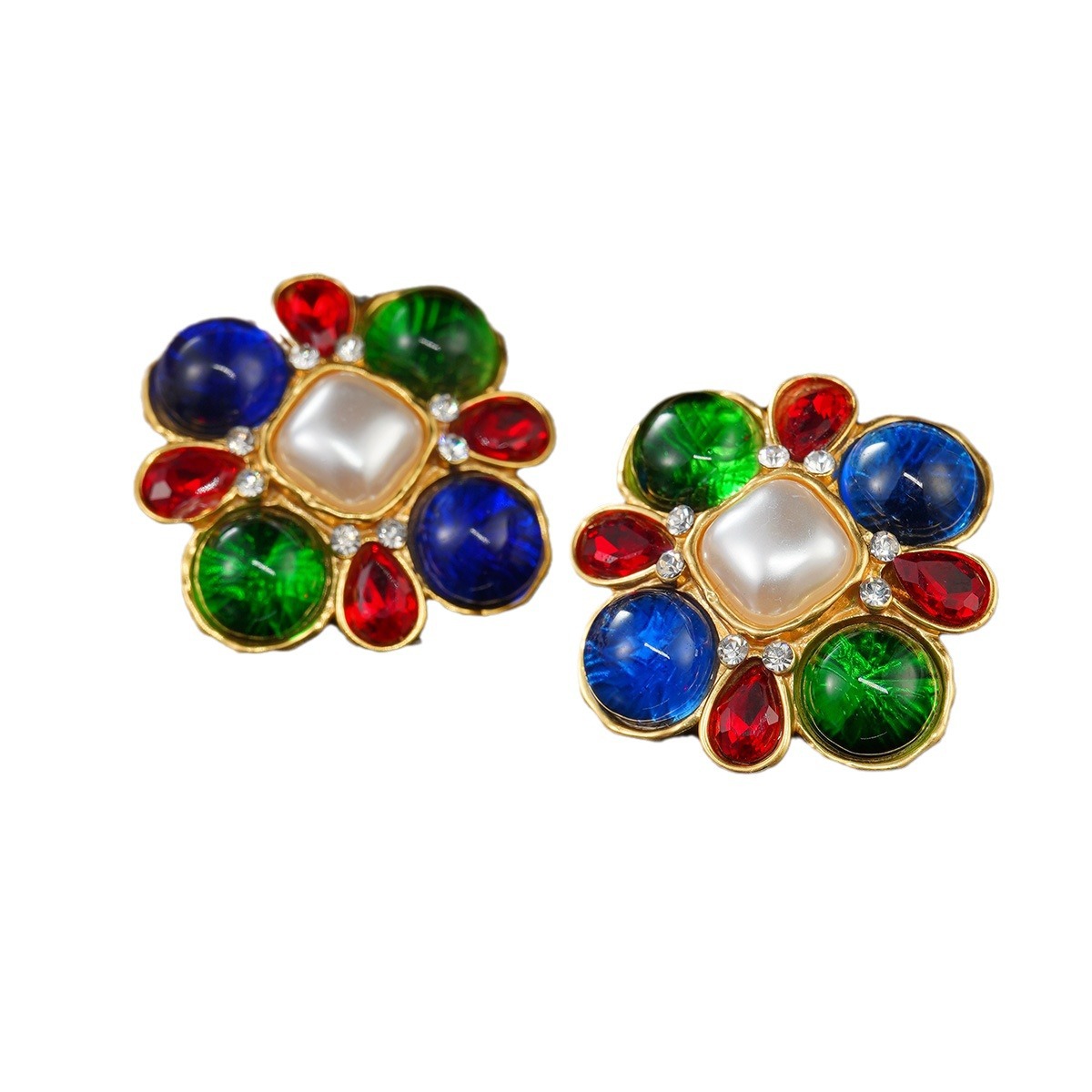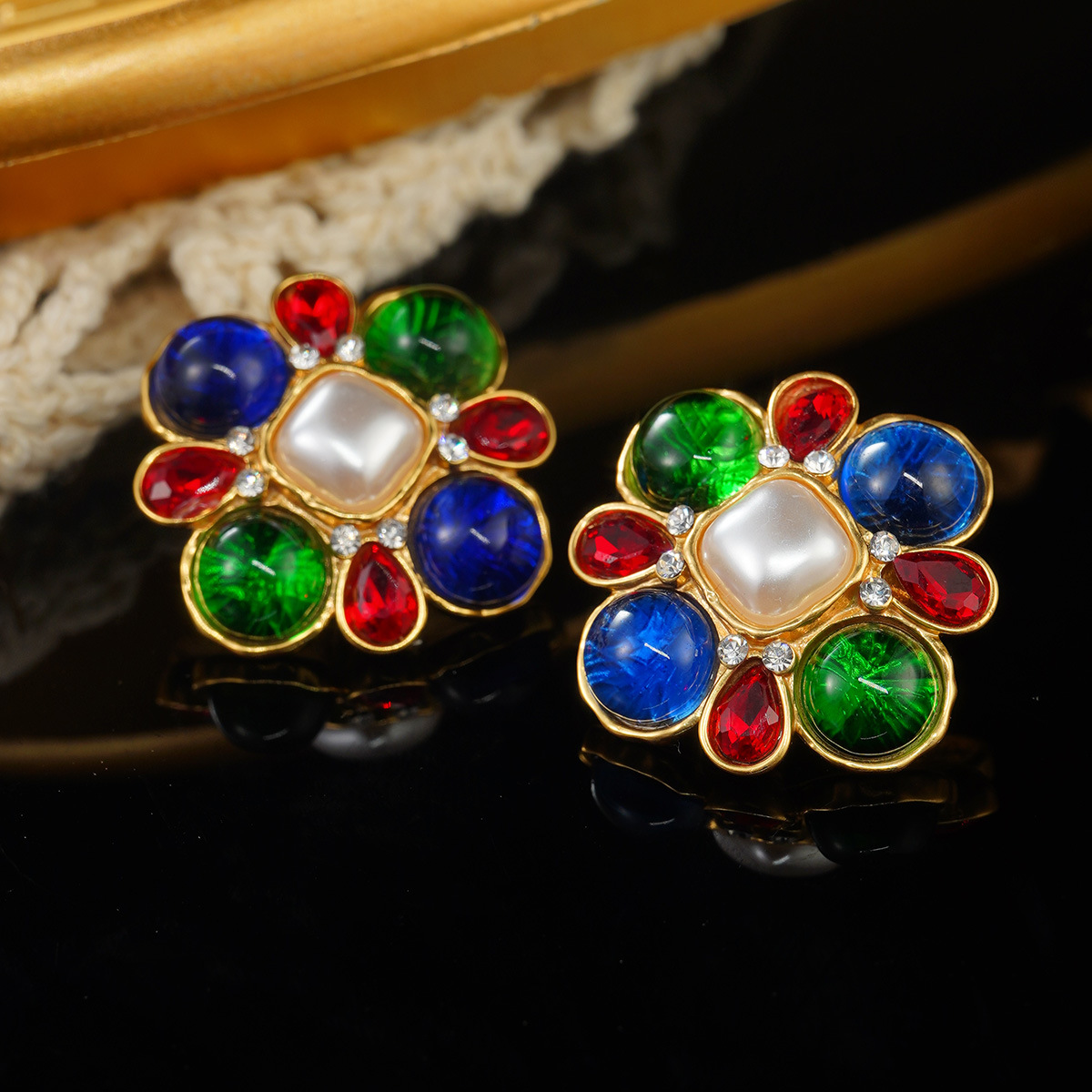 宫廷珐琅复古彩色中古vintage耳环珍珠镶钻耳饰几何高级百搭耳钉