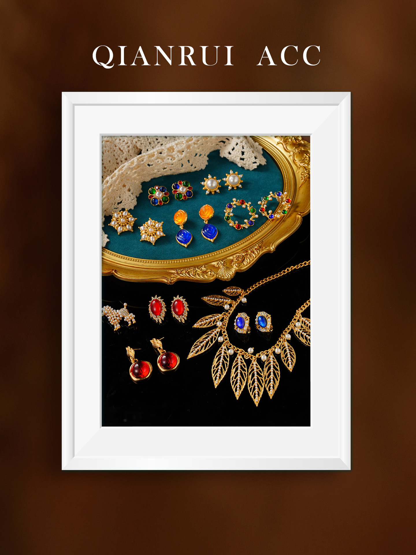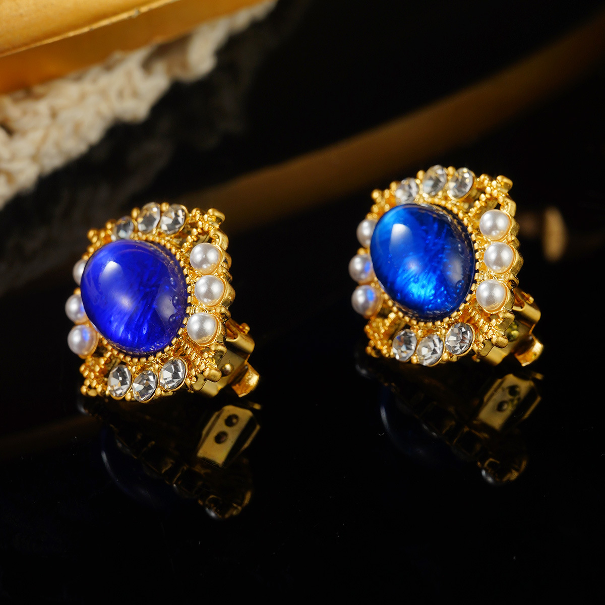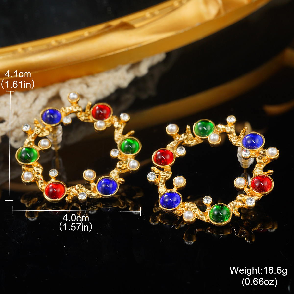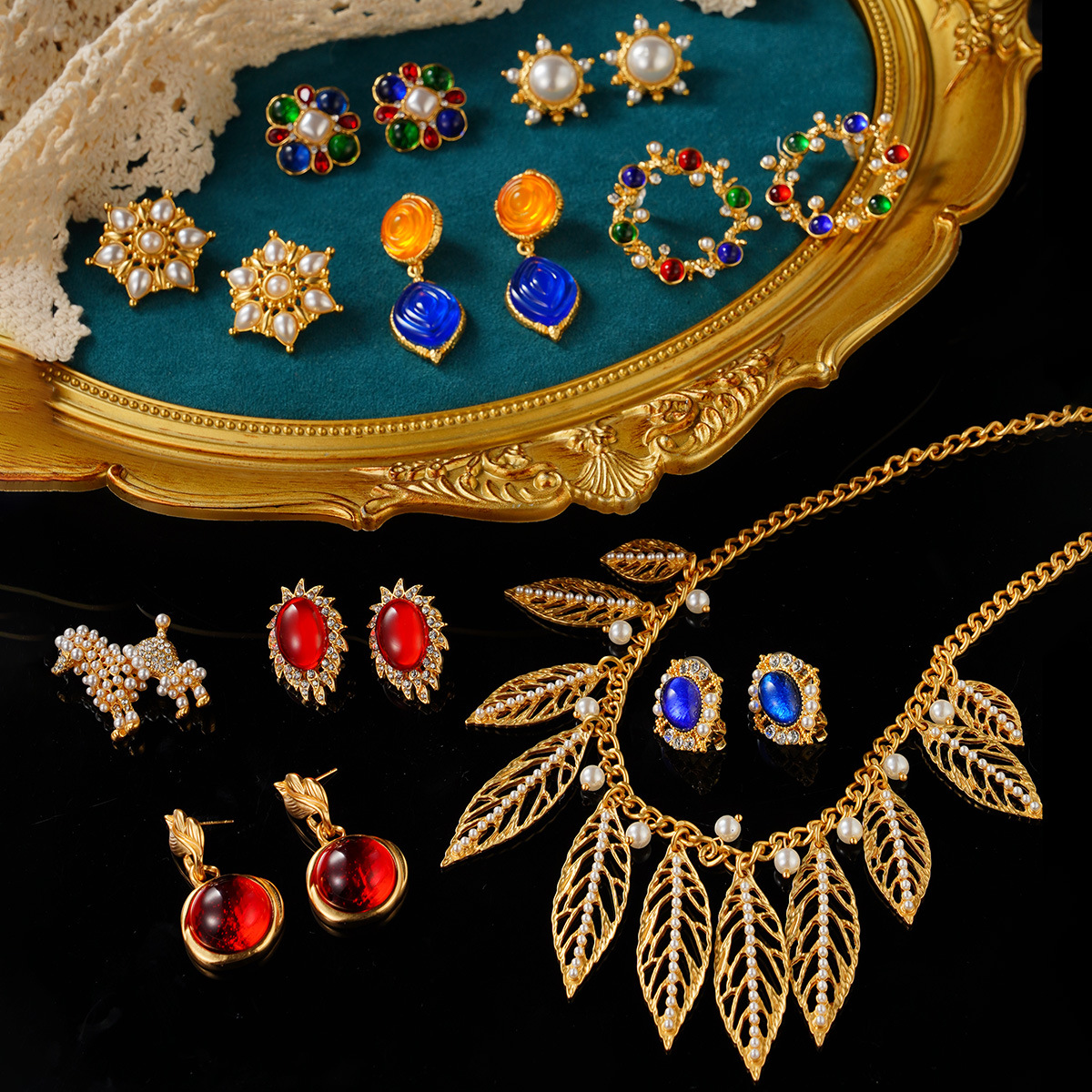 宫廷珐琅复古彩色中古vintage耳环珍珠镶钻耳饰几何高级百搭耳钉